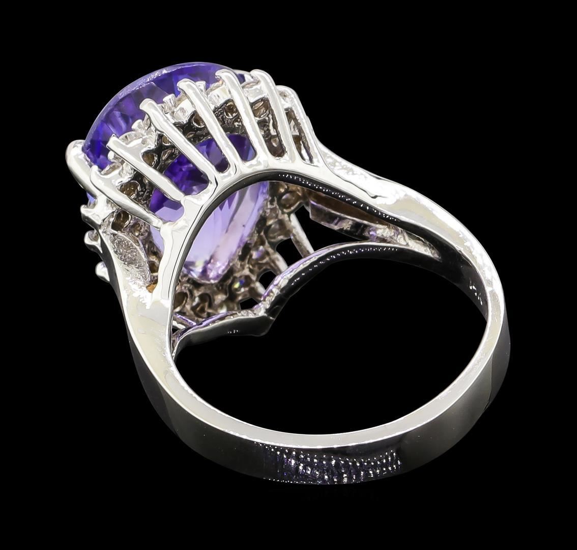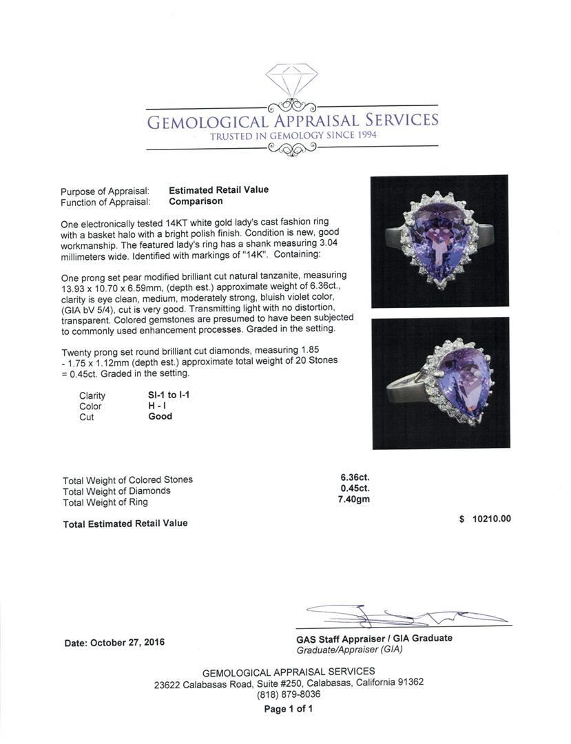 One electronically tested 14KT white gold lady's cast fashion ring with a basket halo with a bright polish finish. The featured lady's ring has a shank measuring 3.04 millimeters wide. Identified with markings of '14K'. Condition is new, good workmanship. Containing: One prong set pear modified brilliant cut natural tanzanite, measuring 13.93 x 10.70 x 6.59mm, (depth est.) approximate weight of 6.36ct., clarity is eye clean, medium, moderately strong, bluish violet color, (GIA bV 5/4), cut is very good. Transmitting light with no distortion, transparent. Colored gemstones are presumed to have been subjected to commonly used enhancement processes. Graded in the setting. Twenty prong set round brilliant cut diamonds, measuring 1.85 - 1.75 x 1.12mm (depth est.) approximate total weight of 20 Stones = 0.45ct. Graded in the setting. Clarity SI-1 to I-1. Color: H - I Cut Good. Total Weight of Colored Stones 6.36ct.. Total Weight of Diamonds 0.45ct.. Total Weight of Ring 7.40gm. GAS Appraised.