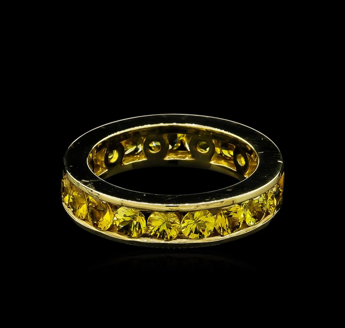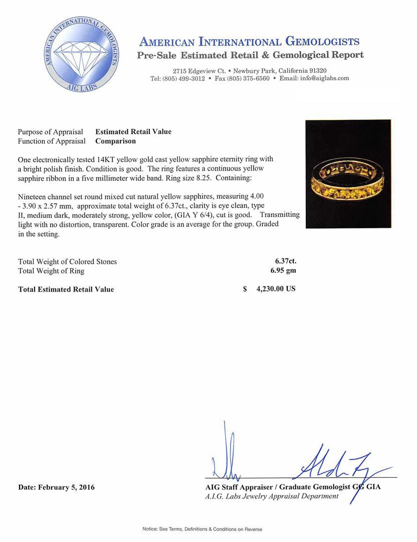 One electronically tested 14KT yellow gold cast yellow sapphire eternity ring with a bright polish finish. The ring features a continuous yellow sapphire ribbon in a five millimeter wide band. Ring size 8.25. Condition is good. Containing: Nineteen channel set round mixed cut natural yellow sapphires, measuring 4.00 - 3.90 x 2.57 mm, approximate total weight of 6.37ct., clarity is eye clean, type II, medium dark, moderately strong, yellow color, (GIA Y 6/4), cut is good. Transmitting light with no distortion, transparent. Color grade is an average for the group. Graded in the setting. Total Weight of Colored Stones 6.37ct. Total Weight of Ring 6.95gm. AIG Appraised at $4,230.00.