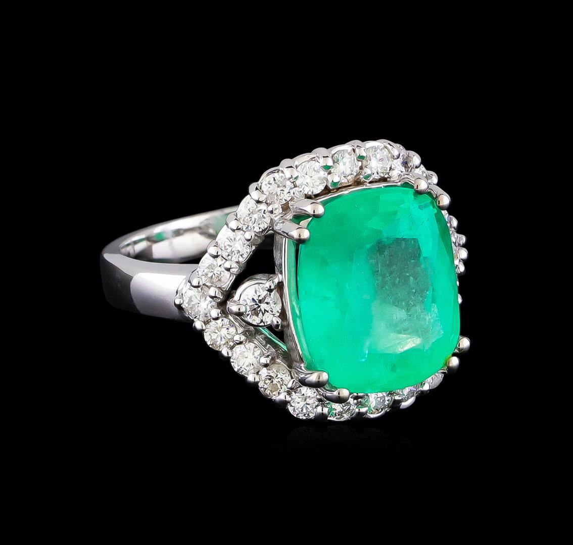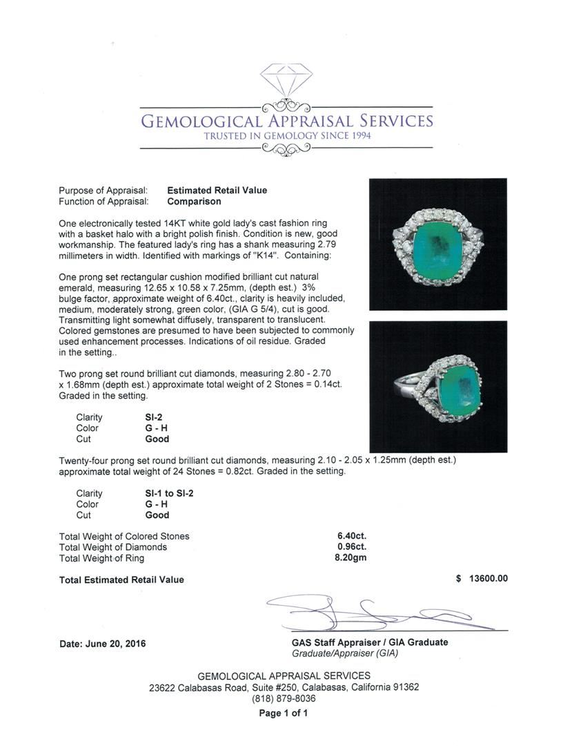 One electronically tested 14KT white gold lady's cast fashion ring with a basket halo with a bright polish finish. The featured lady's ring has a shank measuring 2.79 millimeters in width. Identified with markings of "K14". Condition is new, good workmanship. Containing: One prong set rectangular cushion modified brilliant cut natural emerald, measuring 12.65 x 10.58 x 7.25mm, (depth est.) 3%. bulge factor, approximate weight of 6.40ct., clarity is heavily included, medium, moderately strong, green color, (GIA G 5/4), cut is good. Transmitting light somewhat diffusely, transparent to translucent. Colored gemstones are presumed to have been subjected to commonly used enhancement processes. Indications of oil residue. Graded in the setting. Two prong set round brilliant cut diamonds, measuring 2.80 - 2.70 x 1.68mm (depth est.) approximate total weight of 2 Stones = 0.14ct. Graded in the setting. Clarity: SI-2. Color: G - Good Twenty-Four prong set round brilliant cut diamonds, measuring 2.10 - 2.05 x 1.25mm (depth est.) approximate total weight of 24 Stones = 0.82ct. Graded in the setting. Clarity: SI-1 to SI-2. Color: G - Good. Total Weight of Colored Stones 6.40ct. Total Weight of Diamonds 0.96ct. Total Weight of Ring 8.20gm GAS Appraised at $13,600.00.