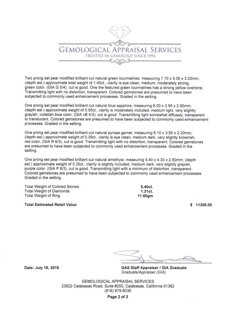 One electronically tested 14KT white and yellow gold lady's cast fashion ring with a bright polish finish. The featured lady's ring has a shank measuring 3.15 millimeters wide. Identified with markings of '14K'. Condition is new, good workmanship. Containing: One prong set pear modified brilliant cut natural tanzanite, measuring 11.15 x 8.25 x 5.18mm, (depth est.) approximate weight of 2.80ct., clarity is eye clean, medium dark, moderately strong, violetish blue color, (GIA vB 6/4), cut is very good. Transmitting light with no distortion, transparent. Colored gemstones are presumed to have been subjected to commonly used enhancement processes. Graded in the setting. Two prong set round brilliant cut diamonds, measuring 1.90 - 1.80 x 1.15mm (depth est.) approximate total weight of 2 Stones = 0.05ct. Graded in the setting. Clarity SI-1 to SI-2. Color: H - I Cut Good Forty prong set round brilliant cut diamonds, measuring 1.55 - 1.45 x 0.93mm (depth est.) approximate total weight of 40 Stones = 0.51ct. Graded in the setting. Clarity SI-1 to SI-2. Color: H - I Cut Good One Hundred Fifteen prong set round brilliant cut diamonds, measuring 1.25 - 1.15 x 0.74mm (depth est.) approximate total weight of 115 Stones = 0.75ct. Graded in the setting. Clarity SI-1 to SI-2. Color: H - I Cut Good One prong set pear modified brilliant cut natural pink tourmaline, measuring 7.90 x 5.90 x 3.20mm, (depth est.) approximate weight of 0.91ct., clarity is moderately included, medium light, moderately strong, slightly purplish red color, (GIA slpR 4/4), cut is good. Transmitting light somewhat diffusely, transparent to translucent. Colored gemstones are presumed to have been subjected to commonly used enhancement processes. Graded in the setting. Two prong set pear modified brilliant cut natural green tourmalines, measuring 7.10 x 5.05 x 3.20mm, (depth est.) approximate total weight of 1.40ct., clarity is eye clean, medium, moderately strong, green color, (GIA G 5/4), cut is good. One the featured green tourmalines has a strong yellow overtone. Transmitting light with no distortion, transparent. Colored gemstones are presumed to have been subjected to commonly used enhancement processes. Graded in the setting. One prong set pear modified brilliant cut natural blue sapphire, measuring 6.00 x 3.95 x 2.90mm, (depth est.) approximate weight of 0.55ct., clarity is moderately included, medium light, very slightly grayish, violetish blue color, (GIA vB 4/3), cut is good. Transmitting light somewhat diffusely, transparent to translucent. Colored gemstones are presumed to have been subjected to commonly used enhancement processes. Graded in the setting. One prong set pear modified brilliant cut natural pyrope garnet, measuring 6.10 x 3.90 x 2.20mm, (depth est.) approximate weight of 0.39ct., clarity is eye clean, medium dark, very slightly brownish, red color, (GIA R 6/3), cut is good. Transmitting light with no distortion, transparent. Colored gemstones are presumed to have been subjected to commonly used enhancement processes. Graded in the setting. One prong set pear modified brilliant cut natural amethyst, measuring 5.40 x 4.30 x 2.80mm, (depth est.) approximate weight of 0.35ct., clarity is slightly included, medium dark, very slightly grayish, purple color, (GIA P 6/3), cut is good. Transmitting light with a minimum of distortion, transparent. Colored gemstones are presumed to have been subjected to commonly used enhancement processes. Graded in the setting. Total Weight of Colored Stones 6.40ct.. Total Weight of Diamonds 1.31ct.. Total Weight of Ring 11.60gm. GAS Appraised at $11,305.00.