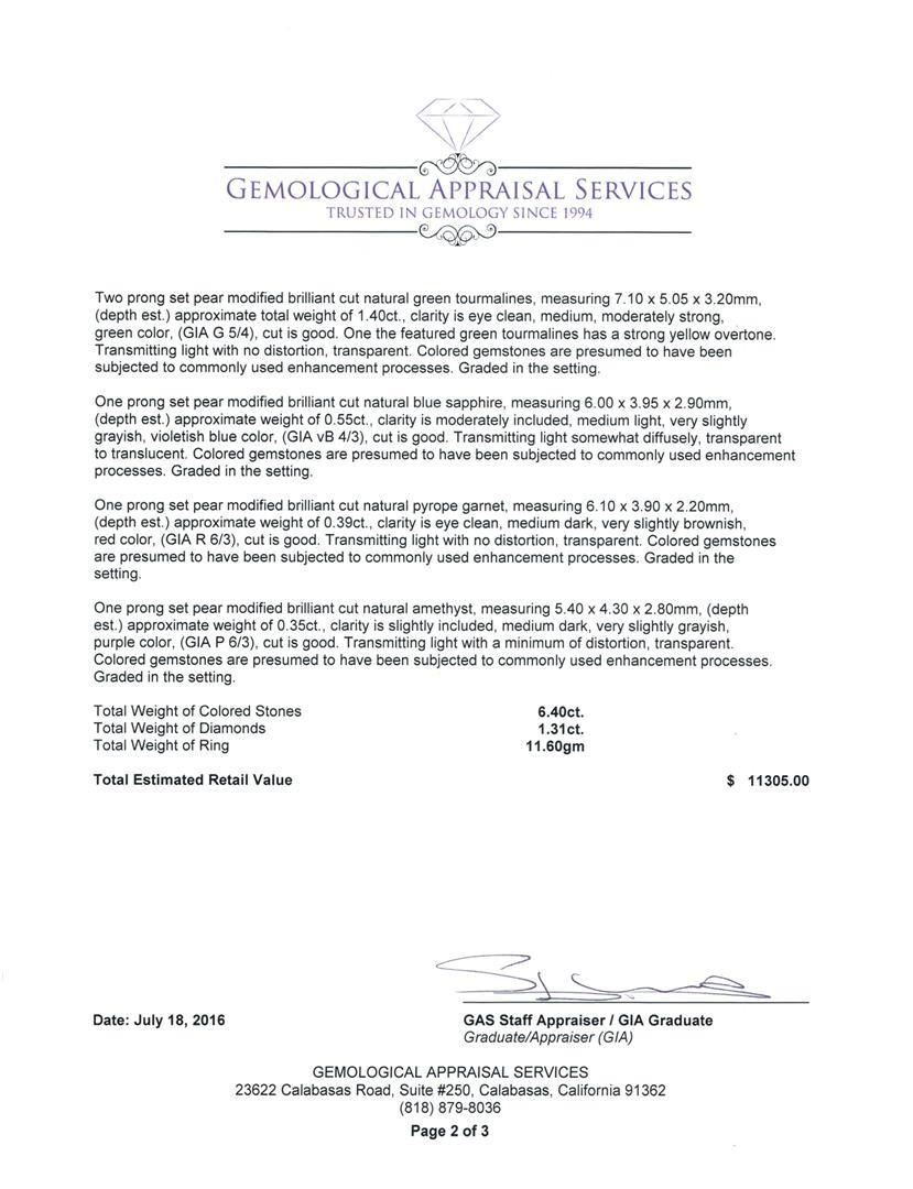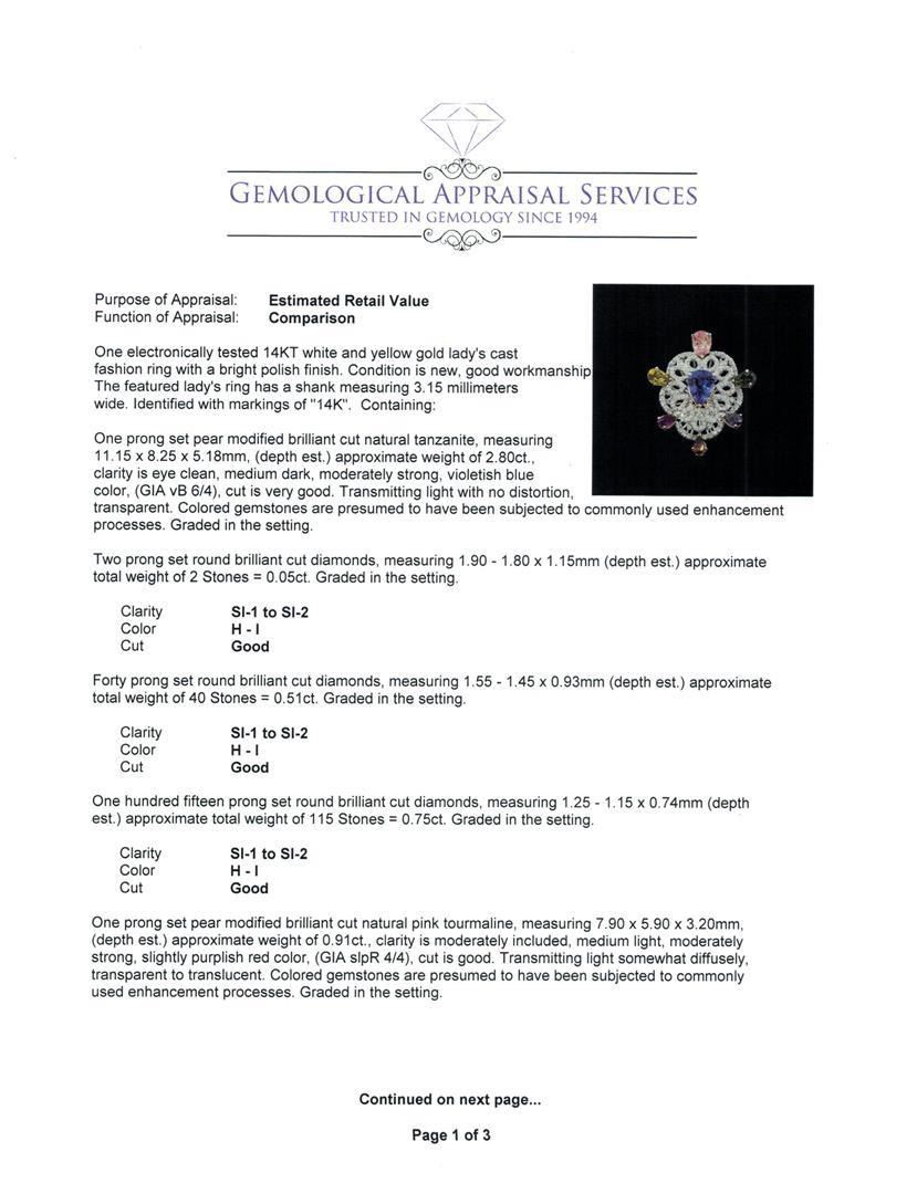 One electronically tested 14KT white and yellow gold lady's cast fashion ring with a bright polish finish. The featured lady's ring has a shank measuring 3.15 millimeters wide. Identified with markings of '14K'. Condition is new, good workmanship. Containing: One prong set pear modified brilliant cut natural tanzanite, measuring 11.15 x 8.25 x 5.18mm, (depth est.) approximate weight of 2.80 ct., clarity is eye clean, medium dark, moderately strong, violetish blue color, (GIA vB 6/4), cut is very good. Transmitting light with no distortion, transparent. Colored gemstones are presumed to have been subjected to commonly used enhancement processes. Graded in the setting. Two prong set round brilliant cut diamonds, measuring 1.90 - 1.80 x 1.15mm (depth est.) approximate total weight of 2 Stones = 0.05ct. Graded in the setting. Clarity SI-1 to SI-2. Color: H - I Cut Good Forty prong set round brilliant cut diamonds, measuring 1.55 - 1.45 x 0.93mm (depth est.) approximate total weight of 40 Stones = 0.51ct. Graded in the setting. Clarity SI-1 to SI-2. Color: H - I Cut Good One Hundred Fifteen prong set round brilliant cut diamonds, measuring 1.25 - 1.15 x 0.74mm (depth est.) approximate total weight of 115 Stones = 0.75ct. Graded in the setting. Clarity SI-1 to SI-2. Color: H - I Cut Good One prong set pear modified brilliant cut natural pink tourmaline, measuring 7.90 x 5.90 x 3.20mm, (depth est.) approximate weight of 0.91ct., clarity is moderately included, medium light, moderately strong, slightly purplish red color, (GIA slpR 4/4), cut is good. Transmitting light somewhat diffusely, transparent to translucent. Colored gemstones are presumed to have been subjected to commonly used enhancement processes. Graded in the setting. Two prong set pear modified brilliant cut natural green tourmalines, measuring 7.10 x 5.05 x 3.20mm, (depth est.) approximate total weight of 1.40 ct., clarity is eye clean, medium, moderately strong, green color, (GIA G 5/4), cut is good. One the featured green tourmalines has a strong yellow overtone. Transmitting light with no distortion, transparent. Colored gemstones are presumed to have been subjected to commonly used enhancement processes. Graded in the setting. One prong set pear modified brilliant cut natural blue sapphire, measuring 6.00 x 3.95 x 2.90mm, (depth est.) approximate weight of 0.55ct., clarity is moderately included, medium light, very slightly grayish, violetish blue color, (GIA vB 4/3), cut is good. Transmitting light somewhat diffusely, transparent to translucent. Colored gemstones are presumed to have been subjected to commonly used enhancement processes. Graded in the setting. One prong set pear modified brilliant cut natural pyrope garnet, measuring 6.10 x 3.90 x 2.20mm, (depth est.) approximate weight of 0.39ct., clarity is eye clean, medium dark, very slightly brownish, red color, (GIA R 6/3), cut is good. Transmitting light with no distortion, transparent. Colored gemstones are presumed to have been subjected to commonly used enhancement processes. Graded in the setting. One prong set pear modified brilliant cut natural amethyst, measuring 5.40 x 4.30 x 2.80mm, (depth est.) approximate weight of 0.35ct., clarity is slightly included, medium dark, very slightly grayish, purple color, (GIA P 6/3), cut is good. Transmitting light with a minimum of distortion, transparent. Colored gemstones are presumed to have been subjected to commonly used enhancement processes. Graded in the setting. Total Weight of Colored Stones 6.40 ct.. Total Weight of Diamonds 1.31ct.. Total Weight of Ring 11.60gm. GAS Appraised.