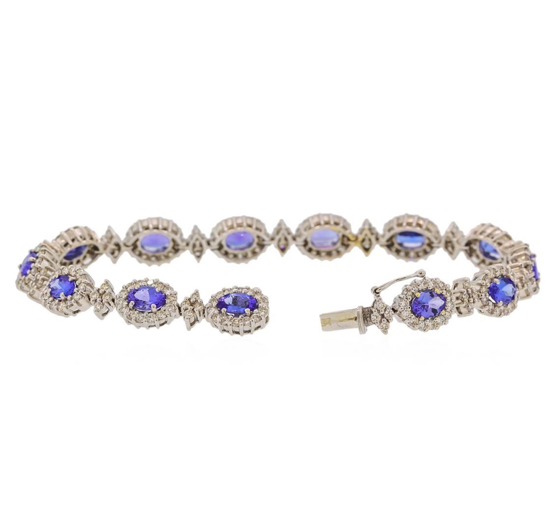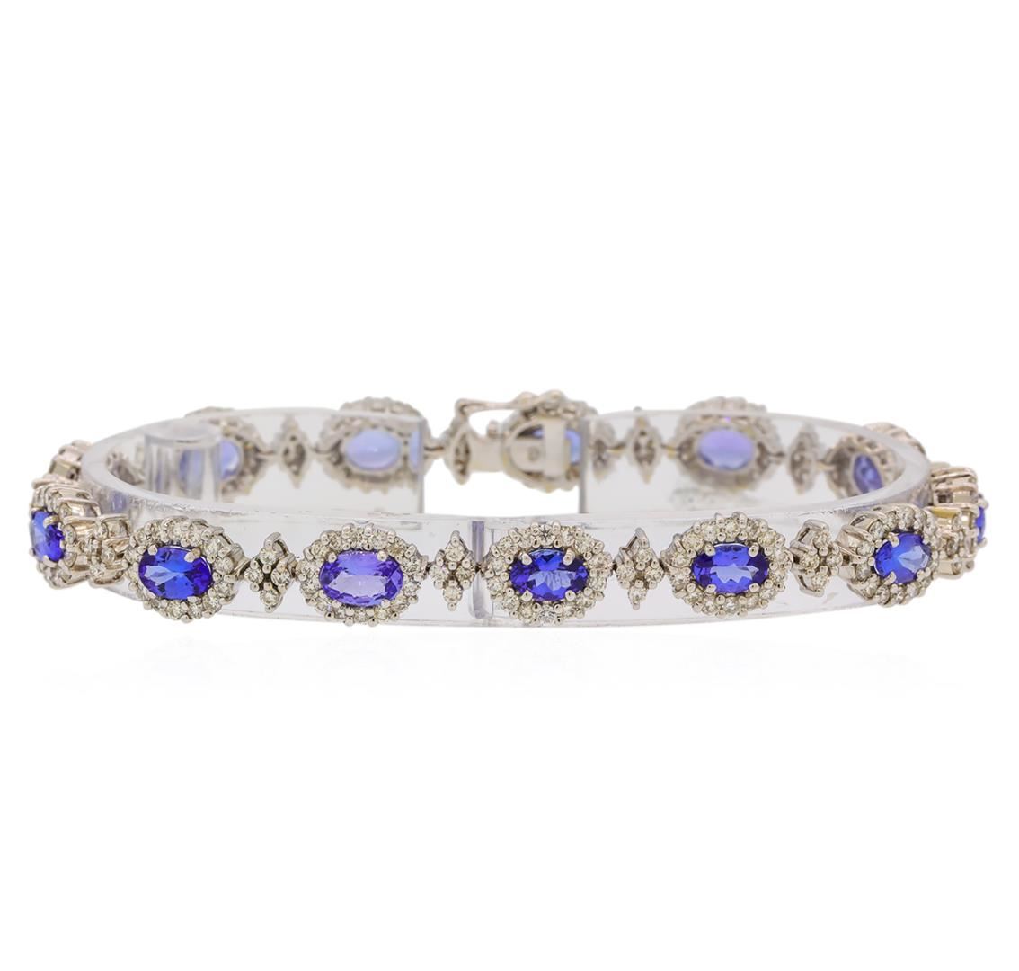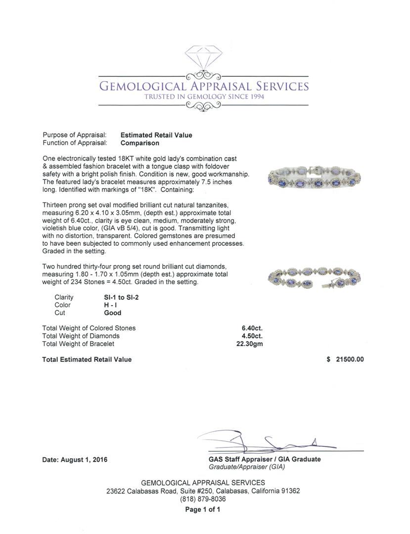 One electronically tested 18KT white gold lady's combination cast & assembled fashion bracelet with a tongue clasp with foldover safety with a bright polish finish. The featured lady's bracelet measures approximately 7.5 inches long. Identified with markings of '18K'. Condition is new, good workmanship. Containing: Thirteen prong set oval modified brilliant cut natural tanzanites, measuring 6.20 x 4.10 x 3.05mm, (depth est.) approximate total weight of 6.40ct., clarity is eye clean, medium, moderately strong, violetish blue color, (GIA vB 5/4), cut is good. Transmitting light with no distortion, transparent. Colored gemstones are presumed to have been subjected to commonly used enhancement processes. Graded in the setting. Two Hundred Thirty-Four prong set round brilliant cut diamonds, measuring 1.80 - 1.70 x 1.05mm (depth est.) approximate total weight of 234 Stones = 4.50ct. Graded in the setting. Clarity SI-1 to SI-2. Color: H - I Cut Good. Total Weight of Colored Stones 6.40ct.. Total Weight of Diamonds 4.50ct.. Total Weight of Bracelet 22.30gm. GAS Appraised at $21,500.00.