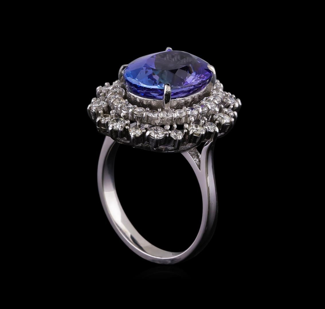 One electronically tested 14KT white gold lady's cast fashion ring with a double basket halo with a bright polish finish. The featured lady's has a shank measuring 2.60 millimeters in width. Identified with markings of "K14". Condition is new, good workmanship. Containing: One prong set oval modified brilliant cut natural tanzanite, measuring 12.98 x 9.97 x 7.17mm, (depth est.) approximate weight of 6.40ct., clarity is eye clean, medium light, very slightly grayish, violetish blue color, (GIA vB 4/3), cut is very good. Transmitting light with no distortion, transparent. Colored gemstones are presumed to have been subjected to commonly used enhancement processes. Graded in the setting. Ten prong set round brilliant cut diamonds, measuring 2.40 - 2.30 x 1.45mm (depth est.) approximate total weight of 10 Stones = 0.48ct. Graded in the setting. Clarity: VS-2 to SI-2. Color: H - I. Cut Good Thirty-Four prong set round brilliant cut diamonds, measuring 1.80 - 1.75 x 1.10mm (depth est.) approximate total weight of 34 Stones = 0.73ct. Graded in the setting. Clarity: SI-1 to SI-2. Color: H - I. Cut Good. Total Weight of Colored Stones 6.40ct. Total Weight of Diamonds 1.21ct. Total Weight of Ring 7.20gm. GAS Appraised.