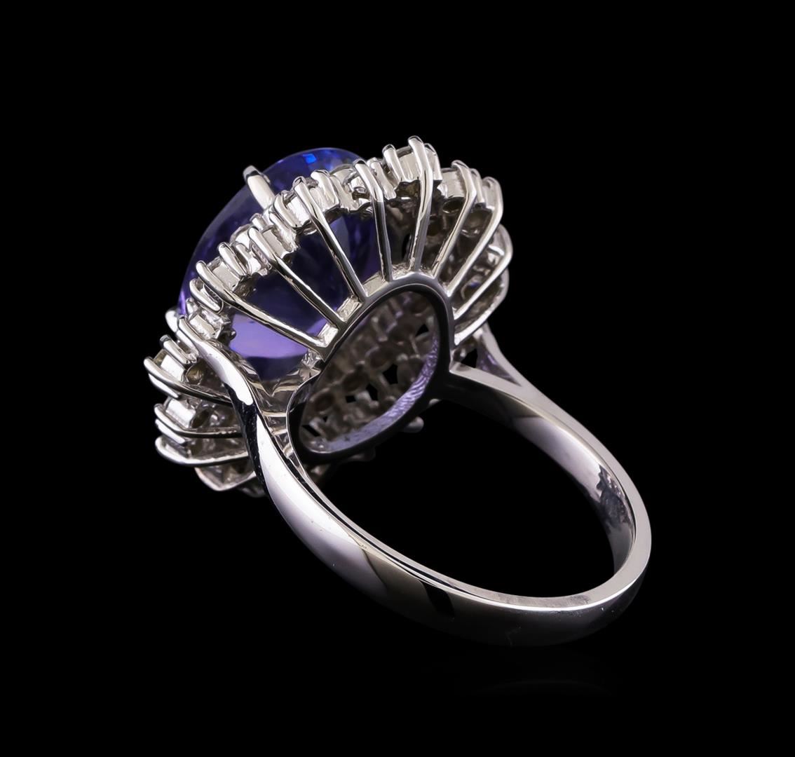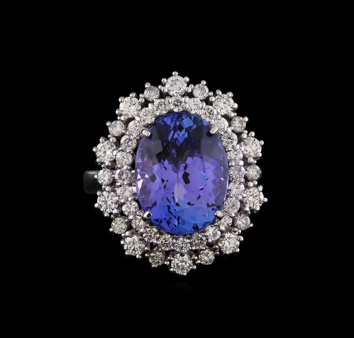 One electronically tested 14KT white gold lady's cast fashion ring with a double basket halo with a bright polish finish. The featured lady's has a shank measuring 2.60 millimeters in width. Identified with markings of "K14". Condition is new, good workmanship. Containing: One prong set oval modified brilliant cut natural tanzanite, measuring 12.98 x 9.97 x 7.17mm, (depth est.) approximate weight of 6.40ct., clarity is eye clean, medium light, very slightly grayish, violetish blue color, (GIA vB 4/3), cut is very good. Transmitting light with no distortion, transparent. Colored gemstones are presumed to have been subjected to commonly used enhancement processes. Graded in the setting. Ten prong set round brilliant cut diamonds, measuring 2.40 - 2.30 x 1.45mm (depth est.) approximate total weight of 10 Stones = 0.48ct. Graded in the setting. Clarity: VS-2 to SI-2. Color: H - I. Cut Good Thirty-Four prong set round brilliant cut diamonds, measuring 1.80 - 1.75 x 1.10mm (depth est.) approximate total weight of 34 Stones = 0.73ct. Graded in the setting. Clarity: SI-1 to SI-2. Color: H - I. Cut Good. Total Weight of Colored Stones 6.40ct. Total Weight of Diamonds 1.21ct. Total Weight of Ring 7.20gm. GAS Appraised.