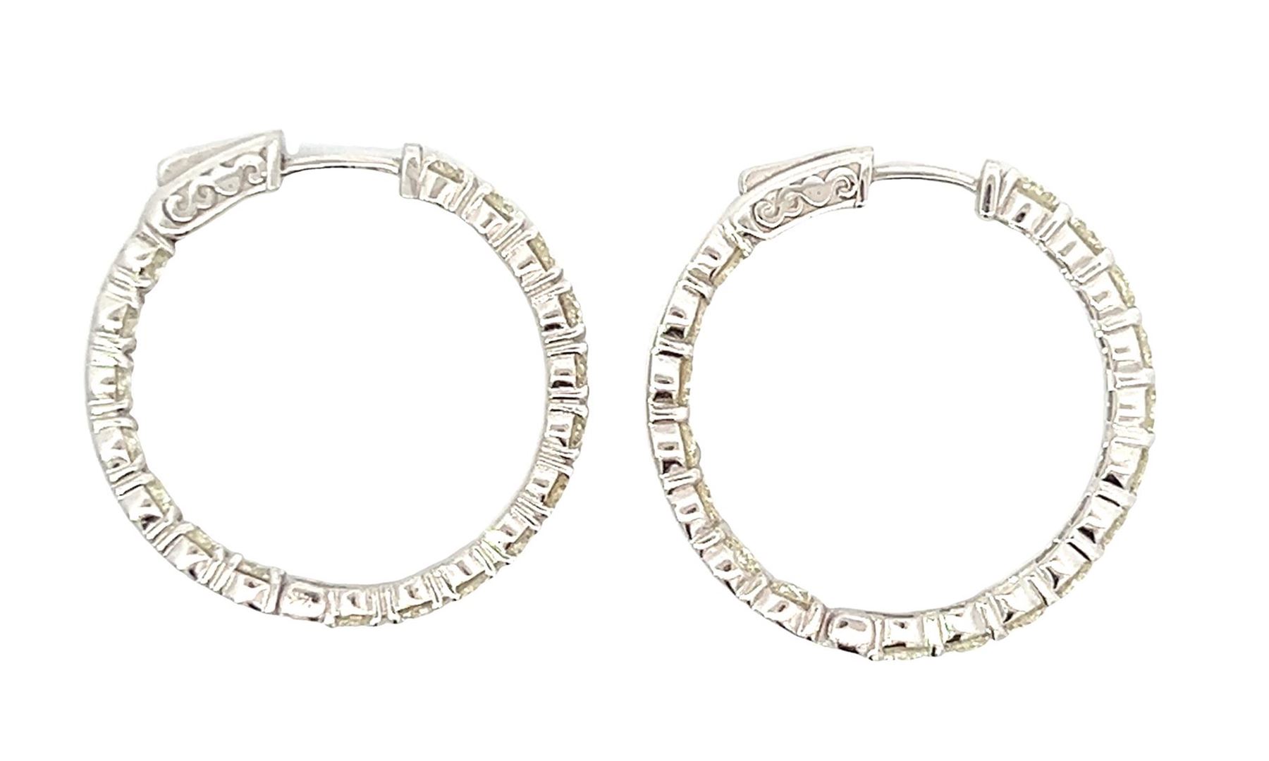 One pair electronically tested 14KT white gold lady's combination cast & assembled fashion inside-out hoop earrings with a bright polish finish. The featured hoop earring has a diameter of 30 millimeter. Identified with markings of "14K". Condition is new, good workmanship. Containing: Thirty-Six prong set round brilliant cut diamonds, measuring 3.60 - 3.50 x 2.29mm (depth est.) approximate total weight of 36 Stones = 6.41ct. Graded in the setting. Color I - J Clarity VS-2 to SI-1 Cut Very Good Total Weight of Diamonds 6.41ct. Total Weight of Earrings 9.90gm Estimated Retail Value $ 22400.00