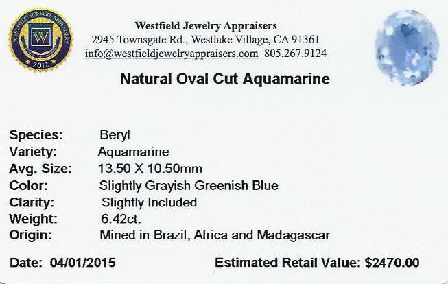 One oval cut natural aquamarine exact weight 6.42ct., clarity is slightly included, type I, medium light, very slightly grayish, very slightly greenish blue color, (GIA vslgB 4/3), cut is good. Westfield Appraised at $2,470.00.