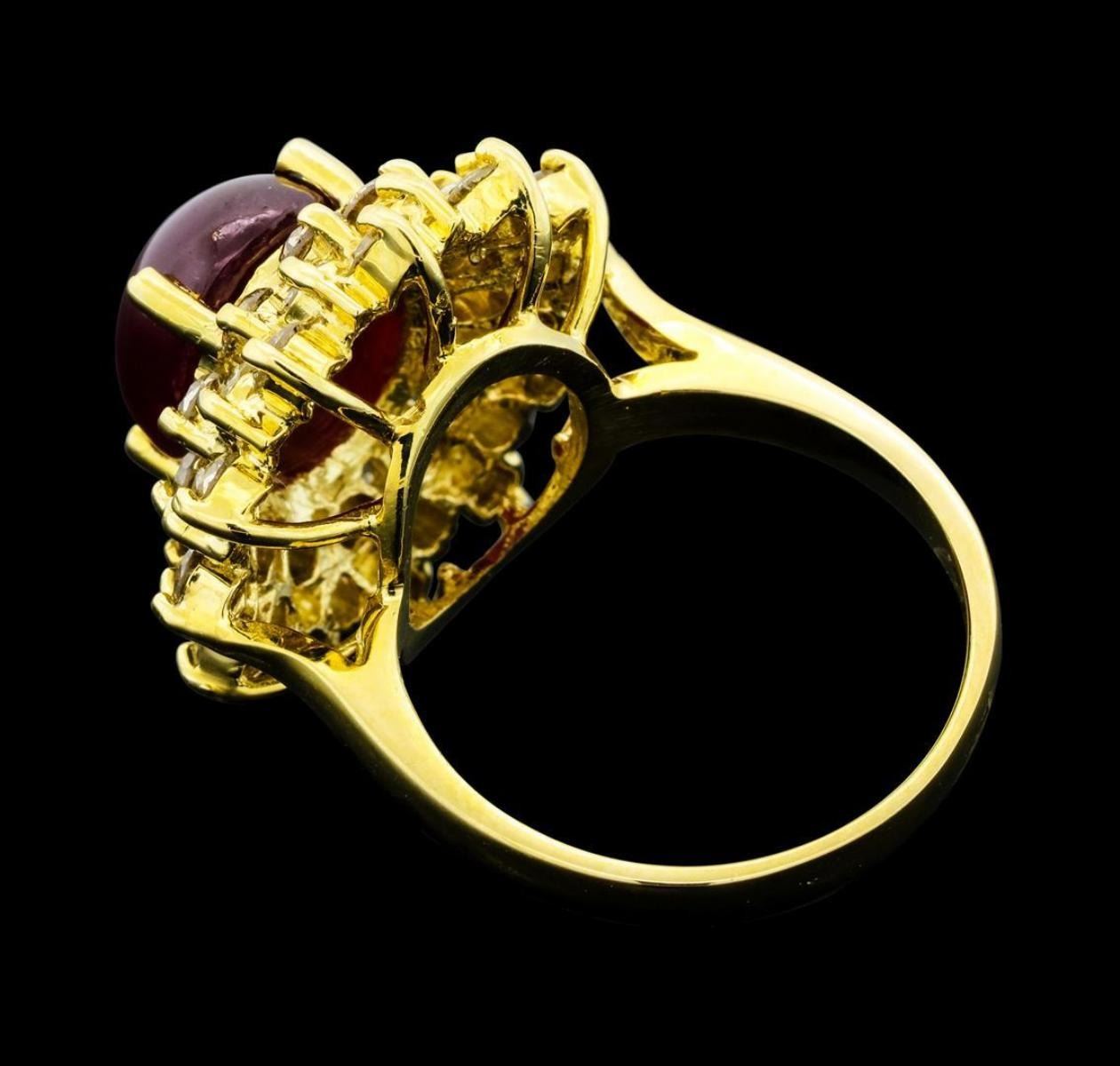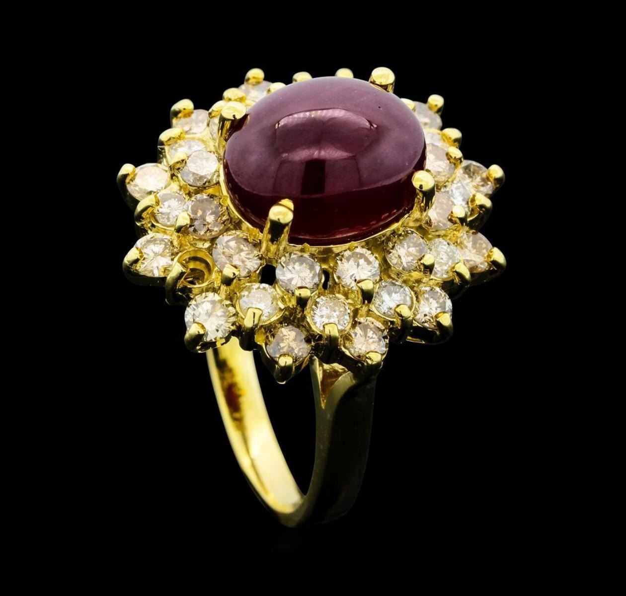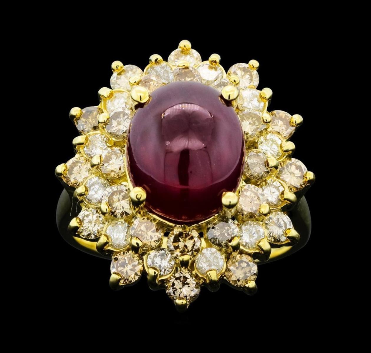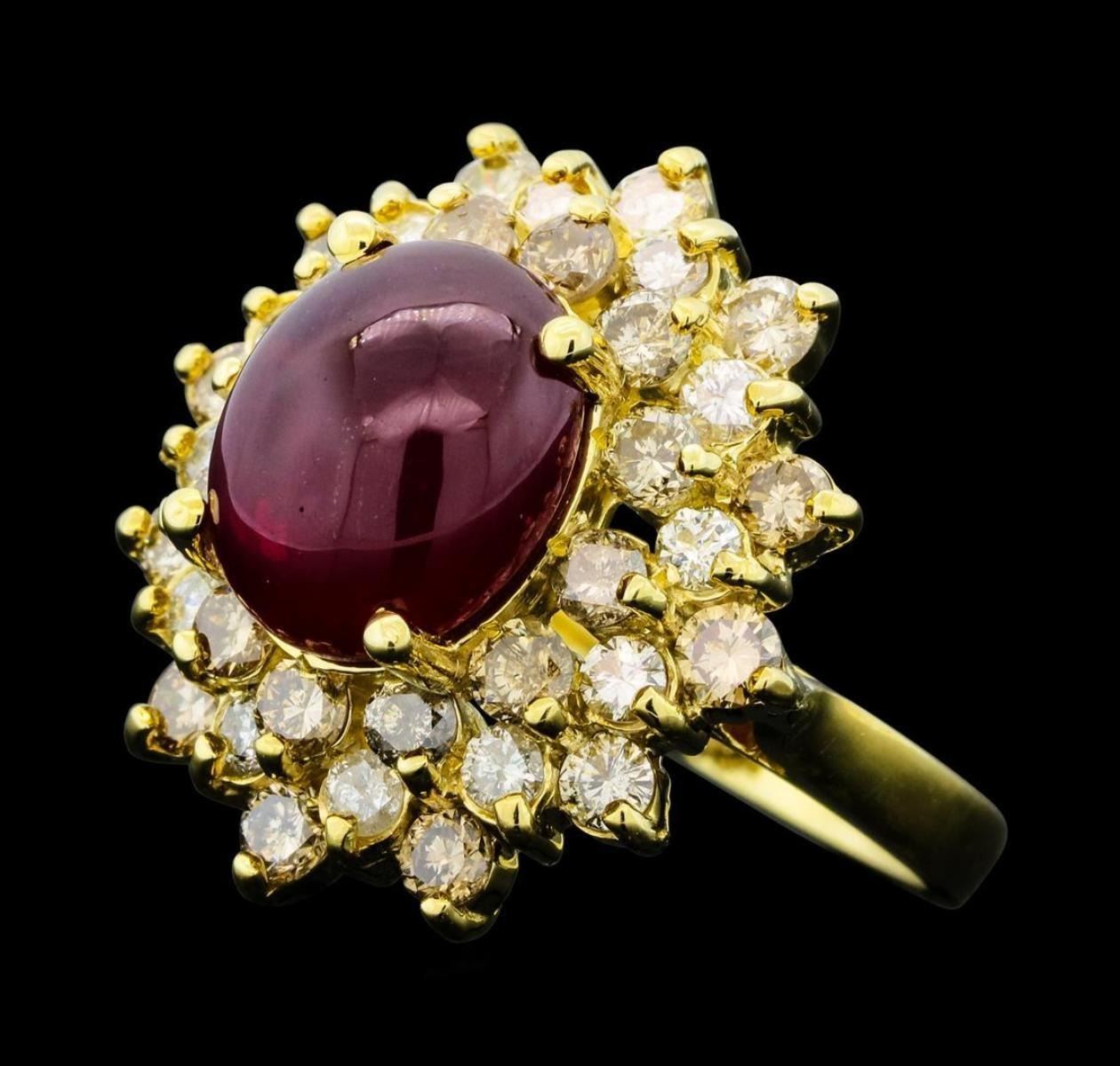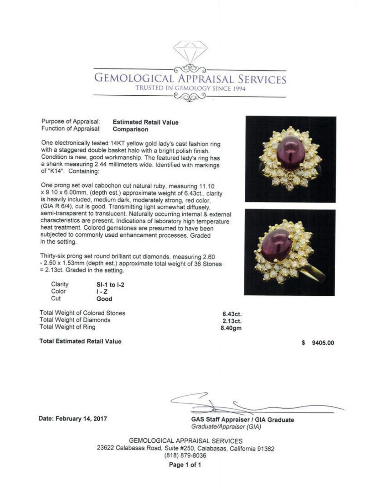 One electronically tested 14KT yellow gold lady's cast fashion ring with a staggered double basket halo with a bright polish finish. The featured lady's ring has a shank measuring 2.44 millimeters wide. Identified with markings of 'K14'. Condition is new, good workmanship. Containing: One prong set oval cabochon cut natural ruby, measuring 11.10 x 9.10 x 6.00mm, (depth est.) approximate weight of 6.43ct., clarity is heavily included, medium dark, moderately strong, red color, (GIA R 6/4), cut is good. Transmitting light somewhat diffusely, semi-transparent to translucent. Naturally occurring internal & external characteristics are present. Indications of laboratory high temperature heat treatment. Colored gemstones are presumed to have been subjected to commonly used enhancement processes. Graded in the setting. Thirty-Six prong set round brilliant cut diamonds, measuring 2.60 - 2.50 x 1.53mm (depth est.) approximate total weight of 36 Stones = 2.13ct. Graded in the setting. Clarity SI-1 to I-2. Color: I - Z Cut Good. Total Weight of Colored Stones 6.43ct.. Total Weight of Diamonds 2.13ct.. Total Weight of Ring 8.40gm. GAS Appraised.