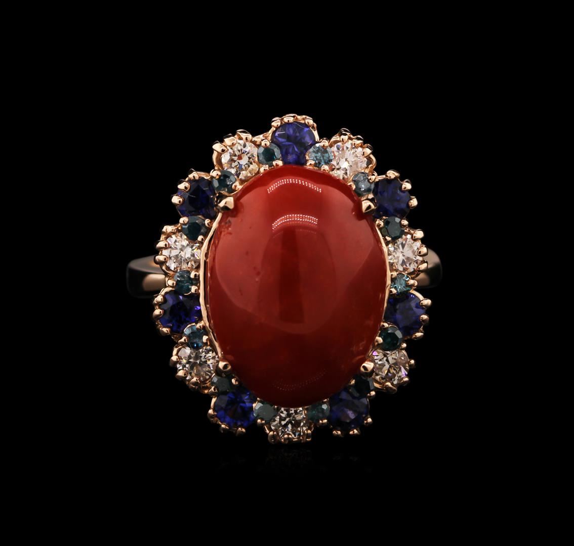 One ring featuring: 14KT rose gold weighing 6.07 grams containing one coral center stone with a total weight of 6.43ct, seven blue sapphires with a total weight of 0.70ct, and 21 white and bluish/green diamonds with a total weight of 0.65ct.