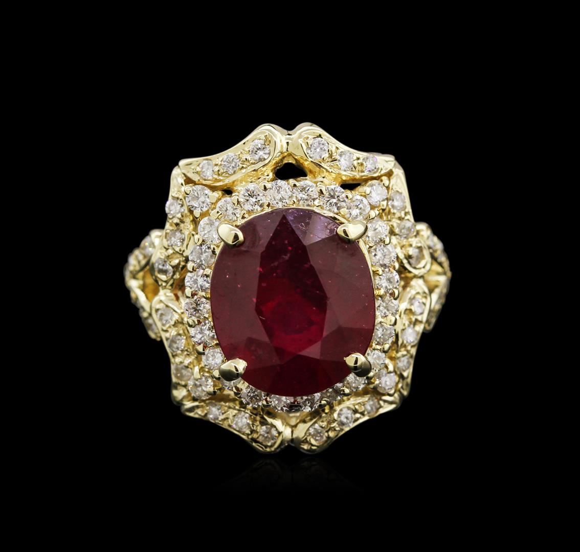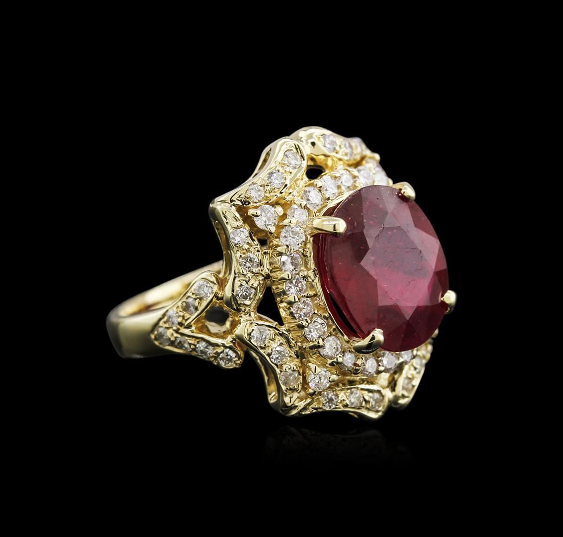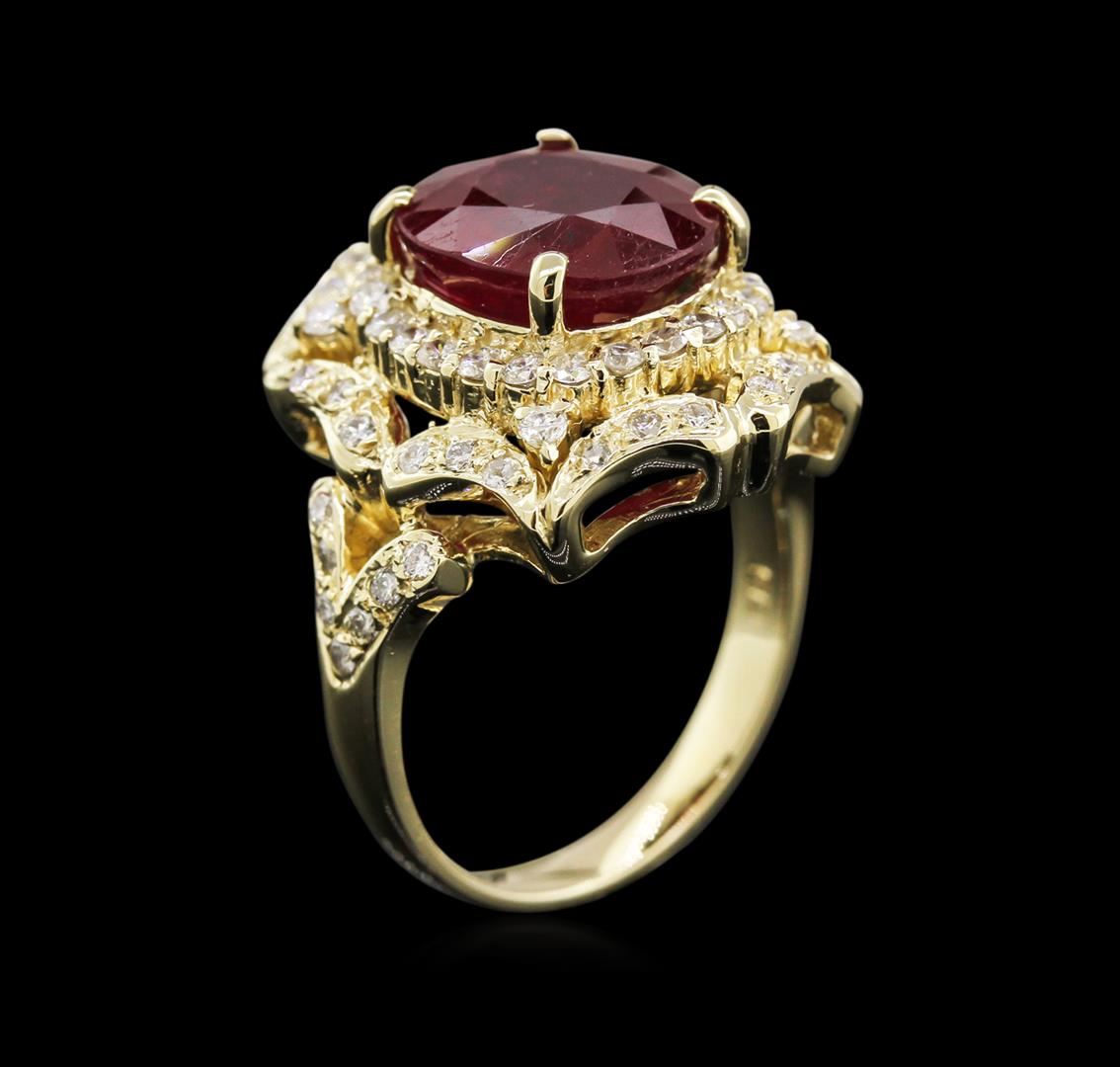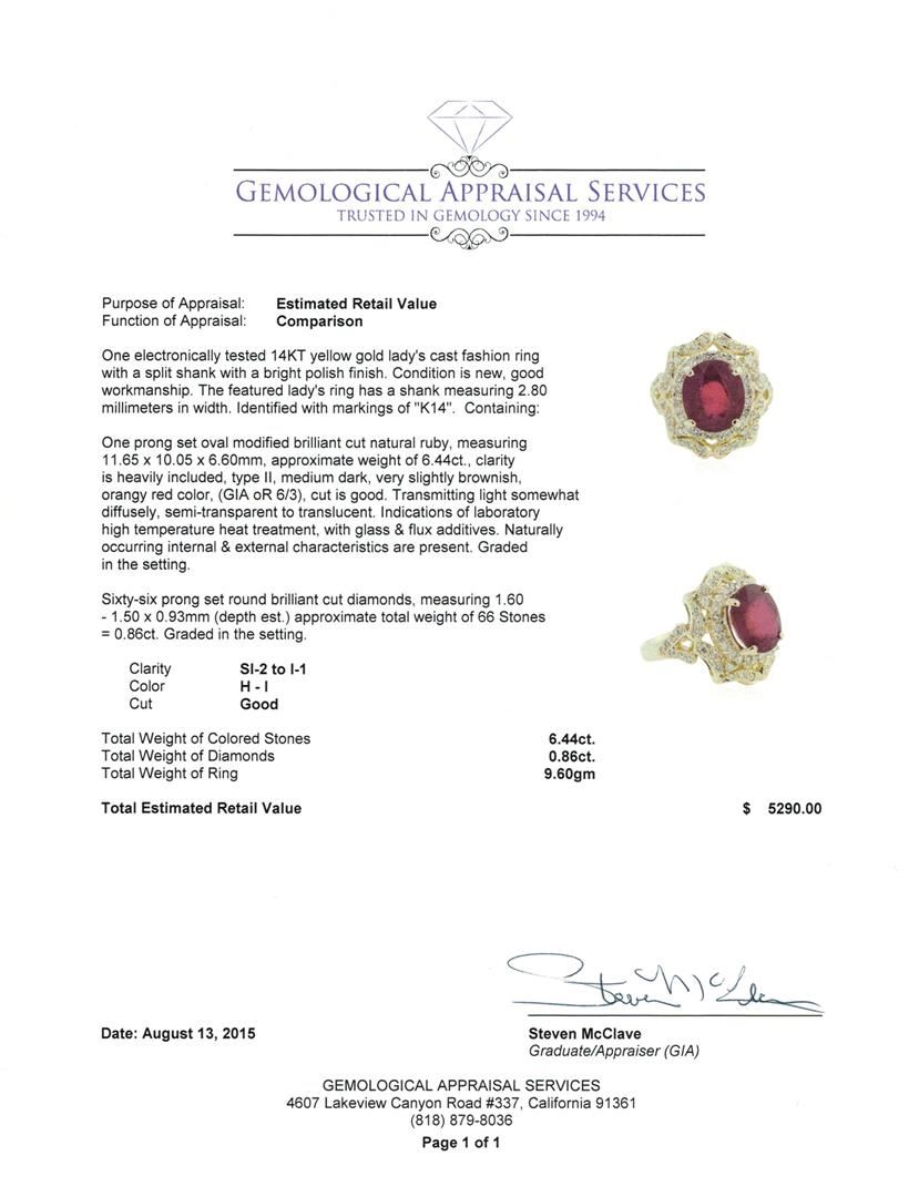 One electronically tested 14KT yellow gold lady's cast fashion ring with a split shank with a bright polish finish. The featured lady's ring has a shank measuring 2.80 millimeters in width. Identified with markings of "K14". Condition is new, good workmanship. Containing: One prong set oval modified brilliant cut natural ruby, measuring 11.65 x 10.05 x 6.60mm, approximate weight of 6.44ct., clarity is heavily included, type II, medium dark, very slightly brownish, orangy red color, (GIA oR 6/3), cut is good. Transmitting light somewhat diffusely, semi-transparent to translucent. Indications of laboratory high temperature heat treatment, with glass & flux additives. Naturally occurring internal & external characteristics are present. Graded in the setting. Sixty-Six prong set round brilliant cut diamonds, measuring 1.60 - 1.50 x 0.93mm (depth est.) approximate total weight of 66 Stones = 0.86ct. Graded in the setting. Clarity: SI-2 to I-1. Color: H - I. Cut Good. Total Weight of Colored Stones 6.44ct. Total Weight of Diamonds 0.86ct. Total Weight of Ring 9.60gm. GAS Appraised at $5,290.00.
