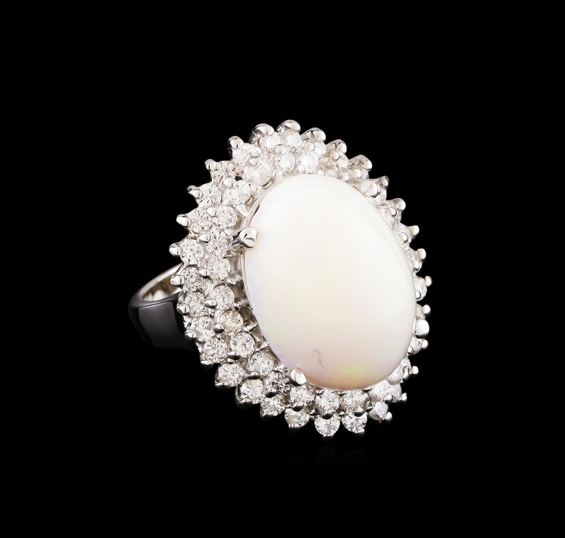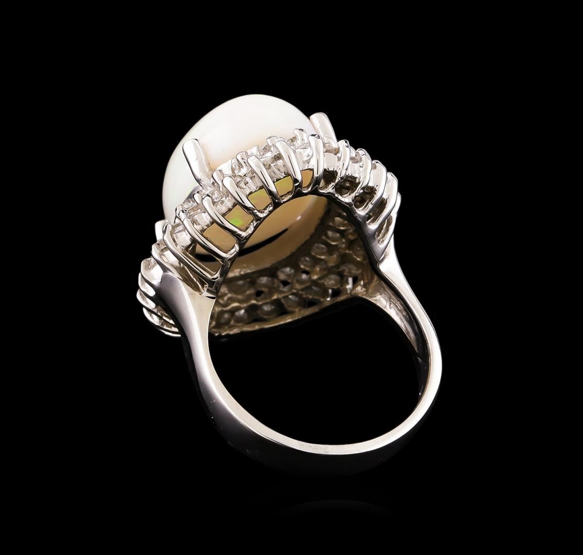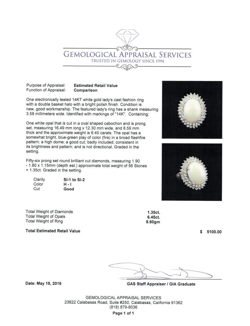 One electronically tested 14KT white gold lady's cast fashion ring with a double basket halo with a bright polish finish. The featured lady's ring has a shank measuring 3.58 millimeters wide. Identified with markings of "14K". Condition is new, good workmanship. Containing: One white opal that is cut in a oval shaped cabochon and is prong set, measuring 16.49 mm long x 12.30 mm wide, and 8.59 mm thick and the approximate weight is 6.45 carats. The opal has a somewhat bright, blue-green play of color (fire) in a broad flashfire pattern; a high dome; a good cut; badly included; consistent in its brightness and pattern; and is not directional. Graded in the setting. Fifty-Six prong set round brilliant cut diamonds, measuring 1.90 - 1.80 x 1.15mm (depth est.) approximate total weight of 56 Stones = 1.35ct. Graded in the setting. Clarity: SI-1 to SI-2. Color: H - I. Cut Good. Total Weight of Diamonds 1.35ct. Total Weight of Opals 6.45ct. Total Weight of Ring 8.60gm. GAS Appraised at $5,100.00.