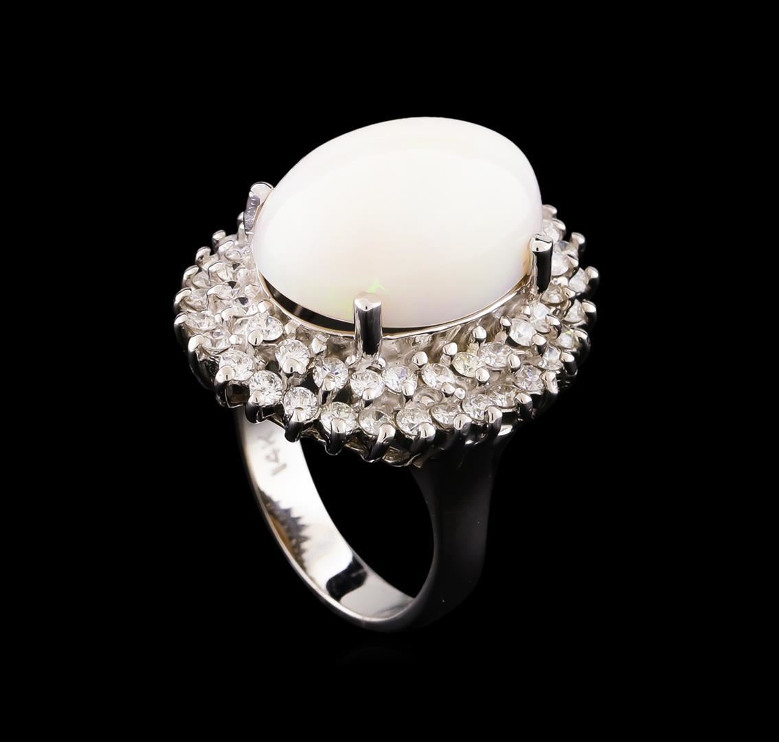 One electronically tested 14KT white gold lady's cast fashion ring with a double basket halo with a bright polish finish. The featured lady's ring has a shank measuring 3.58 millimeters wide. Identified with markings of "14K". Condition is new, good workmanship. Containing: One white opal that is cut in a oval shaped cabochon and is prong set, measuring 16.49 mm long x 12.30 mm wide, and 8.59 mm thick and the approximate weight is 6.45 carats. The opal has a somewhat bright, blue-green play of color (fire) in a broad flashfire pattern; a high dome; a good cut; badly included; consistent in its brightness and pattern; and is not directional. Graded in the setting. Fifty-Six prong set round brilliant cut diamonds, measuring 1.90 - 1.80 x 1.15mm (depth est.) approximate total weight of 56 Stones = 1.35ct. Graded in the setting. Clarity: SI-1 to SI-2. Color: H - I. Cut Good. Total Weight of Diamonds 1.35ct. Total Weight of Opals 6.45ct. Total Weight of Ring 8.60gm. GAS Appraised.