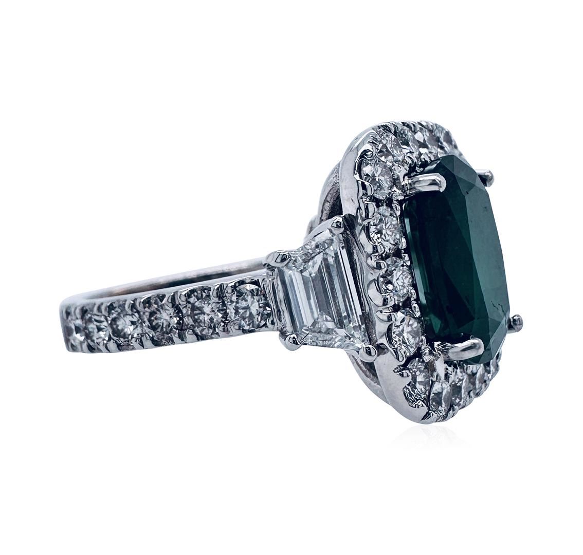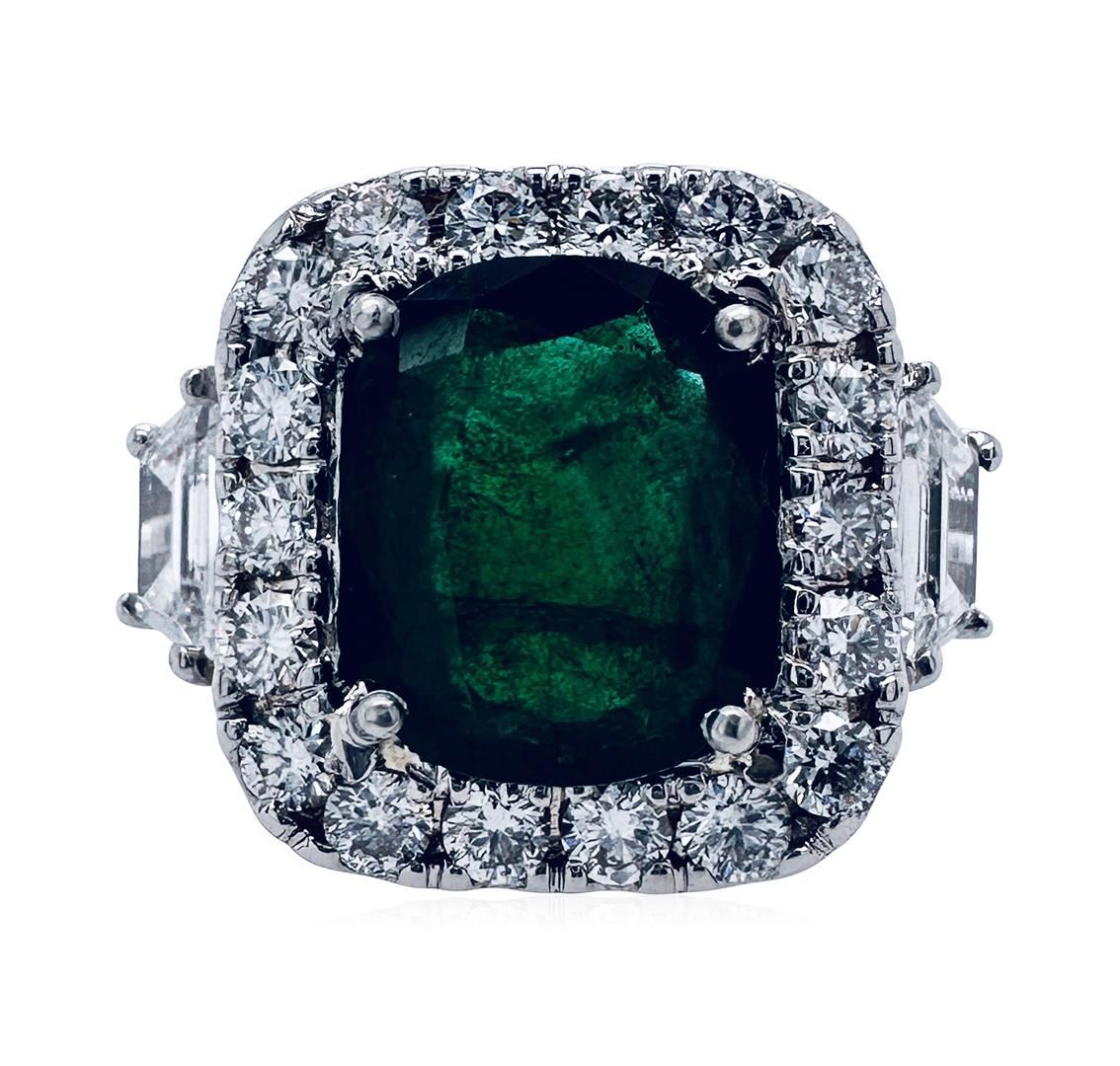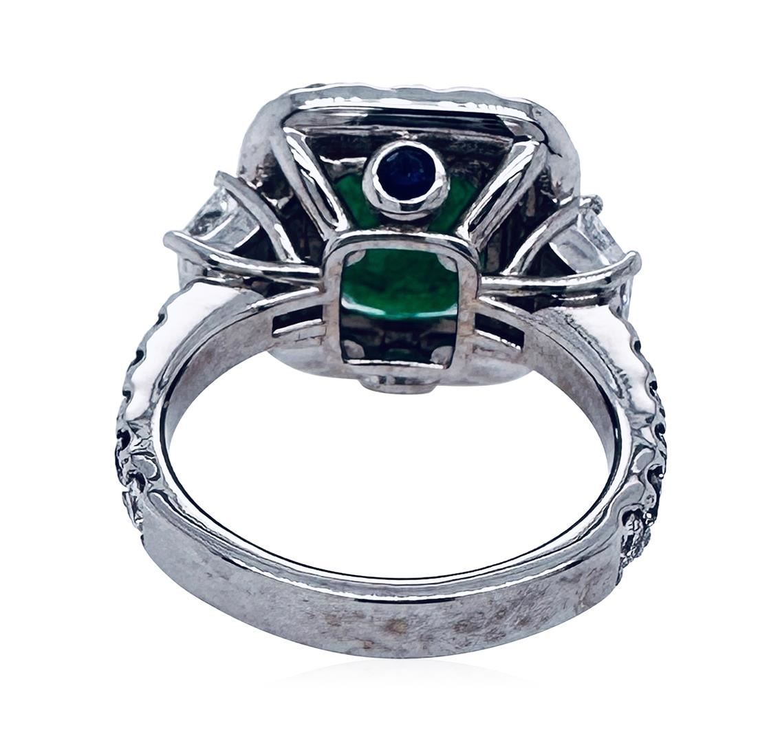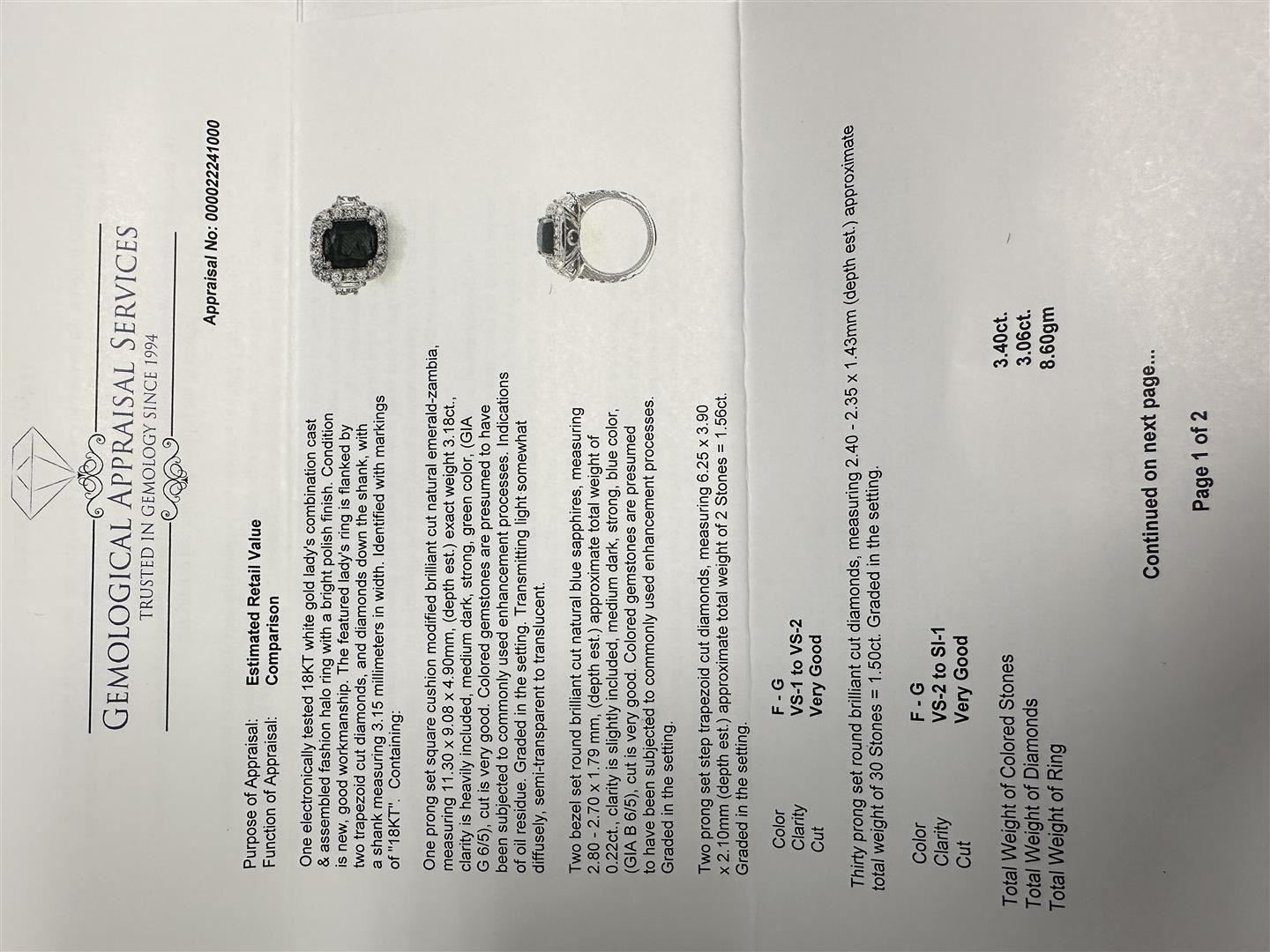 One electronically tested 18KT white Gold Lady's combination cast & assembled fashion halo ring with a bright polish finish. Condition is new, good workmanship. The featured lady's ring is flanked by two trapezoid cut diamonds, and diamonds down the shank, with a shank measuring 3.15 mm in width. Identified with markings of 18KT. Containing: One prong set square cushion modified brilliant cut natural emerald-zambia, measuring 11.30 x 9.08 x 4.90mm, (depth est), exact weight 3.18 ctw, clarity is heavily included, medium dark, strong, green color, (GIA G6/5), cut is very good. Colored gemstones are presumed to have been subjected to commonly used enhancement processes. Indications of oil residue. Graded in the setting. Tramitting light someonwhat diffusely, semi-transparent to translucent. Two bezel set round brilliant cut natural blue sapphires, measuraing 2.80 - 2.70 x 1.79mm, (depth est), approximate total weight of 0.22 ctw, clarity is slightly included, medium dark, strong, blue color, (GIA B6/5), cut is very good. Colored gemstones are presumed to have been subjected to commonly used enhancement processes. Graded in the setting. Total weight of colored stones: 3.40ctw. Total weight of Diamonds: 3.06ctw. Total weight of ring: 8.60gm. Total estimated retail value: $18500.