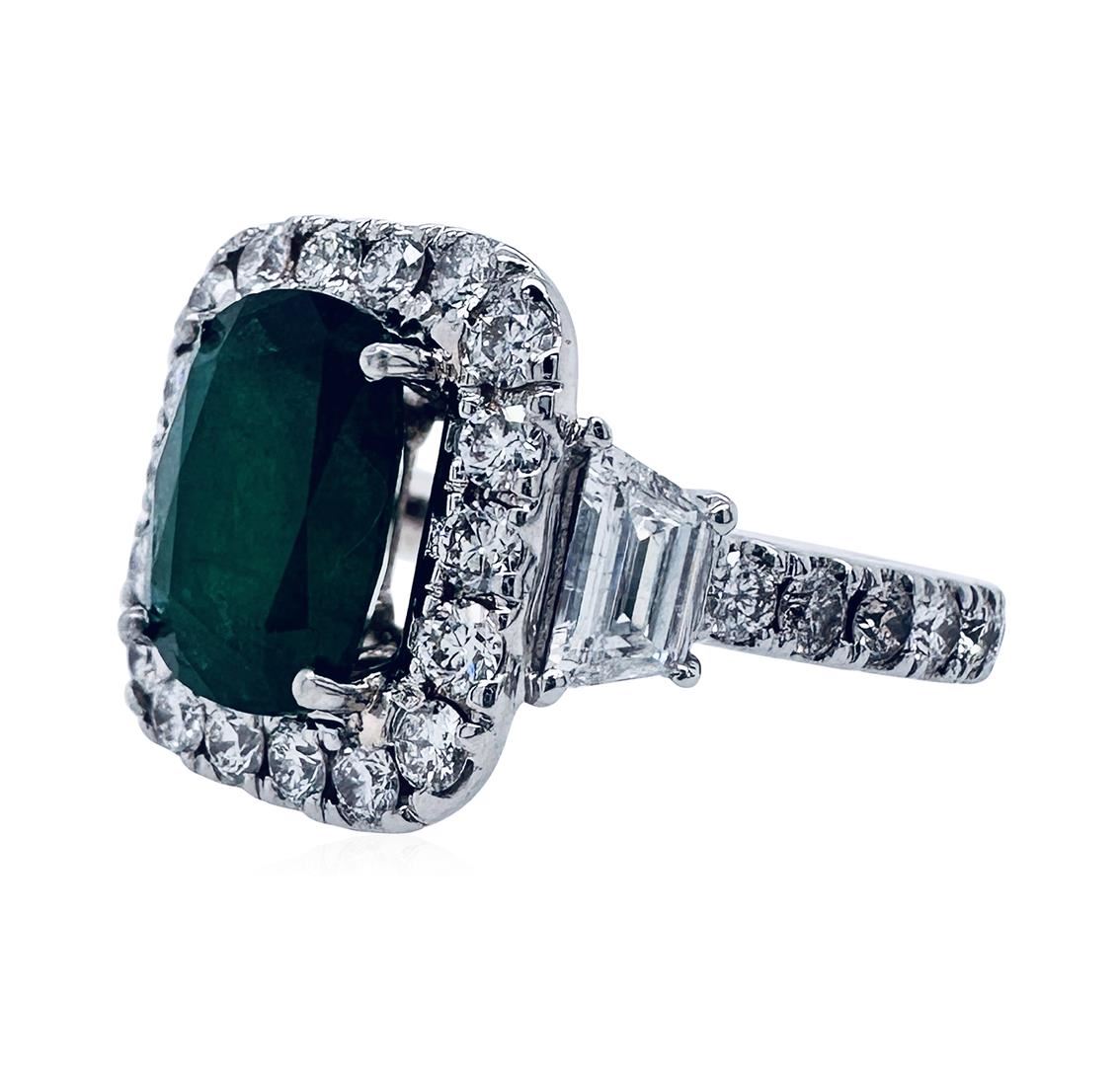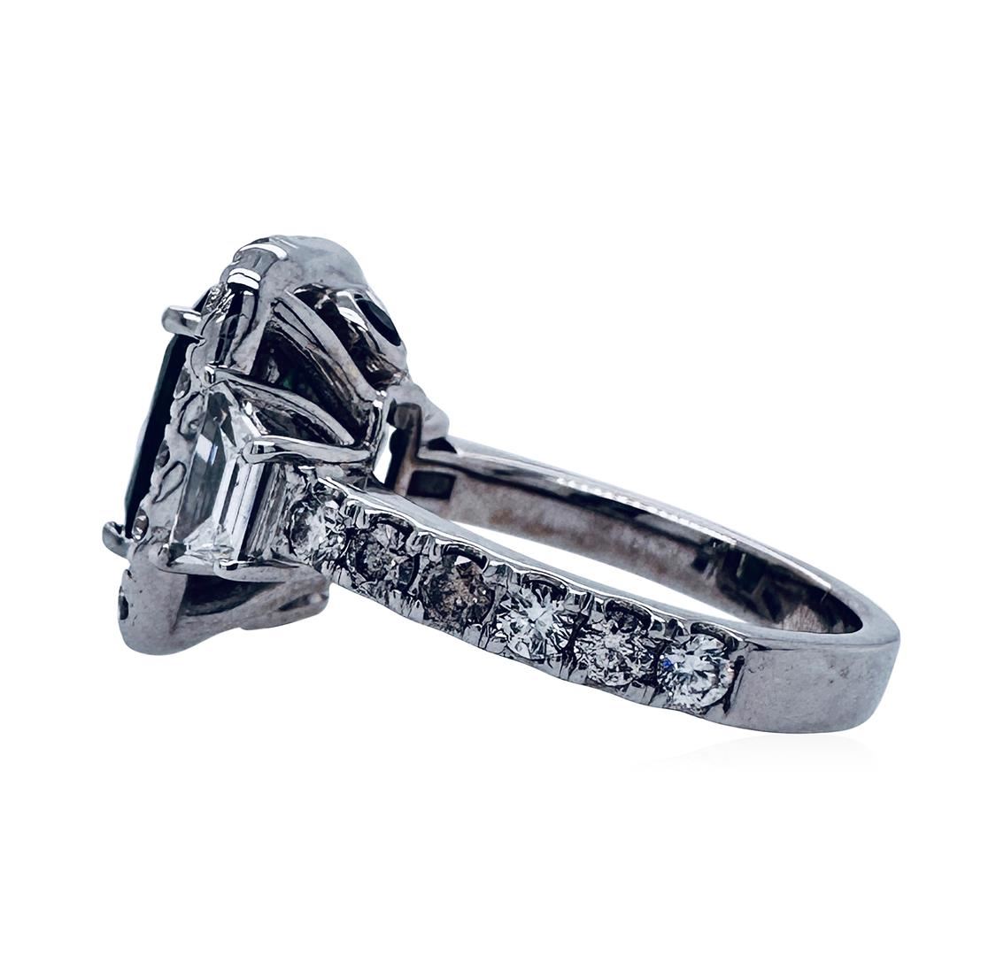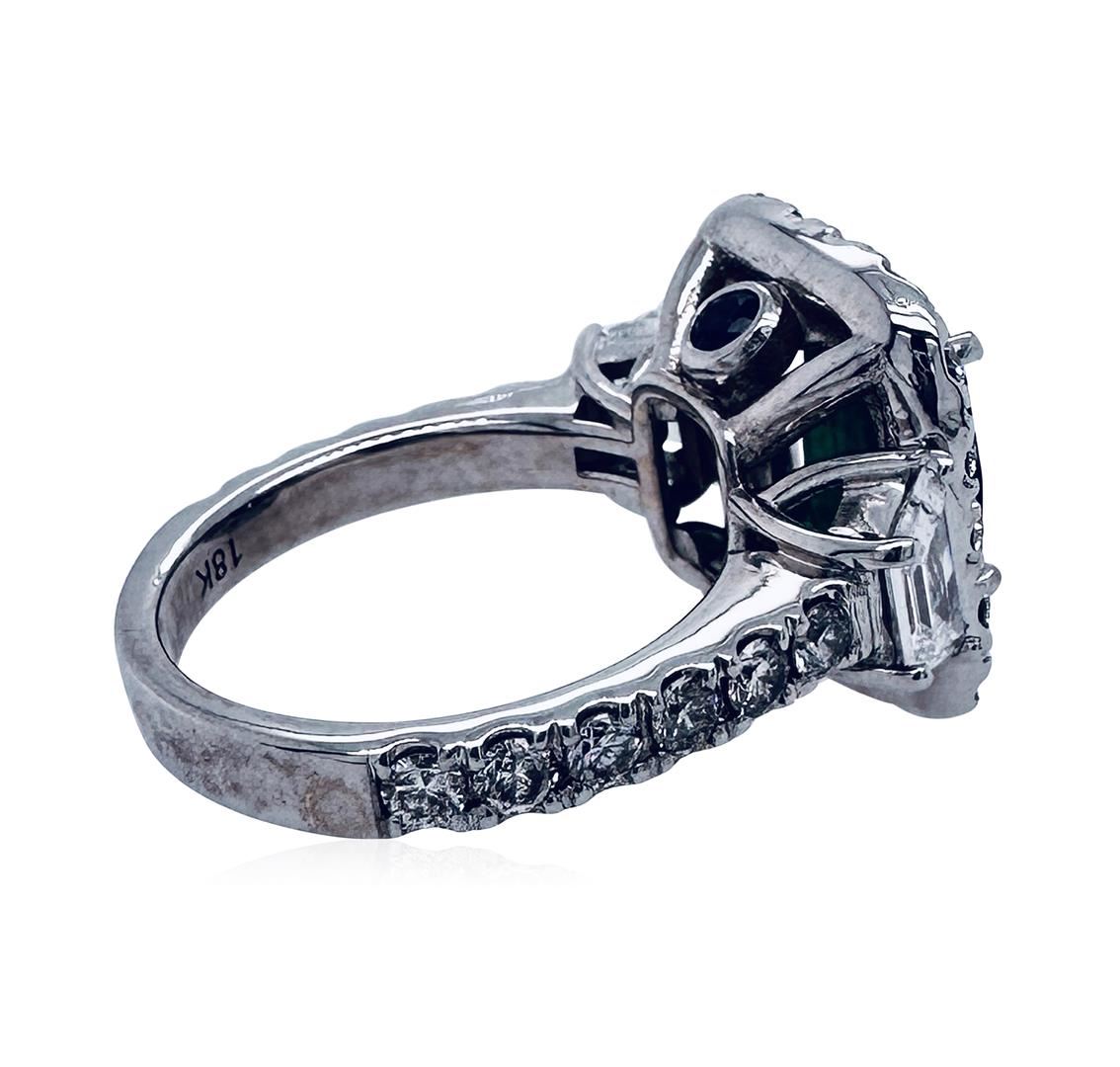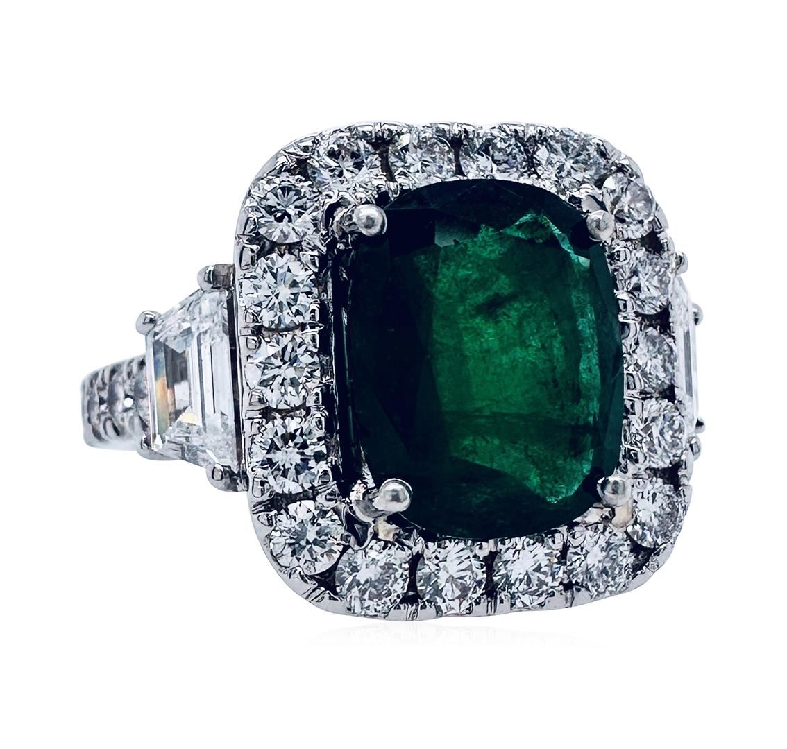 One electronically tested 18KT white Gold Lady's combination cast & assembled fashion halo ring with a bright polish finish. Condition is new, good workmanship. The featured lady's ring is flanked by two trapezoid cut diamonds, and diamonds down the shank, with a shank measuring 3.15 mm in width. Identified with markings of 18KT. Containing: One prong set square cushion modified brilliant cut natural emerald-zambia, measuring 11.30 x 9.08 x 4.90mm, (depth est), exact weight 3.18 ctw, clarity is heavily included, medium dark, strong, green color, (GIA G6/5), cut is very good. Colored gemstones are presumed to have been subjected to commonly used enhancement processes. Indications of oil residue. Graded in the setting. Tramitting light someonwhat diffusely, semi-transparent to translucent. Two bezel set round brilliant cut natural blue sapphires, measuraing 2.80 - 2.70 x 1.79mm, (depth est), approximate total weight of 0.22 ctw, clarity is slightly included, medium dark, strong, blue color, (GIA B6/5), cut is very good. Colored gemstones are presumed to have been subjected to commonly used enhancement processes. Graded in the setting. Total weight of colored stones: 3.40ctw. Total weight of Diamonds: 3.06ctw. Total weight of ring: 8.60gm. Total estimated retail value: $18500.