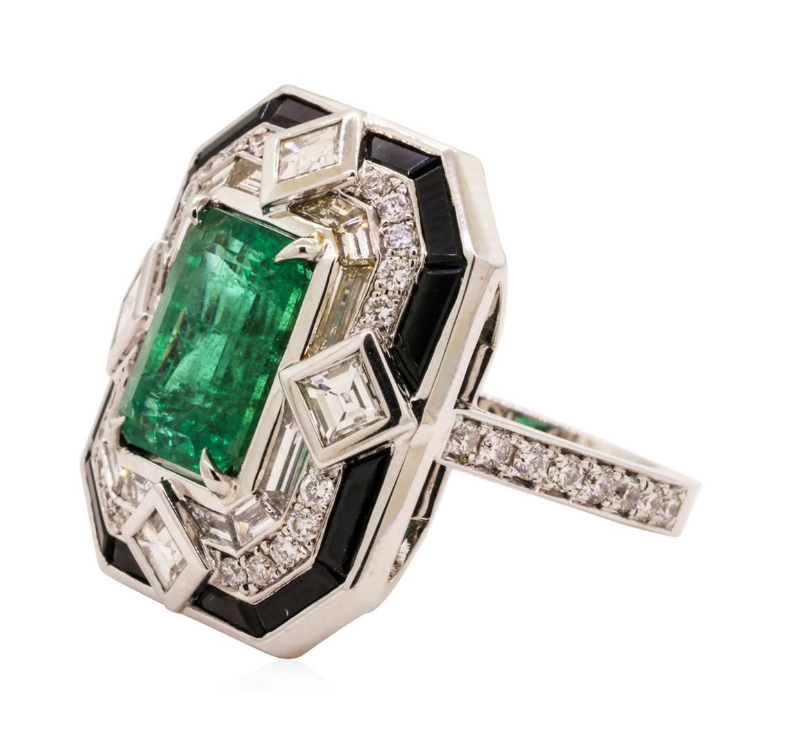 One electronically tested 18KT white gold lady's cast fashion ring with a cushion halo with a bright polish finish. The featured lady's ring has twelve pieces of custom cut inlaid onyx framing the center motif and a shank measuring 2.80 millimeters wide. Identified with markings of '18K'. Condition is like new, good workmanship. Containing: One prong set emerald modified step cut natural emerald, measuring 11.52 x 8.40 x 7.07mm, (depth est.) 7%. bulge factor, approximate weight of 5.42ct., clarity is heavily included, medium, strong, very slightly bluish green color, (GIA vslbG 5/5), cut is very good. Transmitting light somewhat diffusely, semi-transparent to translucent. Naturally occurring internal & external characteristics are present. Indications of oil residue. Colored gemstones are presumed to have been subjected to commonly used enhancement processes. Graded in the setting. Four bezel set square cut diamonds, measuring 3.80 x 3.70 x 2.29mm (depth est.) approximate total weight of 4 Stones = 1.04ct. Graded in the setting. Color H - I Clarity VS-1 to VS-2 Cut Very Good Twenty prong set round brilliant cut diamonds, measuring 1.60 - 1.50 x 0.96mm (depth est.) approximate total weight of 20 Stones = 0.28ct. Graded in the setting. Color H - I Clarity VS-2 to SI-1 Cut Good Twelve channel set baguette cut diamonds, measuring from 2.30 x 1.70 x 1.45mm (depth est.) to 3.70 x 1.80 x 1.53mm (depth est.) approximate total weight of 12 Stones = 0.80ct. Graded in the setting. Color H - I Clarity VS-1 to VS-2 Cut Very Good Sixteen prong set round brilliant cut diamonds, measuring 2.00 - 1.90 x 1.21mm (depth est.) approximate total weight of 16 Stones = 0.45ct. Graded in the setting. Color G - H Clarity VS-2 to SI-1 Cut Very Good. Total Weight of Colored Stones 5.42ct.. Total Weight of Diamonds 2.57ct.. Total Weight of Ring 16.40gm GAS Appraised at $49685.00. GAS Appraised.