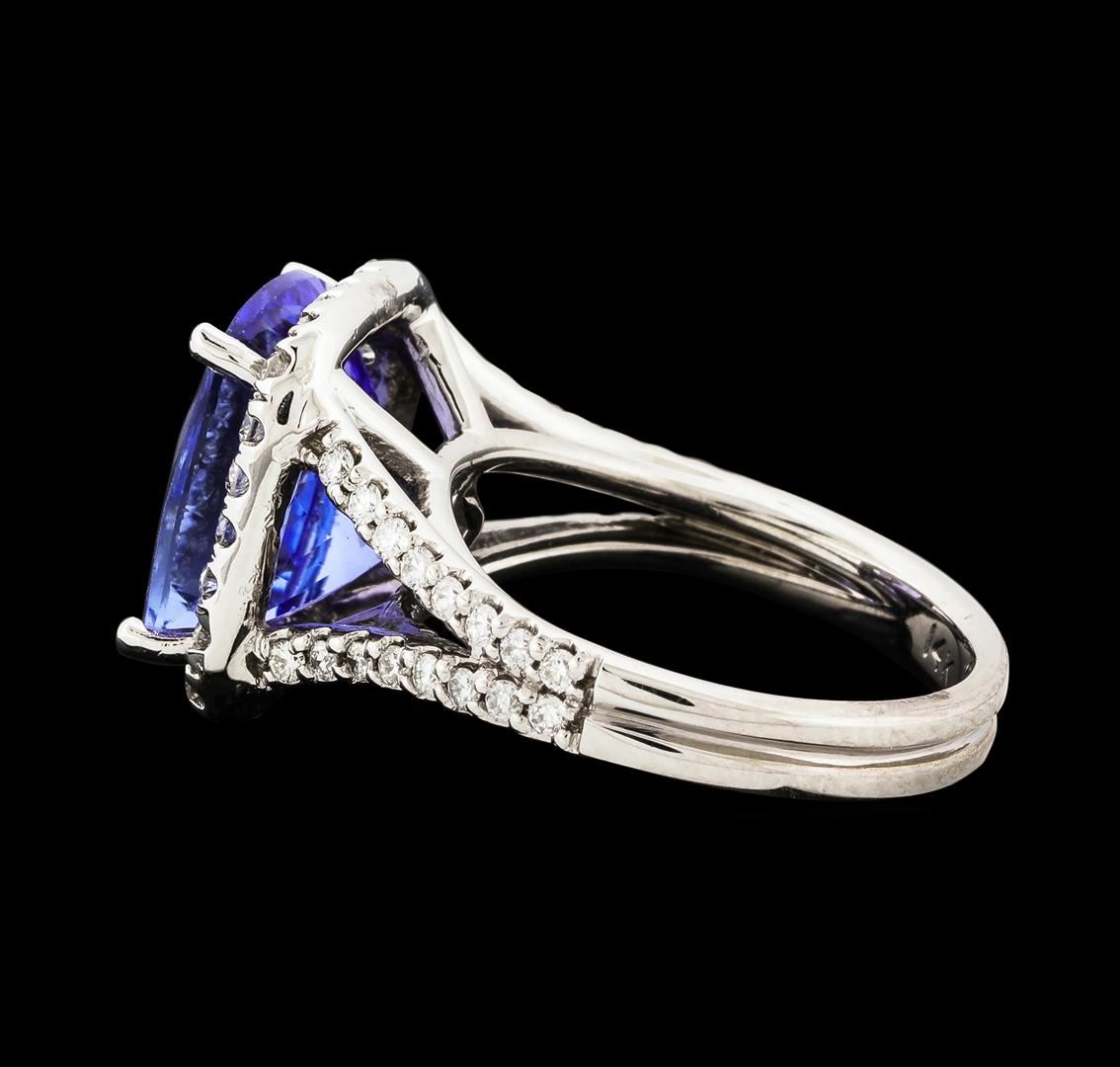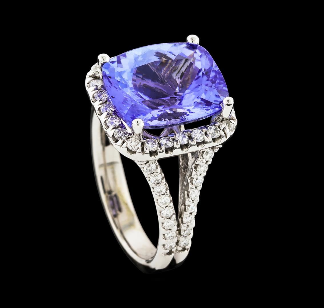 One electronically tested 14KT white gold lady's cast fashion ring with a split shank halo with a bright polish finish. The featured lady's ring has a double shank measuring 3.07 millimeters wide. Identified with markings of '14K'. Condition is new, good workmanship. Containing: One prong set rectangular cushion modified brilliant cut natural tanzanite, measuring 12.55 x 10.40 x 6.88mm, (depth est.) approximate weight of 6.46ct., clarity is eye clean, medium, very slightly grayish, bluish violet color, (GIA bV 5/3), cut is very good. Transmitting light with no distortion, transparent. Colored gemstones are presumed to have been subjected to commonly used enhancement processes. Graded in the setting. Twenty-Four prong set round brilliant cut diamonds, measuring 1.60 - 1.50 x 0.97mm (depth est.) approximate total weight of 24 Stones = 0.36ct. Graded in the setting. Clarity SI-1 to SI-2. Color: H - I Cut Good Thirty-Two prong set round brilliant cut diamonds, measuring 1.40 - 1.35 x 0.86mm (depth est.) approximate total weight of 32 Stones = 0.32ct. Graded in the setting. Clarity SI-1 to SI-2. Color: H - I Cut Good. Total Weight of Colored Stones 6.46ct.. Total Weight of Diamonds 0.68ct.. Total Weight of Ring 7.40gm. GAS Appraised at $10,795.00.