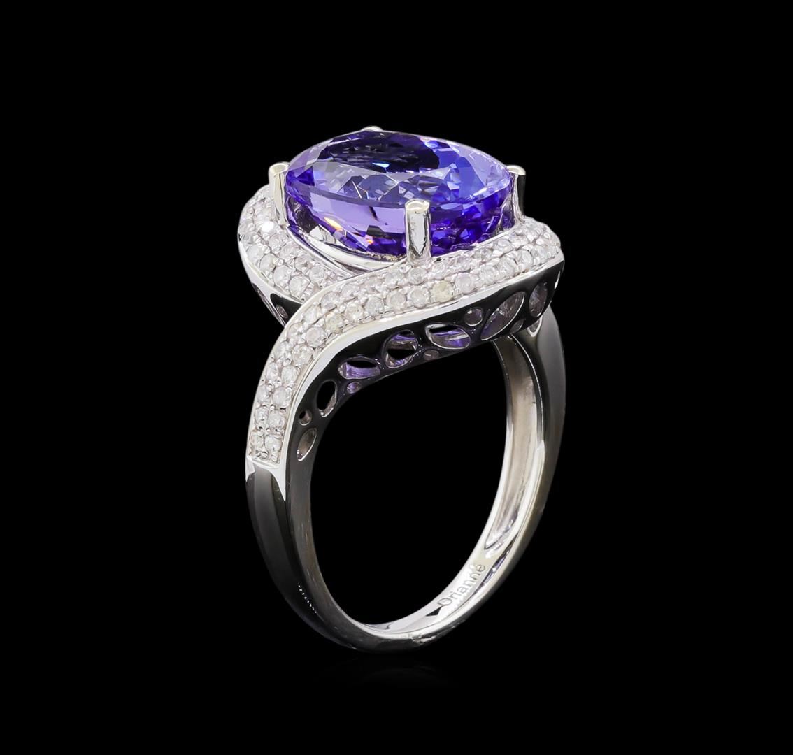 One electronically tested 14KT white gold ladies cast tanzanite and diamond ring with a bright polish finish. The featured tanzanite is set within a stylized diamond by-pass design supported by diamond set shoulders, completed by a two and one-half millimeter wide band. Trademark is Orianne. Identified with markings of "14K". Condition is new, good workmanship. Containing: One prong set oval mixed cut natural tanzanite, measuring 13.40 x 9.05 x 7.15mm, 6%. bulge factor, approximate weight of 6.47ct., clarity is eye clean, type I, medium dark, very slightly grayish, bluish violet color, (GIA bV 6/3), cut is good. Transmitting light with no distortion, transparent. Colored Stone Grading Report attached. Graded in the setting. Tanzanite is a very rare gemstone that is only found in the country of Tanzania. Originally discovered in 1967. Tiffany & Company, named the stone Tanzanite. It is found in the Usumburu Mountains that border the Umba Valley of northern Tanzania. Tanzanite occurs in gray, brown, violet, blue, reddish-purple, & green. The gem is interesting because of its exceptional pleochroism. Rotated in different directions a tanzanite will exhibit multiple changes of color. Tanzanite has a low tolerance to ultrasonic cleaning, and should not be cleaned using this method. One Hundred Two prong set round brilliant cut diamonds, measuring 1.10 - 1.00 x 0.63mm (depth est.) approximate total weight of 102 Stones = 0.52ct. Graded in the setting. Clarity: I-2 to I-3. Color: H - J. Total Weight of Colored Stones 6.47ct. Total Weight of Diamonds 0.52ct. Total Weight of Ring 7.23gm. AIG Appraised at $16,735.00.