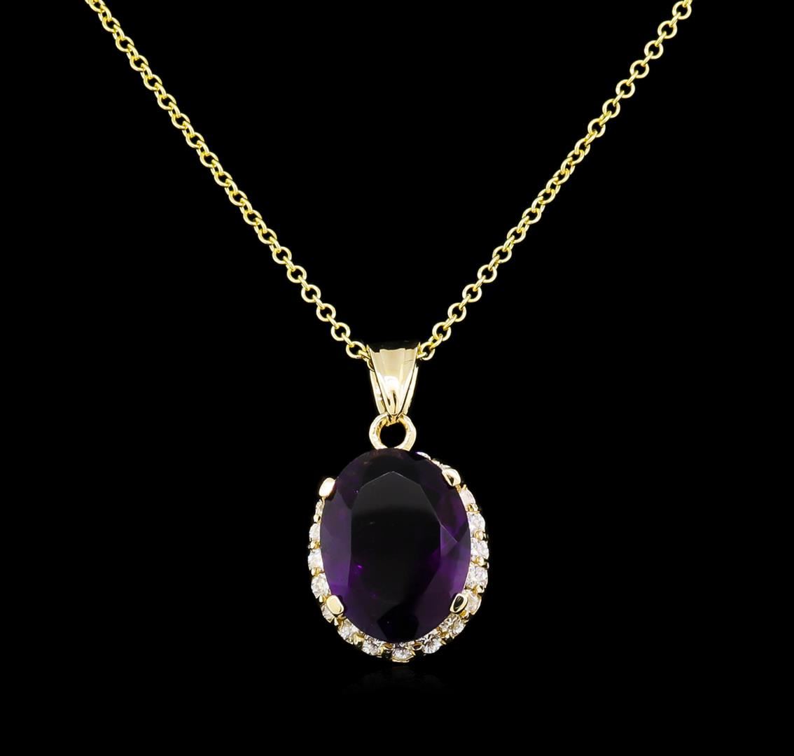 One pendant with chain featuring: 14KT yellow gold weighing 2.75 grams containing one amethyst with a total weight of 6.48ct and diamonds with a total weight of 0.65ct.