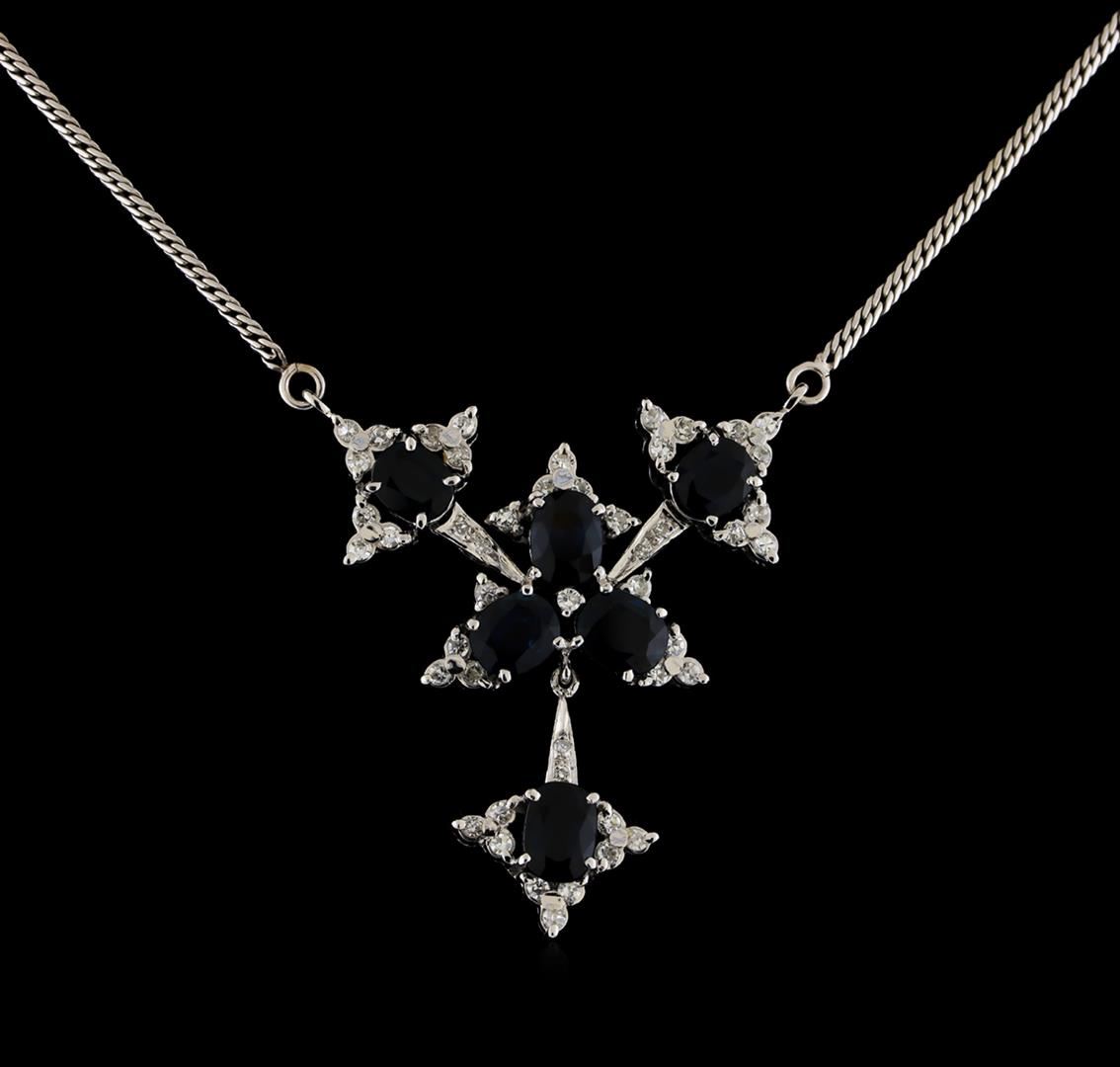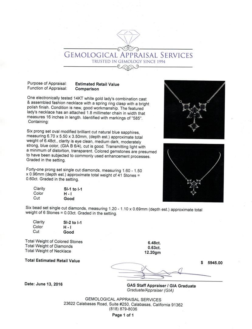 One electronically tested 14KT white gold lady's combination cast & assembled fashion necklace with a spring ring clasp with a bright polish finish. The featured lady's necklace has an attached 1.8 millimeter chain in width that measures 16 inches in length. Identified with markings of "585". Condition is new, good workmanship. Containing: Six prong set oval modified brilliant cut natural blue sapphires, measuring 6.70 x 5.50 x 3.50mm, (depth est.) approximate total weight of 6.48ct., clarity is eye clean, medium dark, moderately strong, blue color, (GIA B 6/4), cut is good. Transmitting light with a minimum of distortion, transparent. Colored gemstones are presumed to have been subjected to commonly used enhancement processes. Graded in the setting. Forty-One prong set single cut diamonds, measuring 1.60 - 1.50 x 0.96mm (depth est.) approximate total weight of 41 Stones = 0.60ct. Graded in the setting. Clarity: SI-1 to I-1. Color: H - I. Cut Good Six bead set single cut diamonds, measuring 1.20 - 1.10 x 0.69mm (depth est.) approximate total weight of 6 Stones = 0.03ct. Graded in the setting. Clarity: SI-2 to I-1. Color: H - I. Cut Good. Total Weight of Colored Stones 6.48ct. Total Weight of Diamonds 0.63ct. Total Weight of Necklace 12.20gm. GAS Appraised at $5,945.00.