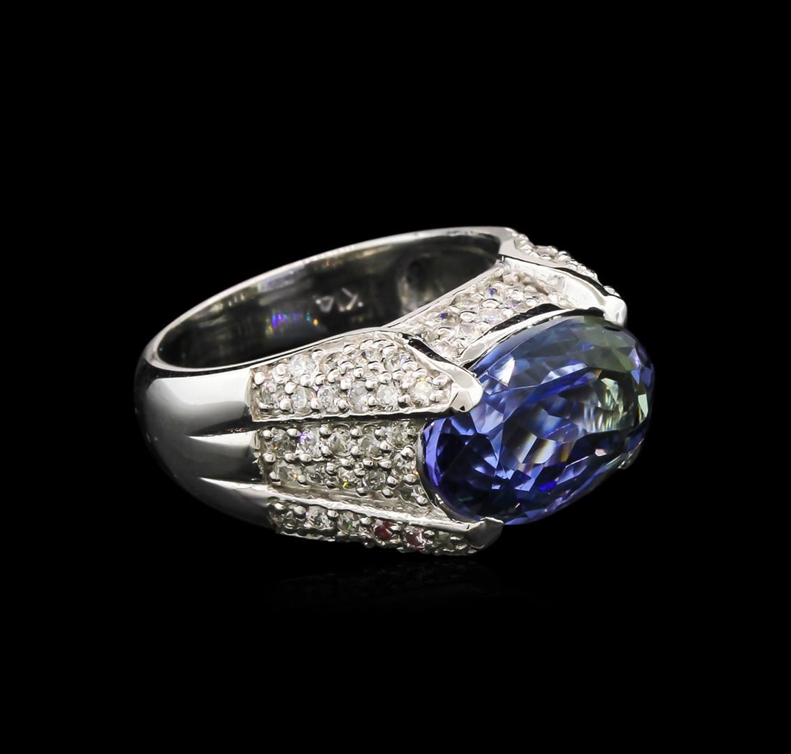 One electronically tested 14KT white gold lady's cast fashion ring with a tapered shank with a bright polish finish. The featured lady's ring has a 4.27 millimeter wide shank. Identified with markings of "K14". Condition is new, good workmanship. Containing: One prong set oval modified brilliant cut natural tanzanite, measuring 13.95 x 9.01 x 6.30mm, 15% bulge factor, approximate weight of 6.48ct., clarity is eye clean, type I, medium light, slightly grayish, bluish violet color, (GIA bV 4/2), cut is good. Transmitting light with no distortion, transparent. Colored gemstones are presumed to have been subjected to commonly used enhancement processes. Graded in the setting. Eighty-Two prong set round brilliant cut diamonds, measuring 1.50 - 1.40 x 0.94mm (depth est.) approximate total weight of 82 Stones = 1.00 ct. Graded in the setting. Clarity: SI-2 to I-1. Color: H - I. Cut Good. Total Weight of Colored Stones 6.48ct. Total Weight of Diamonds 1.00 ct. Total Weight of Ring 8.40gm. GAS Appraised.