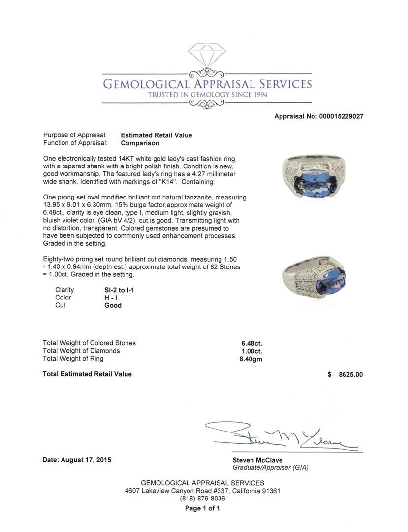 One electronically tested 14KT white gold lady's cast fashion ring with a tapered shank with a bright polish finish. The featured lady's ring has a 4.27 millimeter wide shank. Identified with markings of "K14". Condition is new, good workmanship. Containing: One prong set oval modified brilliant cut natural tanzanite, measuring 13.95 x 9.01 x 6.30mm, 15% bulge factor, approximate weight of 6.48ct., clarity is eye clean, type I, medium light, slightly grayish, bluish violet color, (GIA bV 4/2), cut is good. Transmitting light with no distortion, transparent. Colored gemstones are presumed to have been subjected to commonly used enhancement processes. Graded in the setting. Eighty-Two prong set round brilliant cut diamonds, measuring 1.50 - 1.40 x 0.94mm (depth est.) approximate total weight of 82 Stones = 1.00ct. Graded in the setting. Clarity: SI-2 to I-1. Color: H - I. Cut Good. Total Weight of Colored Stones 6.48ct. Total Weight of Diamonds 1.00ct. Total Weight of Ring 8.40gm. GAS Appraised at $8,625.00.