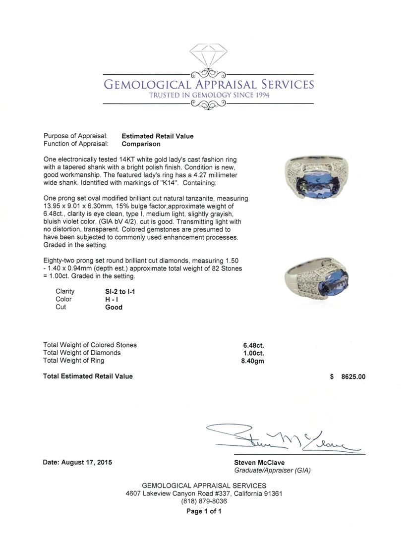 One electronically tested 14KT white gold lady's cast fashion ring with a tapered shank with a bright polish finish. The featured lady's ring has a 4.27 millimeter wide shank. Identified with markings of "K14". Condition is new, good workmanship. Containing: One prong set oval modified brilliant cut natural tanzanite, measuring 13.95 x 9.01 x 6.30mm, 15% bulge factor, approximate weight of 6.48ct., clarity is eye clean, type I, medium light, slightly grayish, bluish violet color, (GIA bV 4/2), cut is good. Transmitting light with no distortion, transparent. Colored gemstones are presumed to have been subjected to commonly used enhancement processes. Graded in the setting. Eighty-Two prong set round brilliant cut diamonds, measuring 1.50 - 1.40 x 0.94mm (depth est.) approximate total weight of 82 Stones = 1.00ct. Graded in the setting. Clarity: SI-2 to I-1. Color: H - I. Cut Good. Total Weight of Colored Stones 6.48ct. Total Weight of Diamonds 1.00ct. Total Weight of Ring 8.40gm. GAS Appraised at $8,625.00.