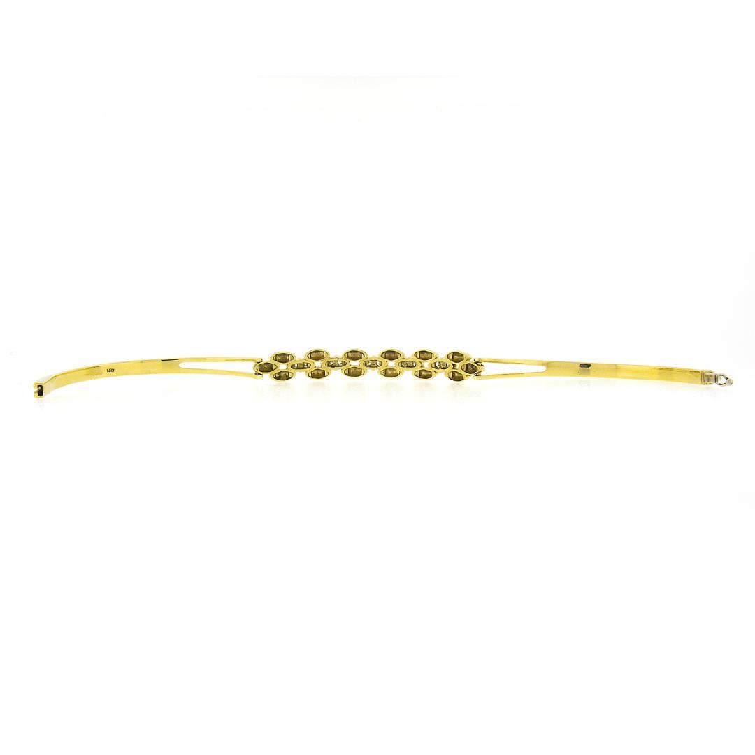 A solid 14k yellow gold open bangle bracelet, with 10 round brilliant cut natural diamonds (G/H - VS2/SI1 ; 0.60ctw). It weighs a total of 12.96 grams, measures 6.9mm wide, and measures 6.5 inches in length.