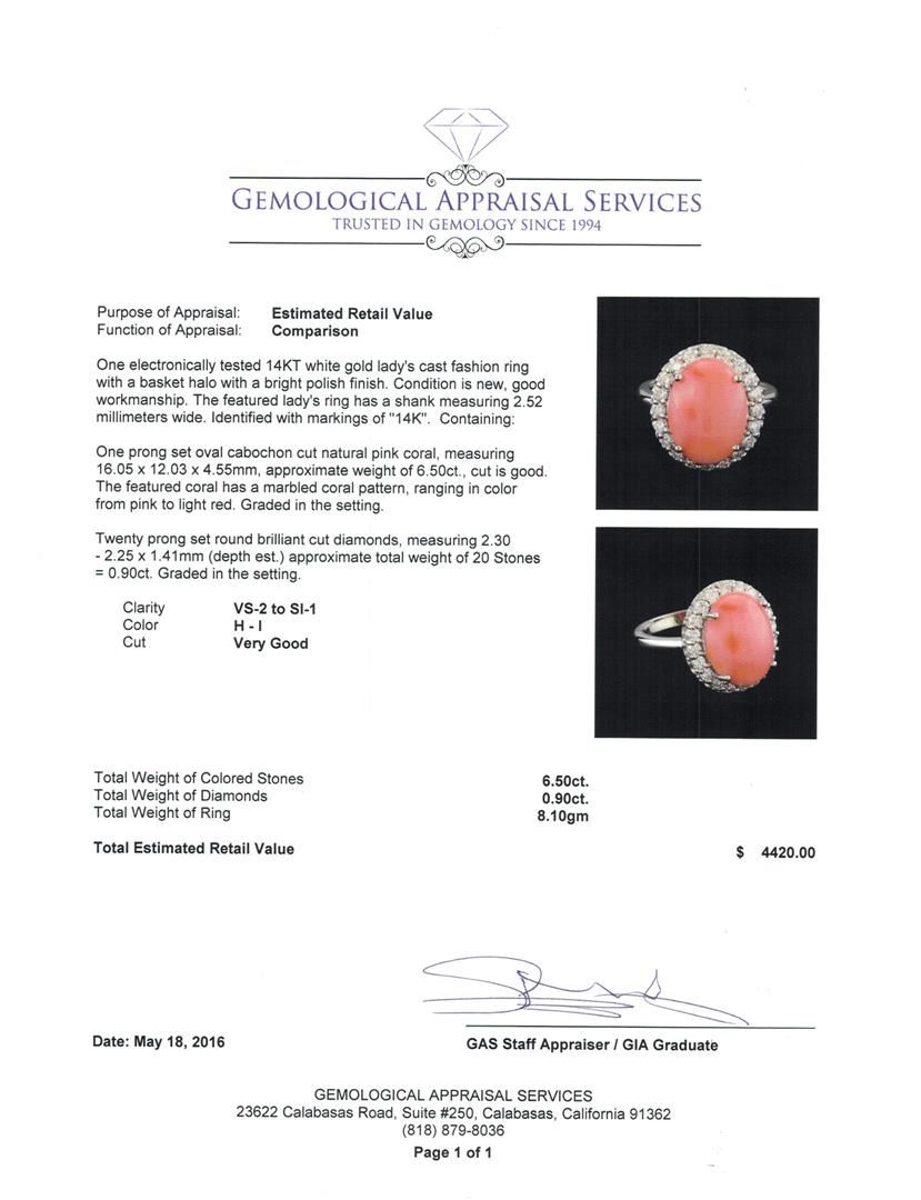 One electronically tested 14KT white gold lady's cast fashion ring with a basket halo with a bright polish finish. The featured lady's ring has a shank measuring 2.52 millimeters wide. Identified with markings of "14K". Condition is new, good workmanship. Containing: One prong set oval cabochon cut natural pink coral, measuring 16.05 x 12.03 x 4.55mm, approximate weight of 6.50ct., cut is good. The featured coral has a marbled coral pattern, ranging in color from pink to light red. Graded in the setting. Twenty prong set round brilliant cut diamonds, measuring 2.30 - 2.25 x 1.41mm (depth est.) approximate total weight of 20 Stones = 0.90ct. Graded in the setting. Clarity: VS-2 to SI-1. Color: H - I. Cut Very Good. Total Weight of Colored Stones 6.50ct. Total Weight of Diamonds 0.90ct. Total Weight of Ring 8.10gm. GAS Appraised at $4,420.00.
