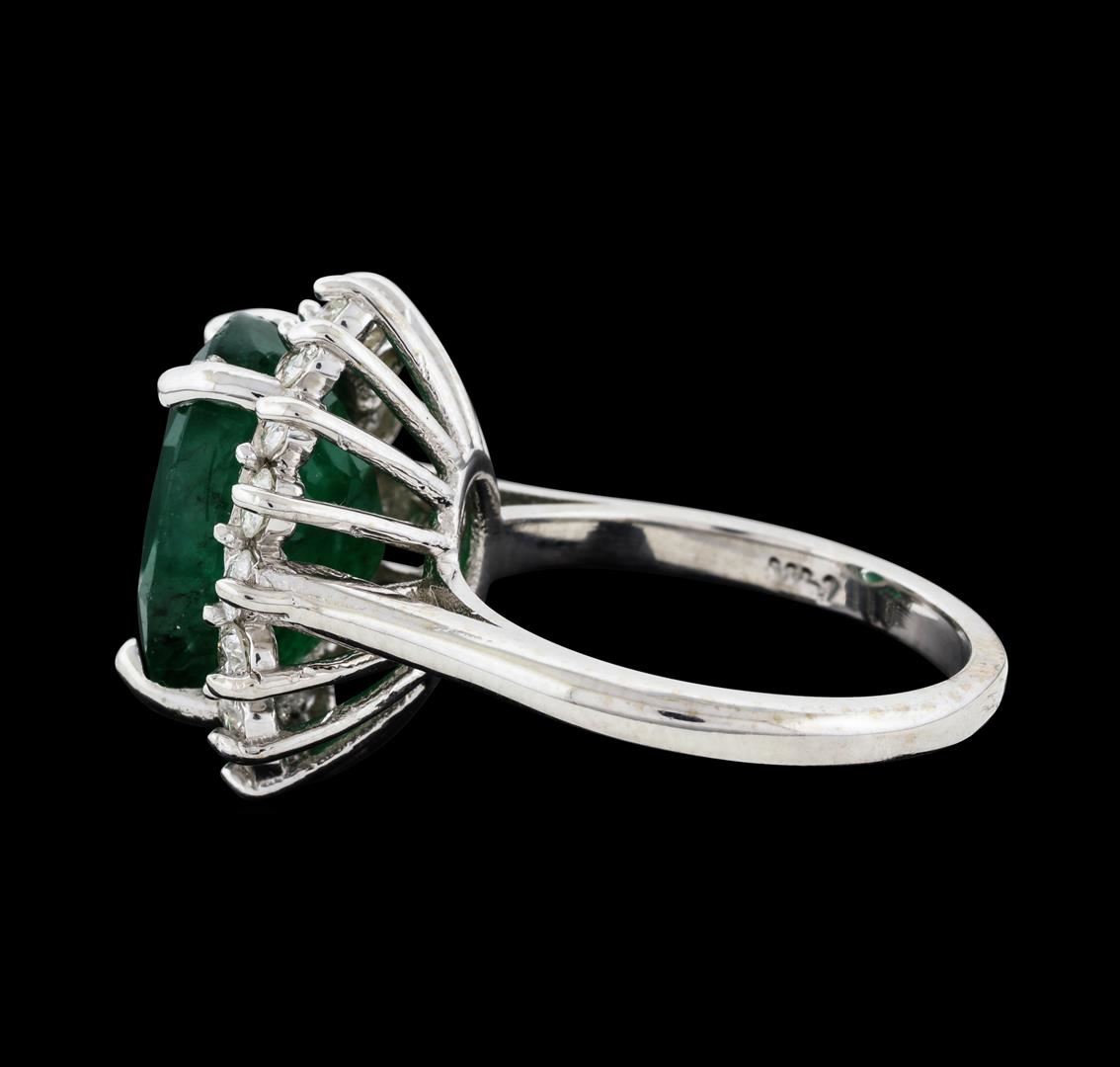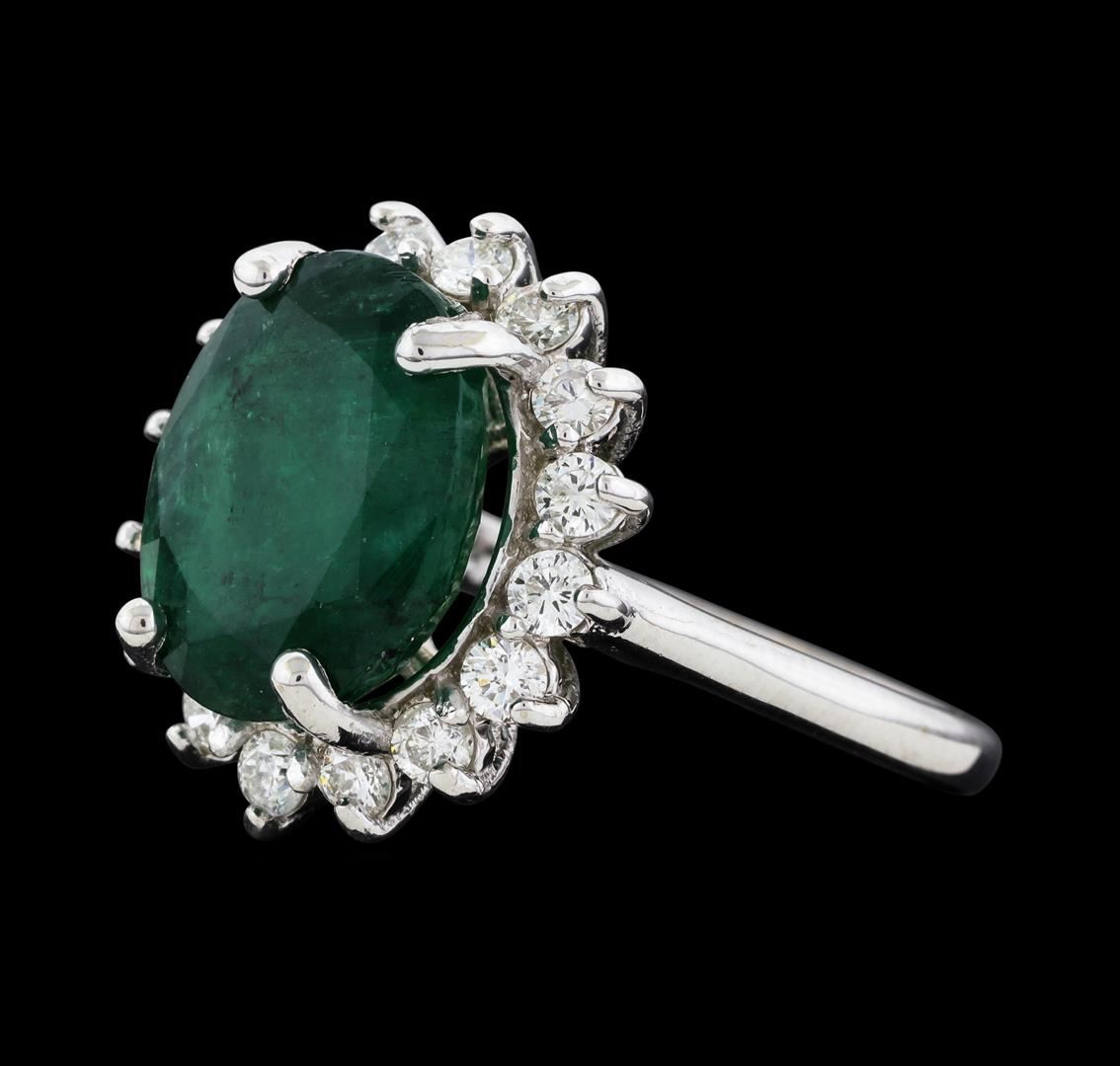 One electronically tested 14KT white gold lady's cast fashion ring with a basket halo with a bright polish finish. The featured lady's ring has a shank measuring 2.09 millimeters wide. Identified with markings of '14K'. Condition is new, good workmanship. Containing: One prong set oval modified mixed cut natural emerald, measuring 13.28 x 10.32 x 7.44mm, (depth est.) 12%. bulge factor, approximate weight of 6.51ct., clarity is heavily included, medium dark, moderately strong, green color, (GIA G 6/4), cut is good. Transmitting light somewhat diffusely, semi-transparent to translucent. Naturally occurring internal & external characteristics are present. Indications of oil residue. Colored gemstones are presumed to have been subjected to commonly used enhancement processes. Graded in the setting. Sixteen prong set round brilliant cut diamonds, measuring 2.40 - 2.30 x 1.46mm (depth est.) approximate total weight of 16 Stones = 0.80ct. Graded in the setting. Clarity SI-1 to SI-3. Color: G - H Cut Good. Total Weight of Colored Stones 6.51ct.. Total Weight of Diamonds 0.80ct.. Total Weight of Ring 6.90gm. GAS Appraised at $9,765.00.