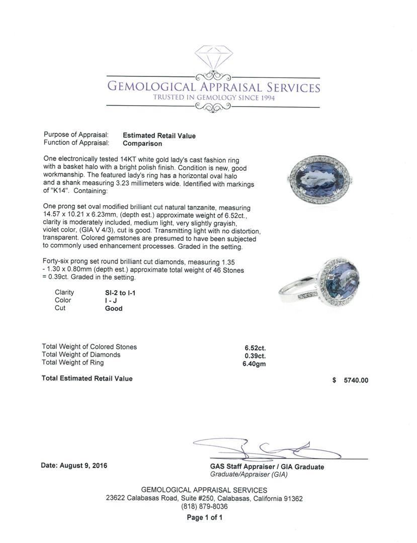 One electronically tested 14KT white gold lady's cast fashion ring with a basket halo with a bright polish finish. The featured lady's ring has a horizontal oval halo and a shank measuring 3.23 millimeters wide. Identified with markings of 'K14'. Condition is new, good workmanship. Containing: One prong set oval modified brilliant cut natural tanzanite, measuring 14.57 x 10.21 x 6.23mm, (depth est.) approximate weight of 6.52ct., clarity is moderately included, medium light, very slightly grayish, violet color, (GIA V 4/3), cut is good. Transmitting light with no distortion, transparent. Colored gemstones are presumed to have been subjected to commonly used enhancement processes. Graded in the setting. Forty-Six prong set round brilliant cut diamonds, measuring 1.35 - 1.30 x 0.80mm (depth est.) approximate total weight of 46 Stones = 0.39ct. Graded in the setting. Clarity SI-2 to I-1. Color: I - J Cut Good. Total Weight of Colored Stones 6.52ct.. Total Weight of Diamonds 0.39ct.. Total Weight of Ring 6.40gm. GAS Appraised.