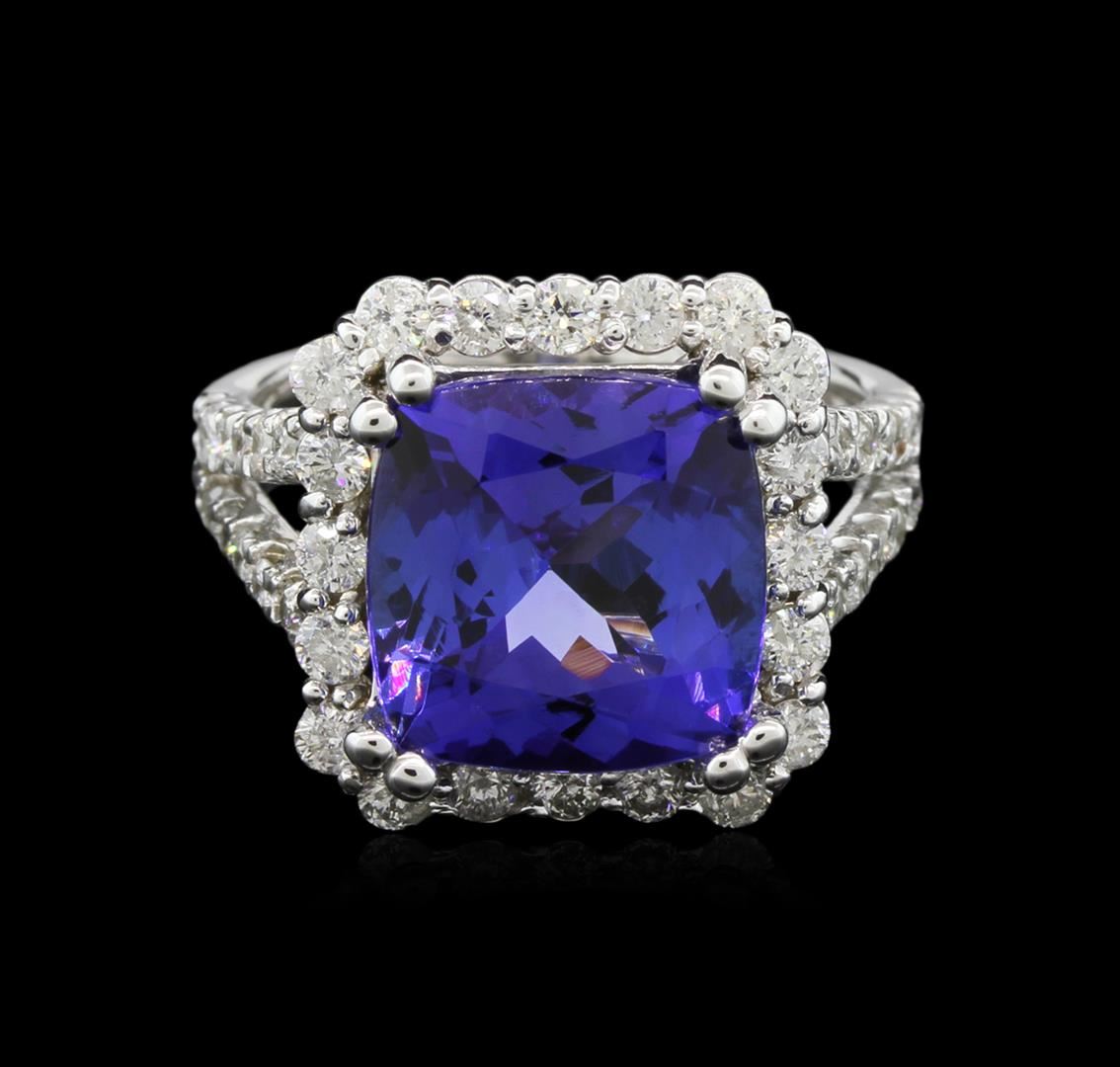 One electronically tested 14KT white gold ladies cast tanzanite and diamond ring with a bright polish finish. The featured tanzanite is set within a diamond bezel supported by diamond set split shoulders, completed by a grooved three and one-half millimeter wide band. Identified with markings of "K14". Condition is new, good workmanship. Containing: One prong set square cushion mixed cut natural tanzanite, measuring 10.90 x 10.80 x 6.78mm, exact weight 6.52ct., clarity is eye clean, type I, dark, very slightly grayish, violetish blue color, (GIA vB 7/3), cut is good. Transmitting light with no distortion, transparent. Colored Stone Grading Report attached. Graded in the setting. Tanzanite is a very rare gemstone that is only found in the country of Tanzania. Originally discovered in 1967. Tiffany & Company, named the stone Tanzanite. It is found in the Usumburu Mountains that border the Umba Valley of northern Tanzania. Tanzanite occurs in gray, brown, violet, blue, reddish-purple, & green. The gem is interesting because of its exceptional pleochroism. Rotated in different directions a tanzanite will exhibit multiple changes of color. Tanzanite has a low tolerance to ultrasonic cleaning, and should not be cleaned using this method. Forty-Eight prong set round brilliant cut diamonds exact total weight 48 Stones = 1.20ct. Graded in the setting. Clarity: SI-2 to I-1. Color: G - I. Total Weight of Colored Stones 6.52ct. Total Weight of Diamonds 1.20ct. Total Weight of Ring 8.72gm. AIG Appraised at $19,165.00.