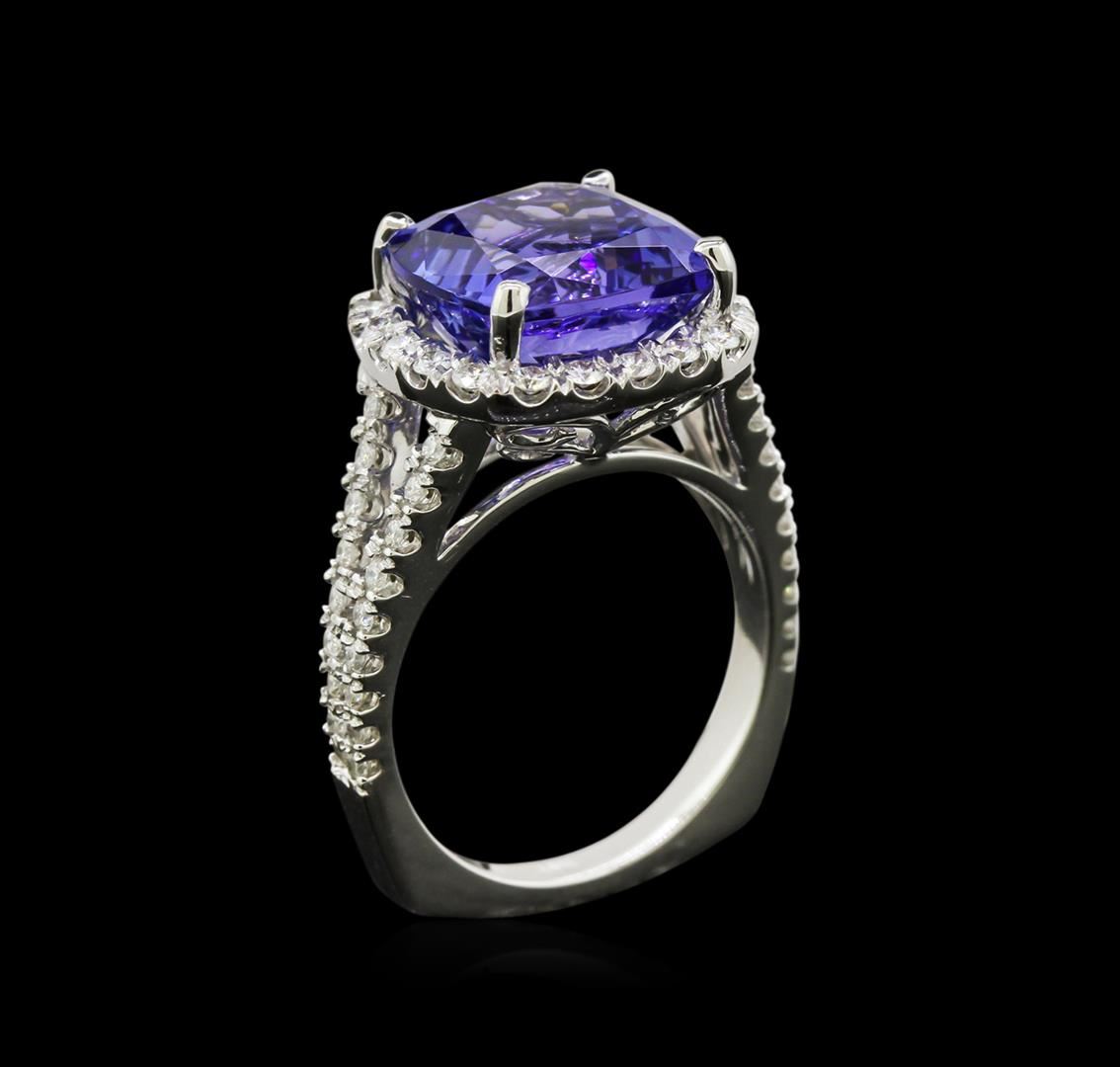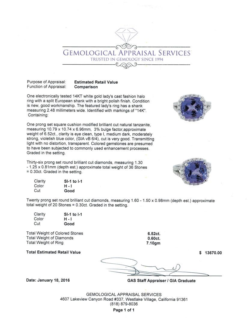 One electronically tested 14KT white gold lady's cast fashion halo ring with a split European shank with a bright polish finish. The featured lady's ring has a shank measuring 2.48 millimeters wide. Identified with markings of "14K". Condition is new, good workmanship. Containing: One prong set square cushion modified brilliant cut natural tanzanite, measuring 10.79 x 10.74 x 6.96mm, 3%. bulge factor, approximate weight of 6.52ct., clarity is eye clean, type I, medium dark, moderately strong, violetish blue color, (GIA vB 6/4), cut is very good. Transmitting light with no distortion, transparent. Colored gemstones are presumed to have been subjected to commonly used enhancement processes. Graded in the setting. Thirty-Six prong set round brilliant cut diamonds, measuring 1.30 - 1.25 x 0.81mm (depth est.) approximate total weight of 36 Stones = 0.30ct. Graded in the setting. Clarity: SI-1 to I-1. Color: H - I. Cut Good Twenty prong set round brilliant cut diamonds, measuring 1.60 - 1.50 x 0.98mm (depth est.) approximate total weight of 20 Stones = 0.30ct. Graded in the setting. Clarity: SI-1 to I-1. Color: H - I. Cut Good. Total Weight of Colored Stones 6.52ct. Total Weight of Diamonds 0.60ct. Total Weight of Ring 7.10gm. GAS Appraised at $13,670.00.