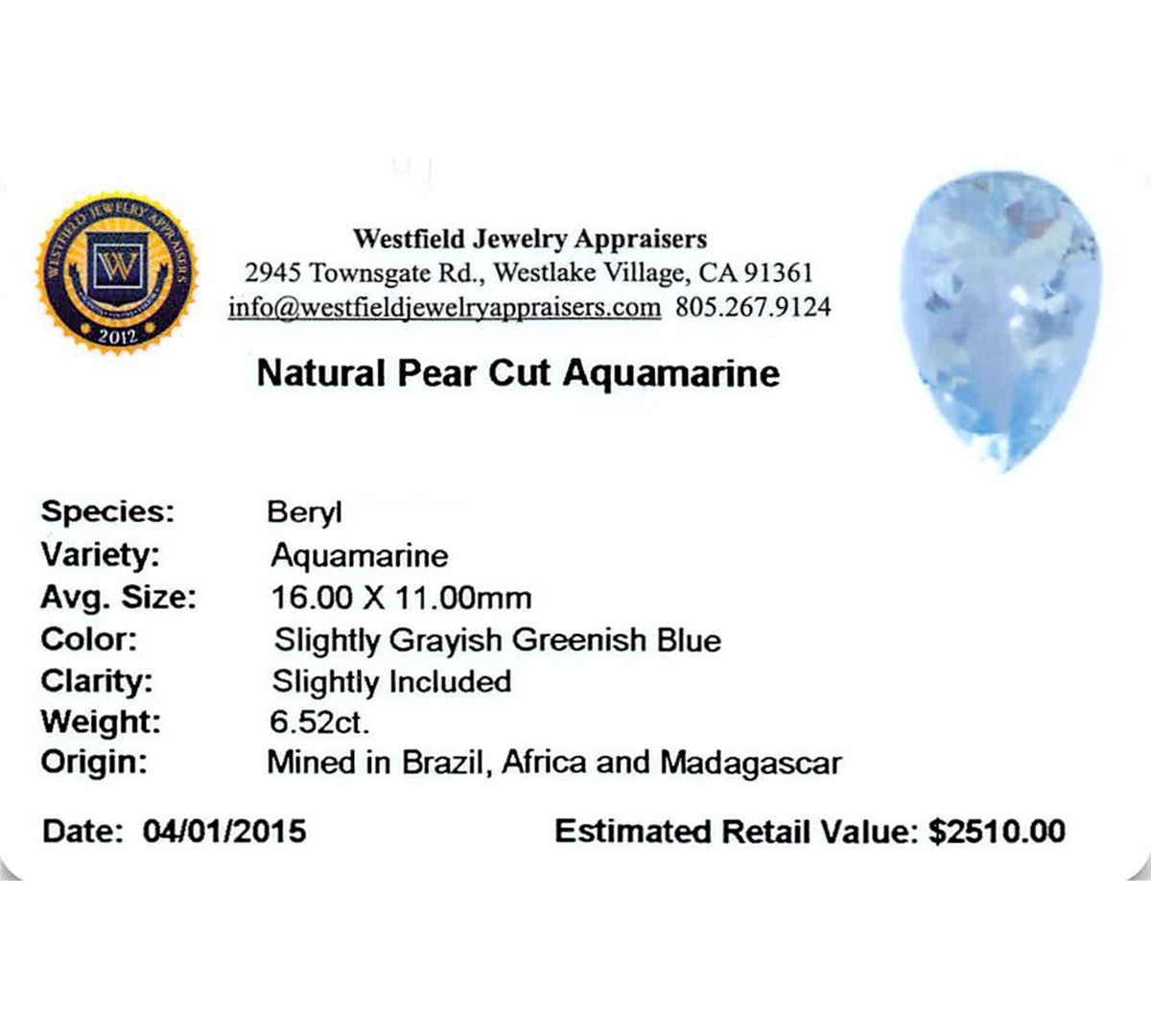 One pear cut natural aquamarine exact weight 6.52ct., clarity is slightly included, type I, medium, slightly grayish, very slightly greenish blue color, (GIA vslgB 5/2), cut is good. Westfield Appraised at $2,510.00.