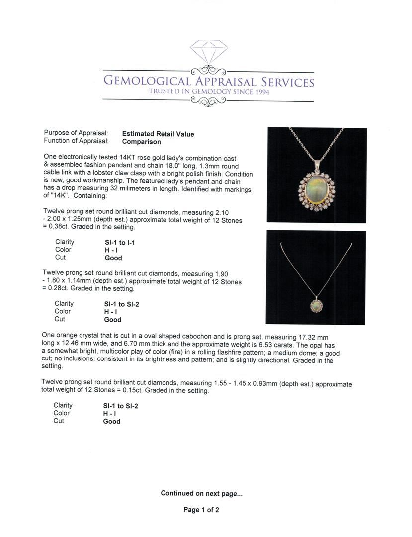 One electronically tested 14KT rose gold lady's combination cast & assembled fashion pendant and chain 18.0' long, 1.3mm round cable link with a lobster claw clasp with a bright polish finish. The featured lady's pendant and chain has a drop measuring 32 millimeters in length. Identified with markings of '14K'. Condition is new, good workmanship. Containing: Twelve prong set round brilliant cut diamonds, measuring 2.10 - 2.00 x 1.25mm (depth est.) approximate total weight of 12 Stones = 0.38ct. Graded in the setting. Clarity SI-1 to I-1. Color: H - I Cut Good Twelve prong set round brilliant cut diamonds, measuring 1.90 - 1.80 x 1.14mm (depth est.) approximate total weight of 12 Stones = 0.28ct. Graded in the setting. Clarity SI-1 to SI-2. Color: H - I Cut Good One orange crystal that is cut in a oval shaped cabochon and is prong set, measuring 17.32 mm long x 12.46 mm wide, and 6.70 mm thick and the approximate weight is 6.53 carats. The opal has a somewhat bright, multicolor play of color (fire) in a rolling flashfire pattern; a medium dome; a good cut; no inclusions; consistent in its brightness and pattern; and is slightly directional. Graded in the setting. Twelve prong set round brilliant cut diamonds, measuring 1.55 - 1.45 x 0.93mm (depth est.) approximate total weight of 12 Stones = 0.15ct. Graded in the setting. Clarity SI-1 to SI-2. Color: H - I Cut Good. Total Weight of Diamonds 0.81ct.. Total Weight of Opals 6.53ct.. Total Weight of Pendant And Chain 5.80gm. GAS Appraised at $5,520.00.