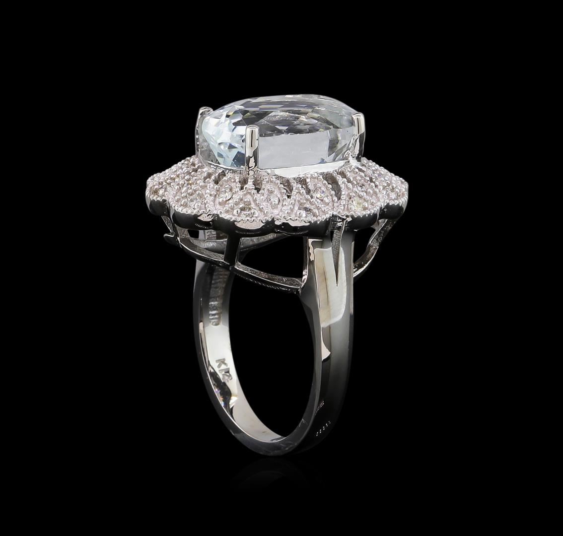 One electronically tested 14KT white gold lady's cast fashion ring with a scalloped basket halo with a bright polish with milgrain detailing finish. The featured lady's ring has a shank measuring 2.50 millimeters wide. Identified with markings of "K14". Condition is new, good workmanship. Containing: One prong set oval modified brilliant cut natural aquamarine, measuring 14.28 x 9.01 x 7.25mm, 22%. bulge factor, approximate weight of 6.54ct., clarity is eye clean, type I, very light, moderately strong, blue color, (GIA B 2/4), cut is good. Transmitting light with no distortion, transparent. Colored gemstones are presumed to have been subjected to commonly used enhancement processes. Graded in the setting. Twelve prong set round brilliant cut diamonds, measuring 1.40 - 1.35 x 0.90mm (depth est.) approximate. Total Weight of 12 Stones = 0.13ct. Graded in the setting. Clarity: SI-1 to SI-2. Color: G - Good Twelve prong set round brilliant cut diamonds, measuring 1.20 - 1.10 x 0.71mm (depth est.) approximate. Total Weight of 12 Stones = 0.07ct. Graded in the setting. Clarity: VS-2 to SI-1. Color: G - Good. Total Weight of Colored Stones 6.54ct. Total Weight of Diamonds 0.20ct. Total Weight of Ring 9.30gm. GAS Appraised at $11,835.00.