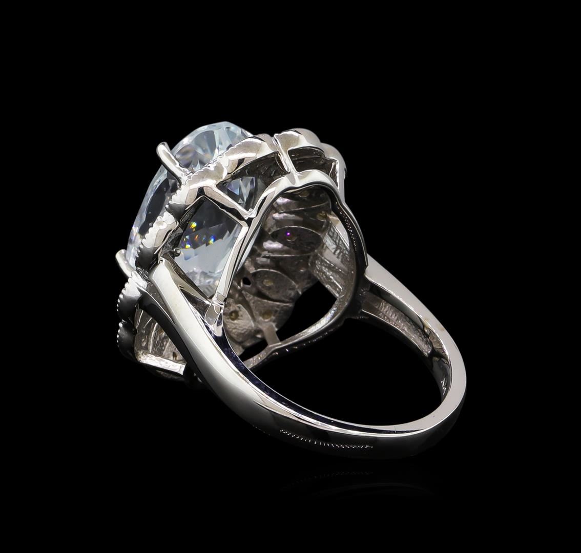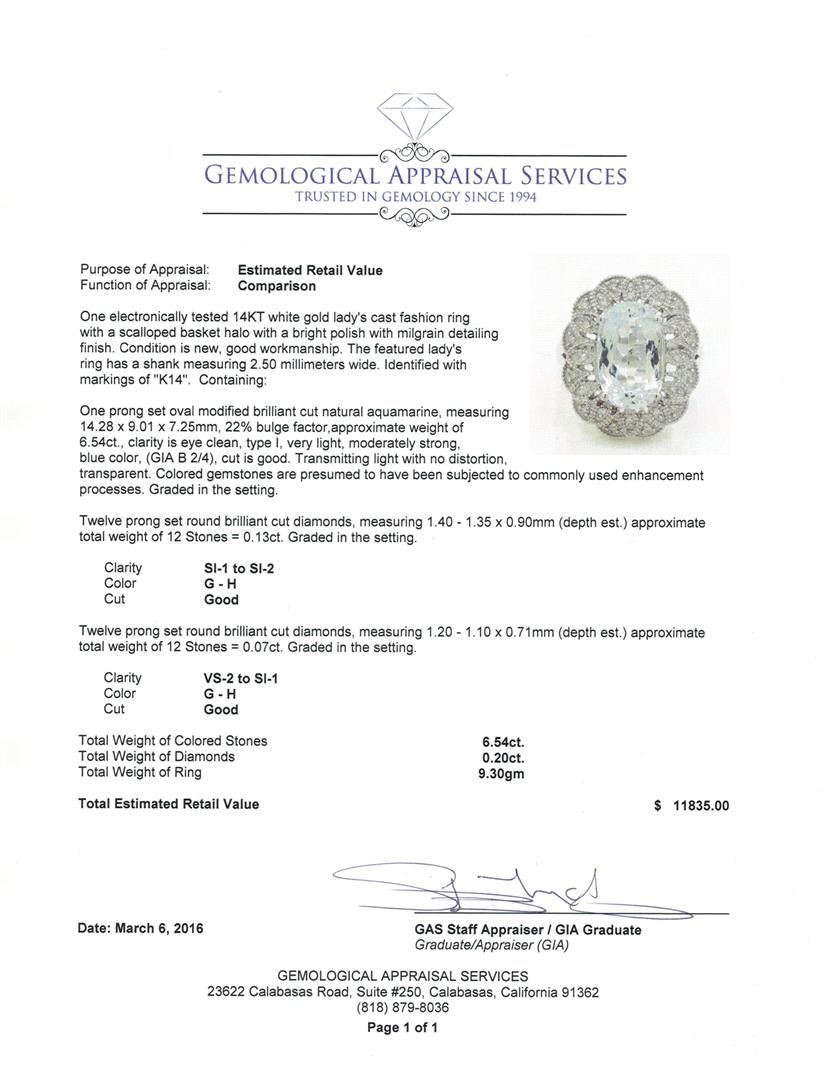 One electronically tested 14KT white gold lady's cast fashion ring with a scalloped basket halo with a bright polish with milgrain detailing finish. The featured lady's ring has a shank measuring 2.50 millimeters wide. Identified with markings of "K14". Condition is new, good workmanship. Containing: One prong set oval modified brilliant cut natural aquamarine, measuring 14.28 x 9.01 x 7.25mm, 22%. bulge factor, approximate weight of 6.54ct., clarity is eye clean, type I, very light, moderately strong, blue color, (GIA B 2/4), cut is good. Transmitting light with no distortion, transparent. Colored gemstones are presumed to have been subjected to commonly used enhancement processes. Graded in the setting. Twelve prong set round brilliant cut diamonds, measuring 1.40 - 1.35 x 0.90mm (depth est.) approximate. Total Weight of 12 Stones = 0.13ct. Graded in the setting. Clarity: SI-1 to SI-2. Color: G - Good Twelve prong set round brilliant cut diamonds, measuring 1.20 - 1.10 x 0.71mm (depth est.) approximate. Total Weight of 12 Stones = 0.07ct. Graded in the setting. Clarity: VS-2 to SI-1. Color: G - Good. Total Weight of Colored Stones 6.54ct. Total Weight of Diamonds 0.20ct. Total Weight of Ring 9.30gm. GAS Appraised at $11,835.00.