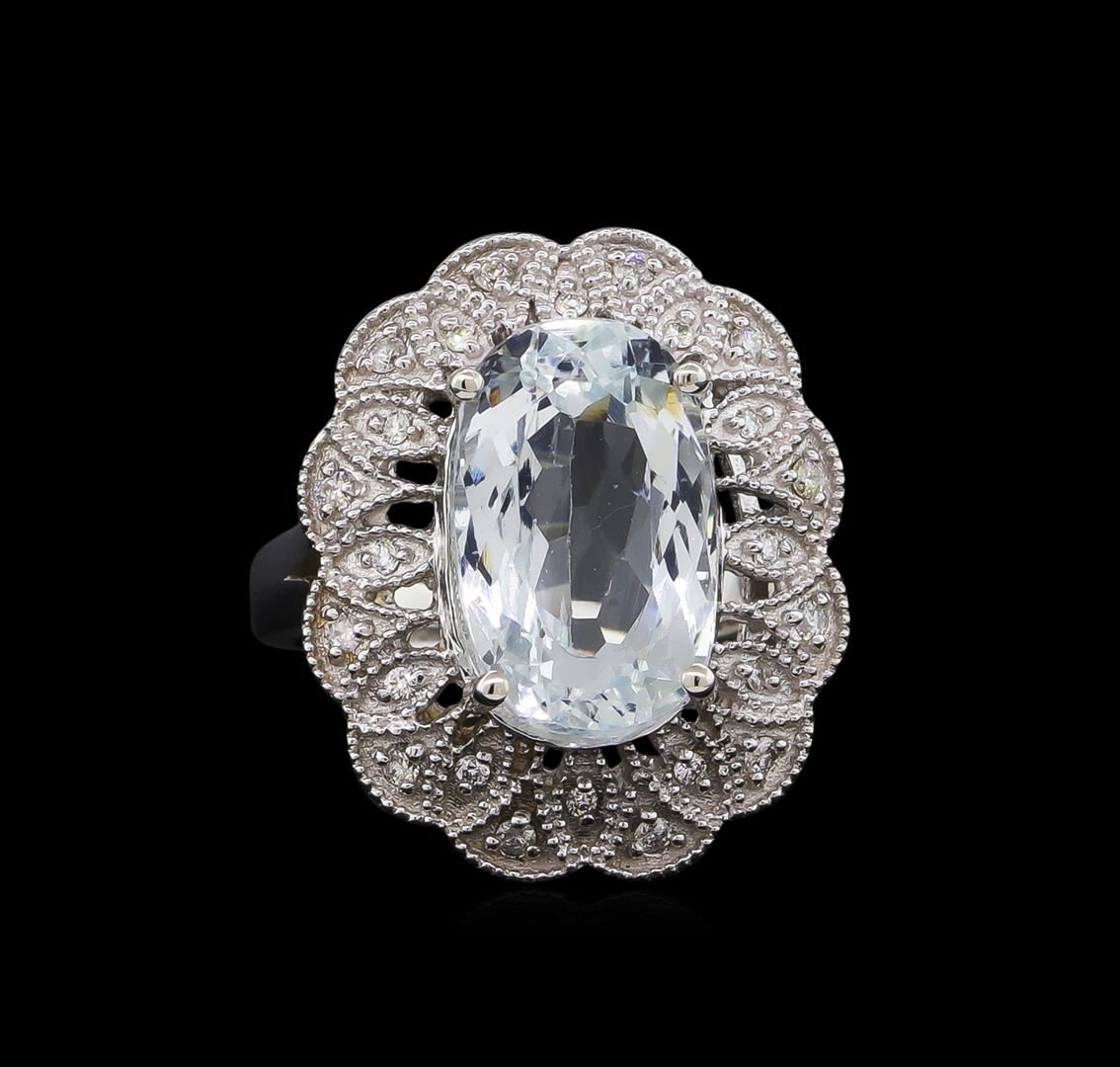 One electronically tested 14KT white gold lady's cast fashion ring with a scalloped basket halo with a bright polish with milgrain detailing finish. The featured lady's ring has a shank measuring 2.50 millimeters wide. Identified with markings of "K14". Condition is new, good workmanship. Containing: One prong set oval modified brilliant cut natural aquamarine, measuring 14.28 x 9.01 x 7.25mm, 22%. bulge factor, approximate weight of 6.54ct., clarity is eye clean, type I, very light, moderately strong, blue color, (GIA B 2/4), cut is good. Transmitting light with no distortion, transparent. Colored gemstones are presumed to have been subjected to commonly used enhancement processes. Graded in the setting. Twelve prong set round brilliant cut diamonds, measuring 1.40 - 1.35 x 0.90mm (depth est.) approximate. Total Weight of 12 Stones = 0.13ct. Graded in the setting. Clarity: SI-1 to SI-2. Color: G - Good Twelve prong set round brilliant cut diamonds, measuring 1.20 - 1.10 x 0.71mm (depth est.) approximate. Total Weight of 12 Stones = 0.07ct. Graded in the setting. Clarity: VS-2 to SI-1. Color: G - Good. Total Weight of Colored Stones 6.54ct. Total Weight of Diamonds 0.20ct. Total Weight of Ring 9.30gm. GAS Appraised at $11,835.00.