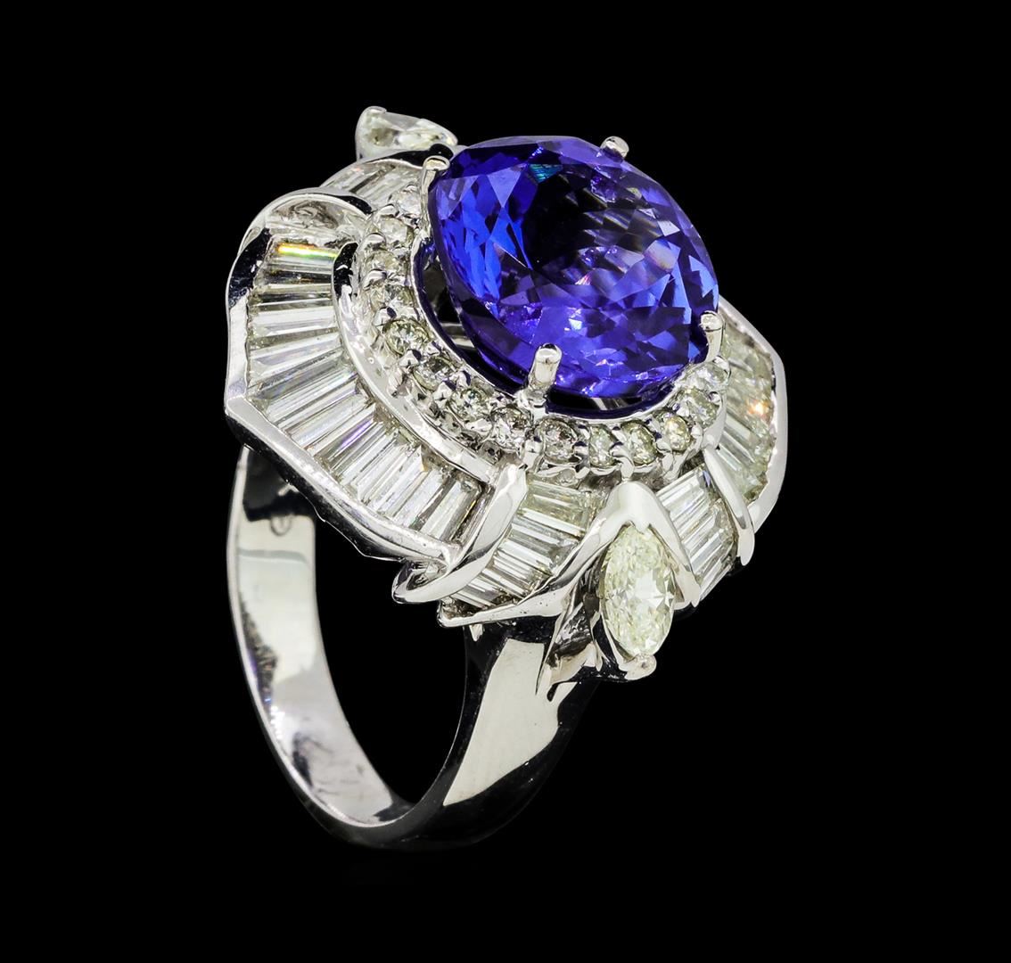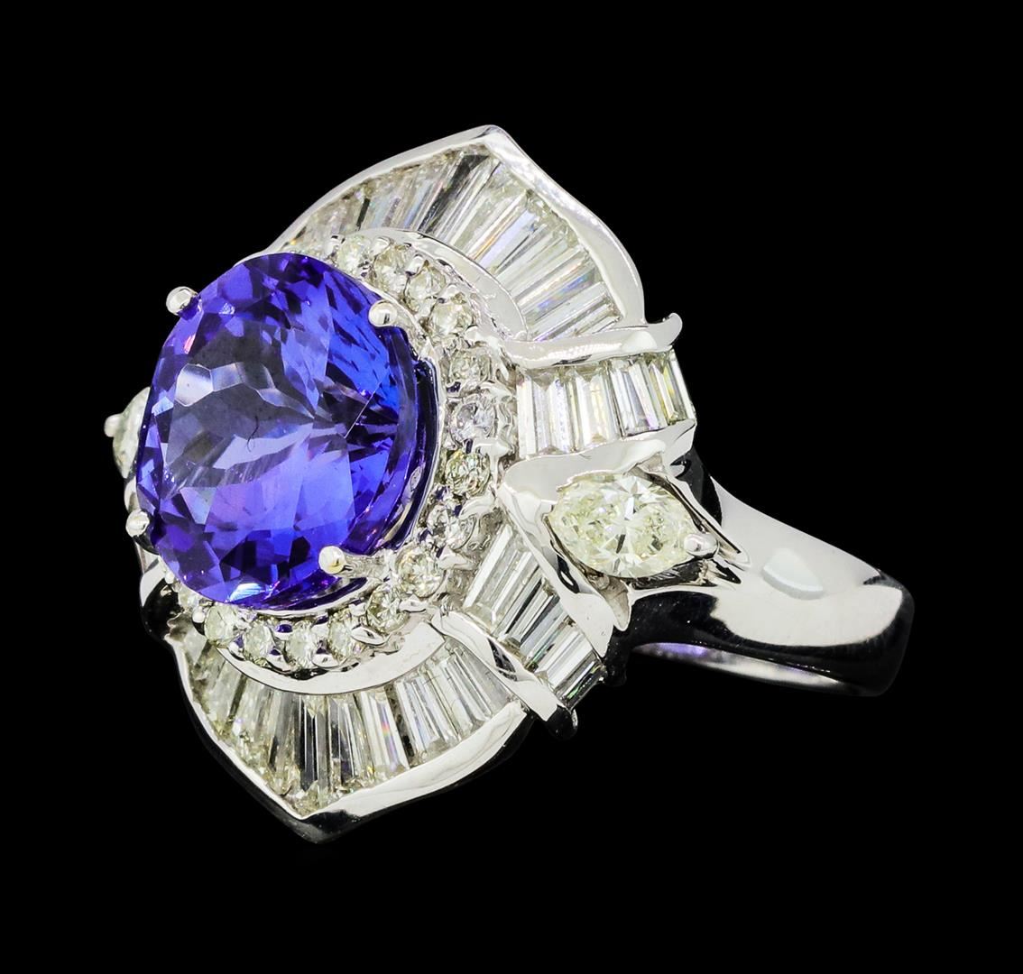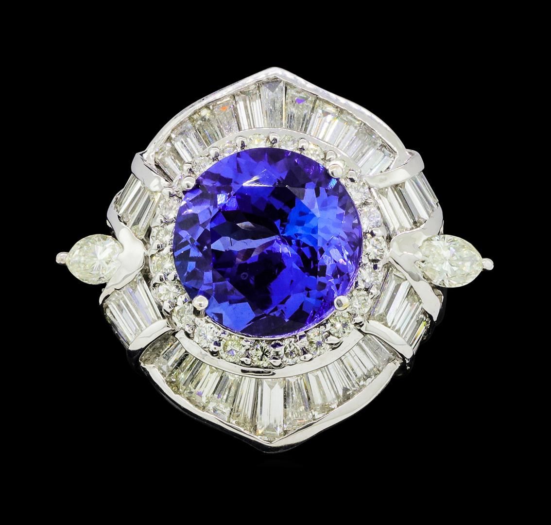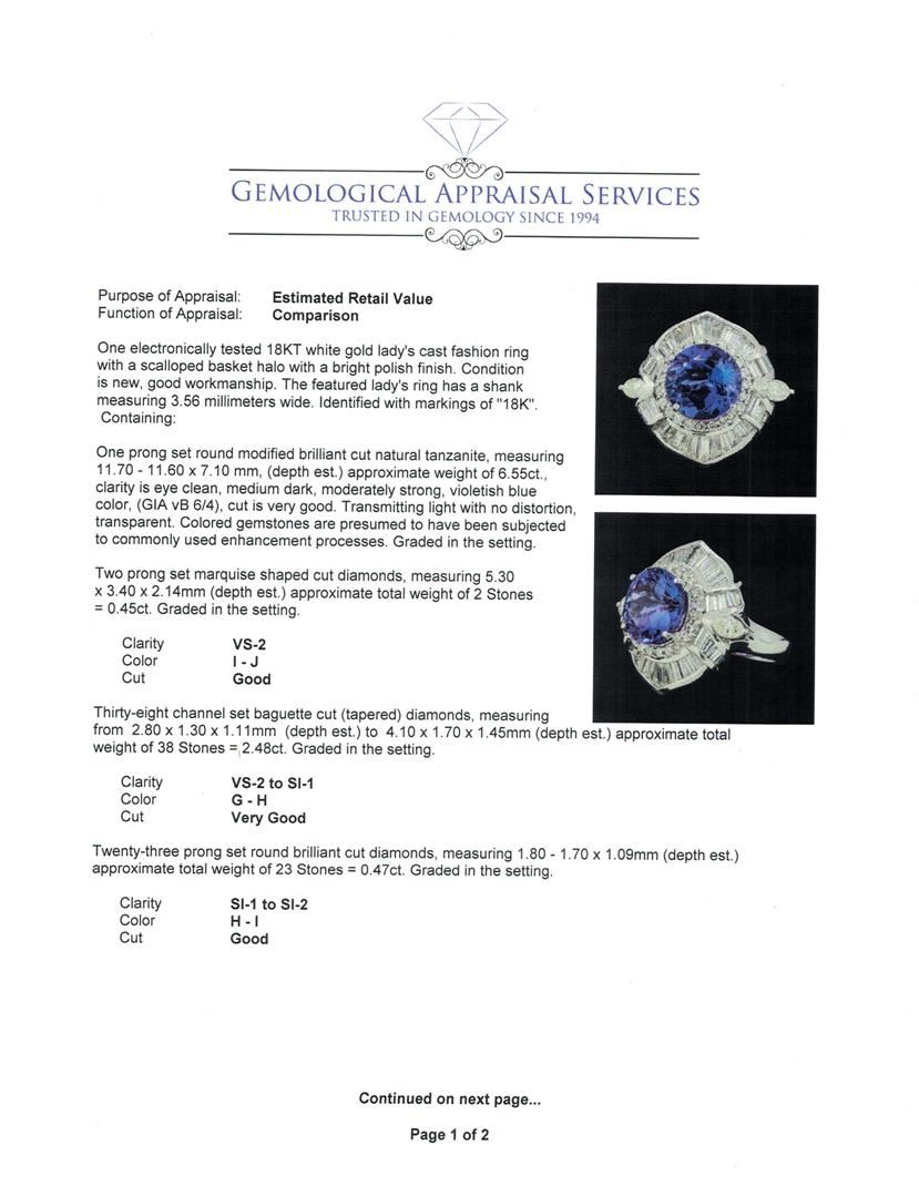 One electronically tested 18KT white gold lady's cast fashion ring with a scalloped basket halo with a bright polish finish. The featured lady's ring has a shank measuring 3.56 millimeters wide. Identified with markings of '18K'. Condition is new, good workmanship. Containing: One prong set round modified brilliant cut natural tanzanite, measuring 11.70 - 11.60 x 7.10 mm, (depth est.) approximate weight of 6.55ct., clarity is eye clean, medium dark, moderately strong, violetish blue color, (GIA vB 6/4), cut is very good. Transmitting light with no distortion, transparent. Colored gemstones are presumed to have been subjected to commonly used enhancement processes. Graded in the setting. Two prong set marquise shaped cut diamonds, measuring 5.30 x 3.40 x 2.14mm (depth est.) approximate total weight of 2 Stones = 0.45ct. Graded in the setting. Color I - J Clarity VS-2 Cut Good Thirty-Eight channel set baguette cut (tapered) diamonds, measuring from 2.80 x 1.30 x 1.11mm (depth est.) to 4.10 x 1.70 x 1.45mm (depth est.) approximate total weight of 38 Stones = 2.48ct. Graded in the setting. Color G - H Clarity VS-2 to SI-1 Cut Very Good Twenty-Three prong set round brilliant cut diamonds, measuring 1.80 - 1.70 x 1.09mm (depth est.) approximate total weight of 23 Stones = 0.47ct. Graded in the setting. Color H - I Clarity SI-1 to SI-2 Cut Good. Total Weight of Colored Stones 6.55ct.. Total Weight of Diamonds 3.40ct.. Total Weight of Ring 13.10gm GAS Appraised at $21020.00. GAS Appraised at $21,020.00.