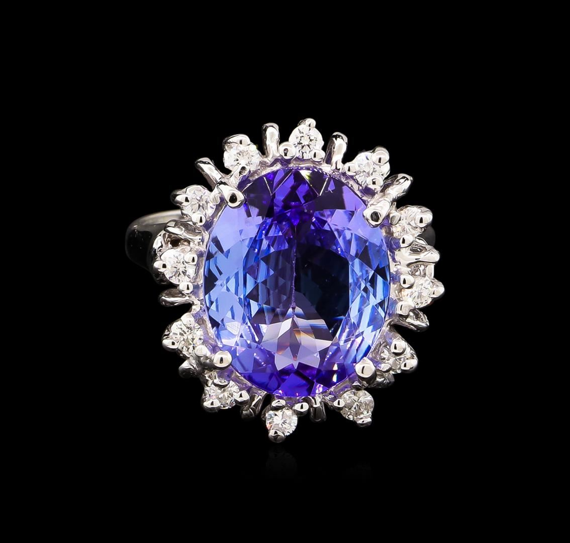 One electronically tested 14KT white gold lady's cast fashion ring with a basket halo with a bright polish finish. The featured lady's ring has a shank measuring 2.20 millimeters wide. Identified with markings of "14K". Condition is new, good workmanship. Containing: One prong set oval modified brilliant cut natural tanzanite, measuring 14.60 x 11.50 x 5.46mm, approximate weight of 6.55ct., clarity is eye clean, type I, light, moderately strong, violetish blue color, (GIA vB 3/4), cut is very good. Transmitting light with no distortion, transparent. Colored gemstones are presumed to have been subjected to commonly used enhancement processes. Graded in the setting. Twelve prong set round brilliant cut diamonds, measuring 2.10 - 2.00 x 1.23mm (depth est.) approximate total weight of 12 Stones = 0.36ct. Graded in the setting. Clarity: SI-1 to I-1. Color: H - I. Cut Good. Total Weight of Colored Stones 6.55ct. Total Weight of Diamonds 0.36ct. Total Weight of Ring 7.40gm. GAS Appraised at $9,335.00.