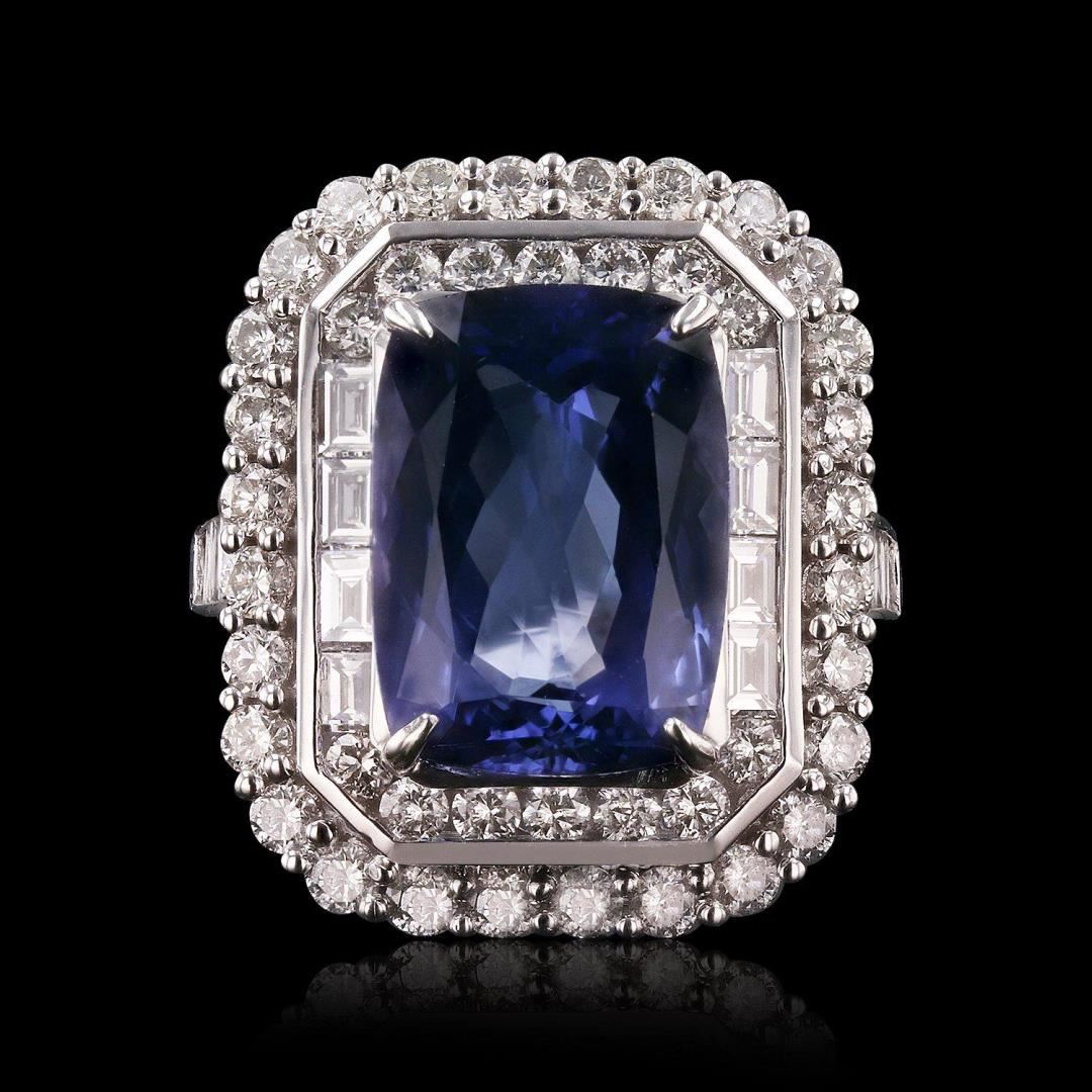One electronically tested 18KT white gold ladies cast and assembled tanzanite and diamond ring. Condition is new, good workmanship. The featured tanzanite is set within tiered diamond bezels supported by a ribbed under gallery and diamond set shoulders, completed by a three millimeter wide band. Bright polish finish. Trademark is UCG. Identified with markings of "18K 750". Containing: One prong set cushion modified brilliant cut natural tanzanite, measuring 13.39 x 9.80 x 5.82mm, exact weight 6.58ct., type I Clarity is eye clean, medium dark, very slightly grayish, blue-violet color, (GIA BV 6/3), cut is good. Transmitting light with no distortion, transparent. GIA Gemological Report attached. Graded loose prior to setting in the GIA Laboratory, Report #2171872251. Tanzanite is a very rare gemstone that is only found in the country of Tanzania. Originally discovered in 1967. Tiffany and Company, named the stone Tanzanite. It is found in the Usumburu Mountains that border the Umba Valley of northern Tanzania. Tanzanite occurs in gray, brown, violet, blue, reddish-purple, and green. The gem is interesting because of its exceptional pleochroism. Rotated in different directions a tanzanite will exhibit multiple changes of color. Tanzanite has a low tolerance to ultrasonic cleaning, and should not be cleaned using this method. Forty-two prong and channel set round brilliant cut diamonds, measuring 2.00 - 2.00 x 1.20mm (depth est.) approximate total weight of 42 Stones = 1.23ct. Graded in the setting. Clarity SI-2 to I-2 Color G - H Twenty-four prong set baguette cut diamonds approximate total weight of 24 Stones = 1.01ct. Graded in the setting. Clarity VS-2 to SI-2 Color F - H Total Weight of Colored Stones 6.58ct. Total Weight of Diamonds 2.24ct. Total Weight of Ring 8.50 gm Size: 7