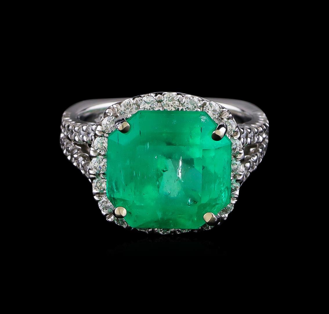 One electronically tested 14KT white gold lady's cast fashion ring with a split shank basket halo with a bright polish finish. The featured lady's ring has a European shank measuring 2.56 millimeters in width. Identified with markings of "14K". Condition is new, good workmanship. Containing: One prong set square emerald step cut natural emerald, measuring 11.52 x 11.27 x 8.64mm, (depth est.) approximate weight of 6.60ct., clarity is heavily included, medium light, moderately strong, green color, (GIA G 4/4), cut is good. Transmitting light somewhat diffusely, transparent to translucent. Colored gemstones are presumed to have been subjected to commonly used enhancement processes. Indications of oil residue. Graded in the setting. Twenty prong set round brilliant cut diamonds, measuring 1.70 - 1.65 x 1.06mm (depth est.) approximate total weight of 20 Stones = 0.38ct. Graded in the setting. Clarity: VS-2 to SI-2. Color: G - Good Thirty-Six prong set round brilliant cut diamonds, measuring 1.60 - 1.30 x 0.90mm (depth est.) approximate total weight of 36 Stones = 0.41ct. Graded in the setting. Clarity: SI-1 to SI-2. Color: G - Good. Total Weight of Colored Stones 6.60ct. Total Weight of Diamonds 0.79ct. Total Weight of Ring 6.80gm. GAS Appraised at $13,730.00.