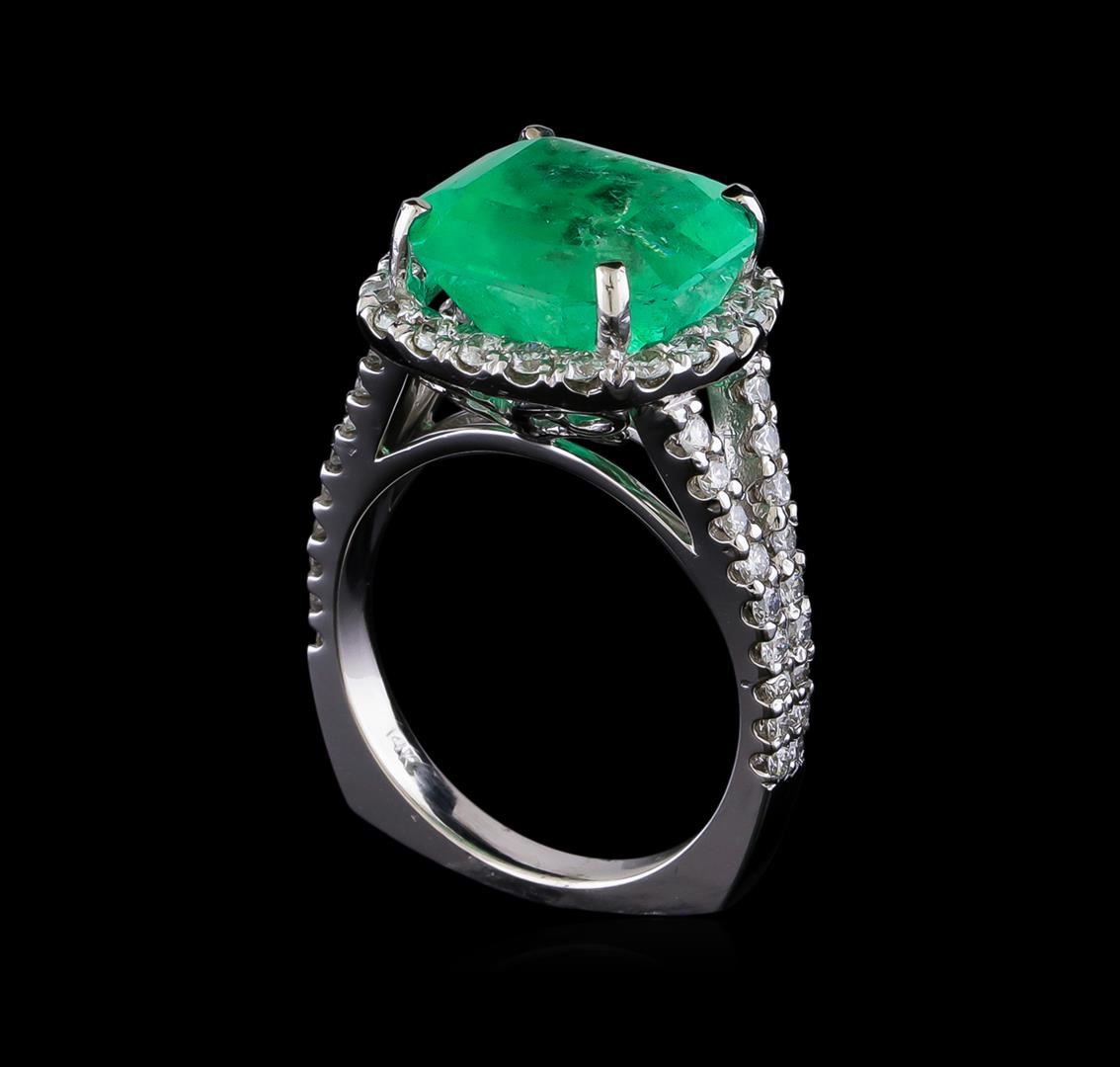 One electronically tested 14KT white gold lady's cast fashion ring with a split shank basket halo with a bright polish finish. The featured lady's ring has a European shank measuring 2.56 millimeters in width. Identified with markings of "14K". Condition is new, good workmanship. Containing: One prong set square emerald step cut natural emerald, measuring 11.52 x 11.27 x 8.64mm, (depth est.) approximate weight of 6.60ct., clarity is heavily included, medium light, moderately strong, green color, (GIA G 4/4), cut is good. Transmitting light somewhat diffusely, transparent to translucent. Colored gemstones are presumed to have been subjected to commonly used enhancement processes. Indications of oil residue. Graded in the setting. Twenty prong set round brilliant cut diamonds, measuring 1.70 - 1.65 x 1.06mm (depth est.) approximate total weight of 20 Stones = 0.38ct. Graded in the setting. Clarity: VS-2 to SI-2. Color: G - Good Thirty-Six prong set round brilliant cut diamonds, measuring 1.60 - 1.30 x 0.90mm (depth est.) approximate total weight of 36 Stones = 0.41ct. Graded in the setting. Clarity: SI-1 to SI-2. Color: G - Good. Total Weight of Colored Stones 6.60ct. Total Weight of Diamonds 0.79ct. Total Weight of Ring 6.80gm. GAS Appraised at $13,730.00.