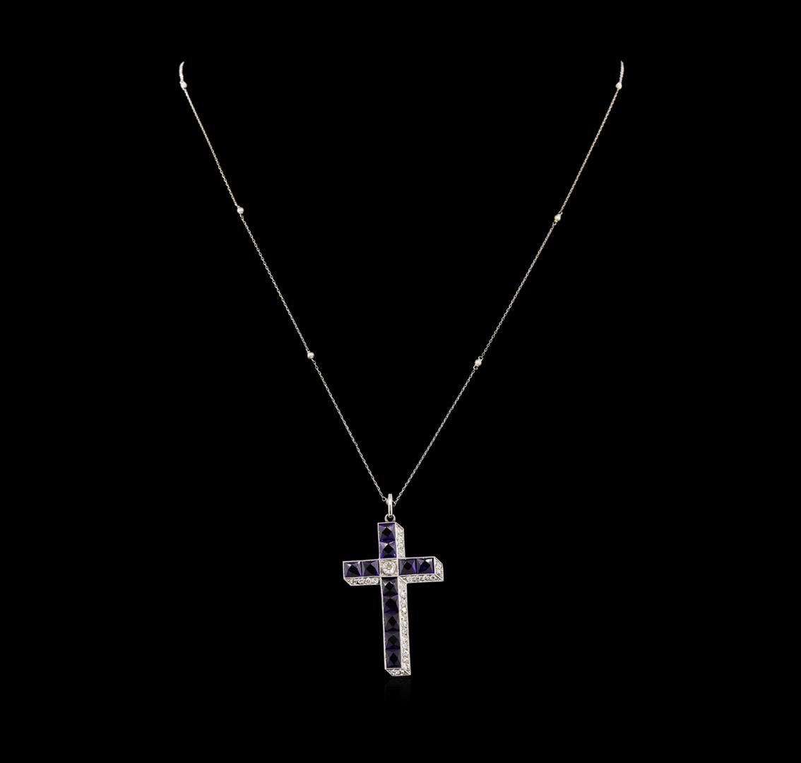 One electronically tested 10KT white gold ladies cast & assembled lab created sapphire & diamond cross pendant with chain. The pendant features a lab created sapphire ribbon and diamond trim cross completed by an oval bail. The pendant is supported by a nineteen and one-half inch length 14KT white gold chain with seed pearl stations, terminating in a spring ring clasp. Bright polish finish with milgrain detailing. Condition is good. Containing: Eleven channel set square step cut laboratory created blue sapphires, measuring 4.50 x 4.50 x 2.83mm, approximate total weight of 6.60ct., clarity is eye clean, type II, dark, moderately strong, blue color, (GIA B 7/4), cut is good. Transmitting light with no distortion, transparent. Measurements & the color grade are an average for the group. Graded in the setting. One bezel set transitional cut diamond, measuring 3.00. - 3.00. x 1.70mm (depth est.) approximate weight of 0.09ct. Graded in the setting. Clarity: SI-2 . Color: H Twenty-Eight prong set single cut diamonds, measuring 1.80 - 1.60 x 1.02mm (depth est.) approximate total weight of 28 Stones = 0.50ct. Graded in the setting. Clarity: SI-1 to I-1 . Color: G - I Nine seed pearls, 1.0mm in size to 2.0mm in size. The pearls are white in color with a very good luster, near round to off round, lightly blemished Graded in the setting. A seed pearl is a small natural pearl, formed in either a saltwater oyster or fresh water mussel, that is usually less the a one-quarter grain in weight and smaller then 2mm in size and off-round in shape. In jewelry they are used as decorative borders, tiny accents in small patterns or in larger clusters woven together to make up an entire piece of jewelry. One of the most historically famous examples of seed pearl jewelry is that of a seed pearl suite (a necklace and two matching bracelets) purchased on April 28, 1862 from Tiffany and Co. for Mary Todd Lincoln from President Abraham Lincoln to wear to the first Lincoln inaugural ball.. Total Weight of Colored Stones 6.60ct.. Total Weight of Diamonds 0.59ct.. Total Weight of Cross Pendant With Chain 6.93gm. AIG Appraised at $2,175.00.