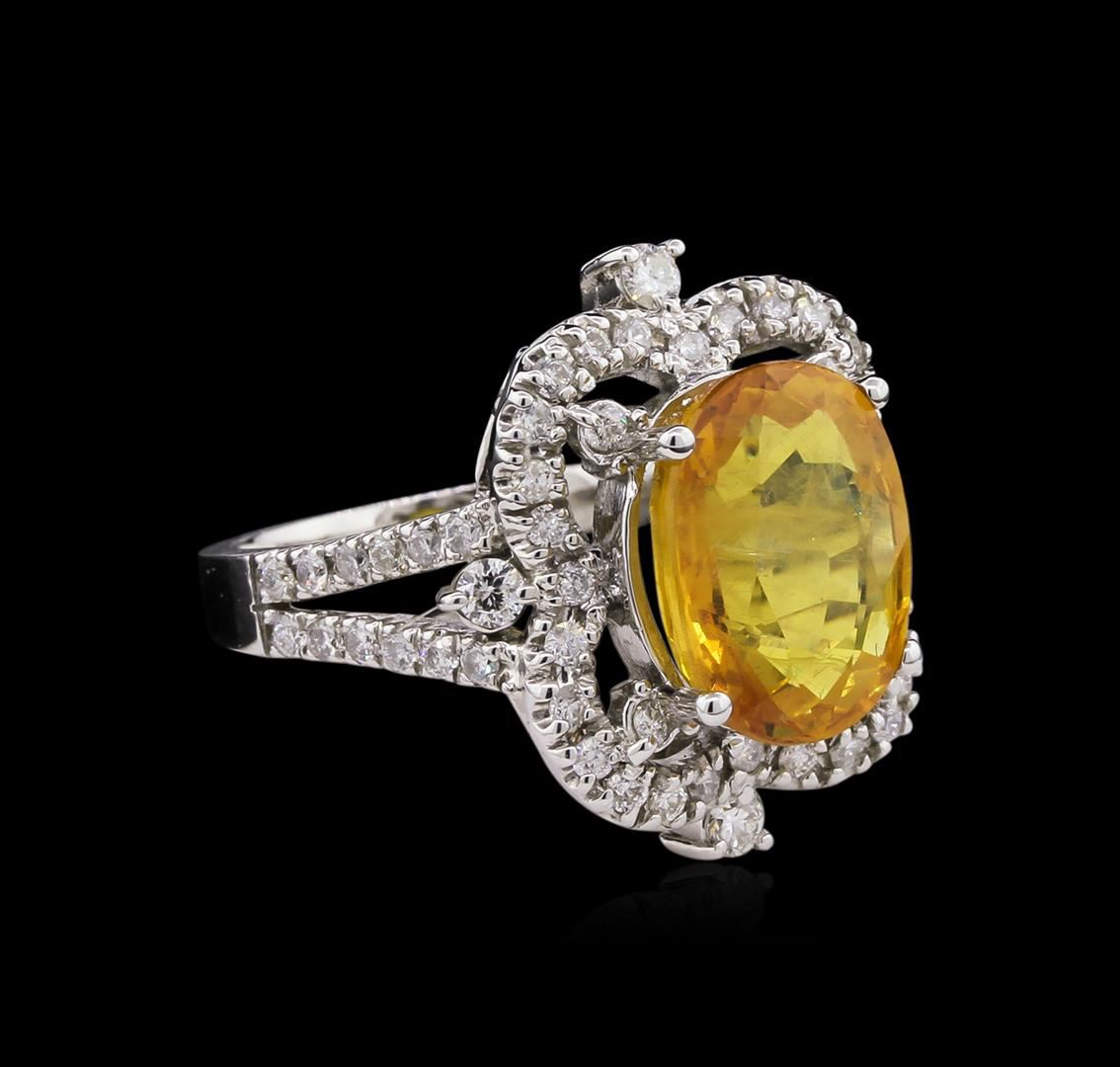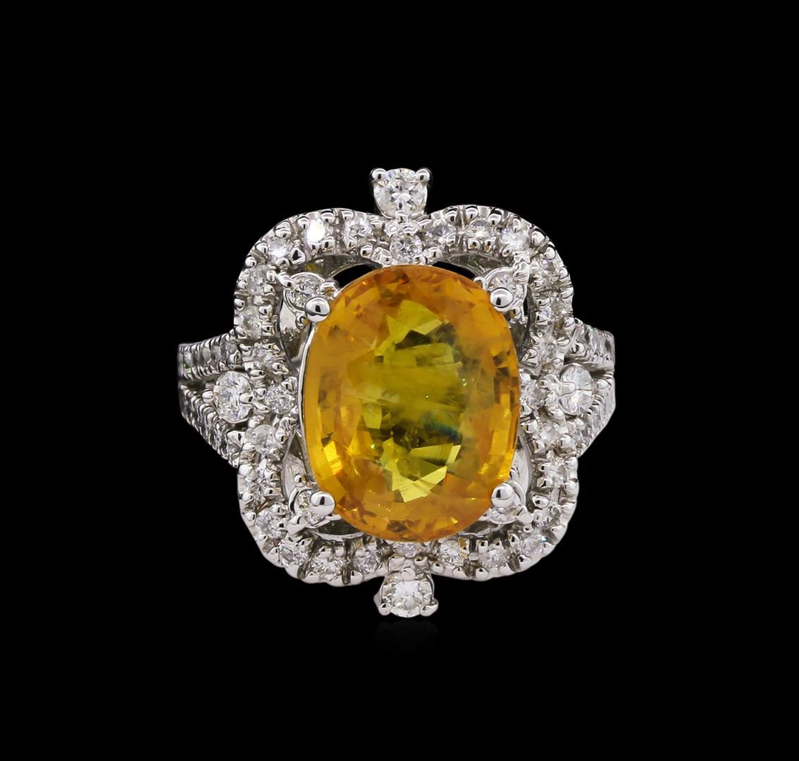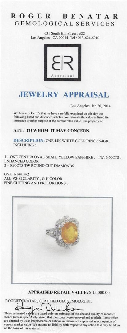 One center oval shape yellow sapphire, TW: 6.60CTS Enhanced Color. 0.90CTS TW round cut diamonds. All VS-SI Clarity, G-H Color Fine Cutting and Proportions. RBGS Appraised at $15,000.00.