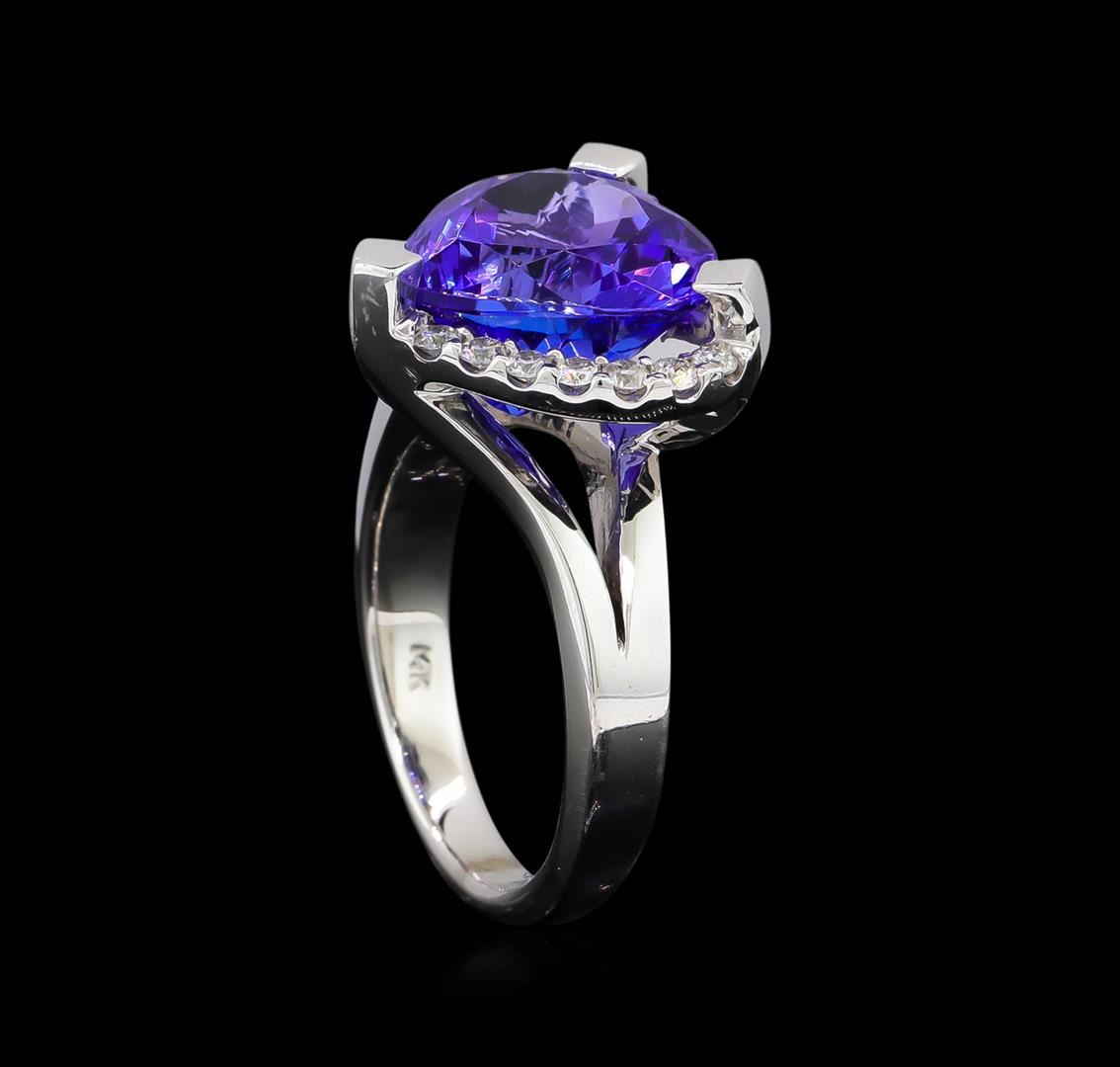 One electronically tested 14KT white gold lady's cast heart shape ring with a split shank halo with a bright polish finish. The featured lady's ring has a shank measuring 2.96 millimeters wide. Identified with markings of "14K". Condition is new, good workmanship. Containing: One prong set heart modified brilliant cut natural tanzanite, measuring 11.97 x 11.40 x 7.71mm, approximate weight of 6.60ct., clarity is slightly included, type I, medium, moderately strong, violetish blue color, (GIA vB 5/4), cut is very good. Transmitting light with no distortion, transparent. Colored gemstones are presumed to have been subjected to commonly used enhancement processes. Graded in the setting. Nineteen prong set round brilliant cut diamonds, measuring 1.80 - 1.75 x 1.10mm (depth est.) approximate total weight of 19 Stones = 0.40ct. Graded in the setting. Clarity: SI-1 to SI-2. Color: H - I. Cut Good. Total Weight of Colored Stones 6.60ct. Total Weight of Diamonds 0.40ct. Total Weight of Ring 9.00gm. GAS Appraised at $12,405.00.