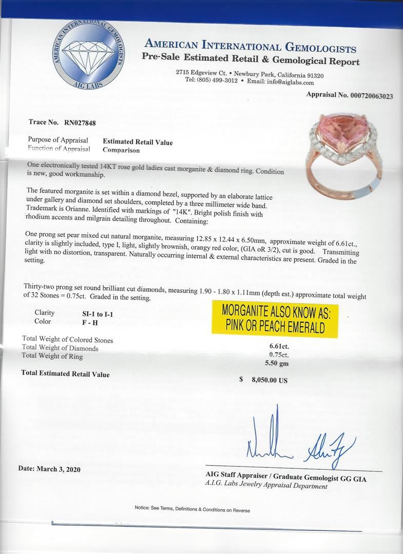 One 6.61ct Morganite and Diamond ring - 14KT Rose Gold. AIG certified. See Appraisal for more details. AIG Appraised.