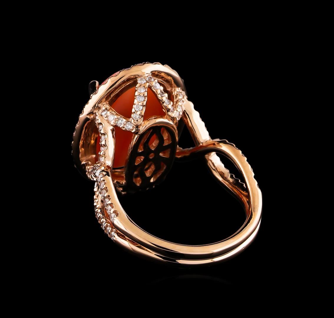 One electronically tested 14KT rose gold ladies cast coral and diamond ring with a bright polish finish. The featured coral cabochon is set within a diamond bezel supported by a diamond set under gallery and stylized diamond split shoulders, completed by a three millimeter wide grooved band. Identified with markings of "14K". Condition is new, good workmanship. Containing: One prong set oval cabochon cut natural salmon coral, measuring 15.50 x 11.70 x 5.10mm, approximate weight of 6.62ct., medium, very slightly brownish, orangy red color, (GIA oR 5/3), cut is good. Transmitting light very diffusely, opaque. Naturally occurring internal & external characteristics are present. Graded in the setting. Salmon Coral is formed undersea by microscopic animals called coral polyps. These tiny creatures form minute, hard shells. As a colony grows, it takes on complex branching, tree-like forms which allows the maximum number of polyps to be fed by the nutrients in the water. It grows about one quarter inch per year. This color of coral is commonly treated to improve or change the color and stability. Evidence that may confirm this is typically lacking. One Hundred Twenty-Eight prong set round brilliant cut diamonds, measuring 1.20 - 1.20 x 0.72mm (depth est.) approximate total weight of 128 Stones = 0.81ct. Graded in the setting. Clarity: SI-2 to I-2. Color: G - I. Total Weight of Colored Stones 6.62ct. Total Weight of Diamonds 0.81ct. Total Weight of Ring 8.80gm. AIG Appraised at $5,785.00.