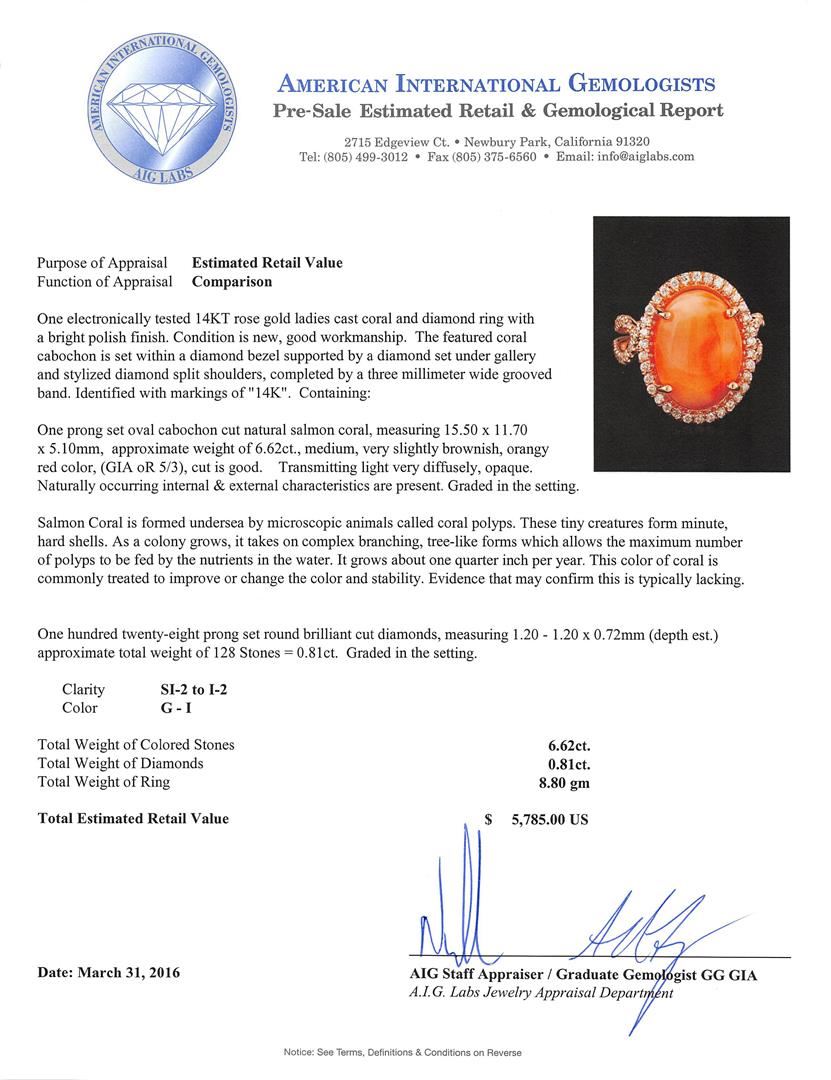 One electronically tested 14KT rose gold ladies cast coral and diamond ring with a bright polish finish. The featured coral cabochon is set within a diamond bezel supported by a diamond set under gallery and stylized diamond split shoulders, completed by a three millimeter wide grooved band. Identified with markings of "14K". Condition is new, good workmanship. Containing: One prong set oval cabochon cut natural salmon coral, measuring 15.50 x 11.70 x 5.10mm, approximate weight of 6.62ct., medium, very slightly brownish, orangy red color, (GIA oR 5/3), cut is good. Transmitting light very diffusely, opaque. Naturally occurring internal & external characteristics are present. Graded in the setting. Salmon Coral is formed undersea by microscopic animals called coral polyps. These tiny creatures form minute, hard shells. As a colony grows, it takes on complex branching, tree-like forms which allows the maximum number of polyps to be fed by the nutrients in the water. It grows about one quarter inch per year. This color of coral is commonly treated to improve or change the color and stability. Evidence that may confirm this is typically lacking. One Hundred Twenty-Eight prong set round brilliant cut diamonds, measuring 1.20 - 1.20 x 0.72mm (depth est.) approximate total weight of 128 Stones = 0.81ct. Graded in the setting. Clarity: SI-2 to I-2. Color: G - I. Total Weight of Colored Stones 6.62ct. Total Weight of Diamonds 0.81ct. Total Weight of Ring 8.80gm. AIG Appraised at $5,785.00.