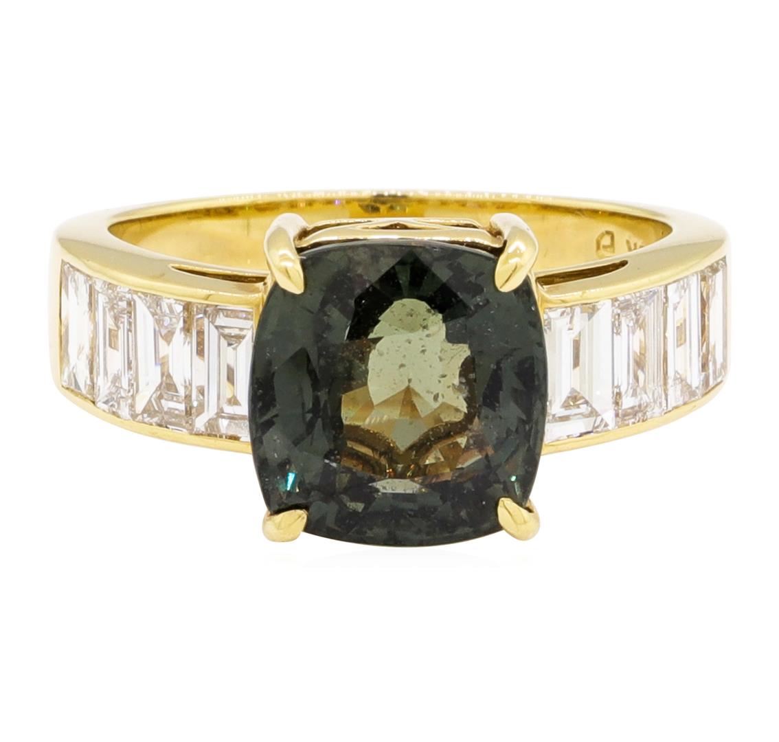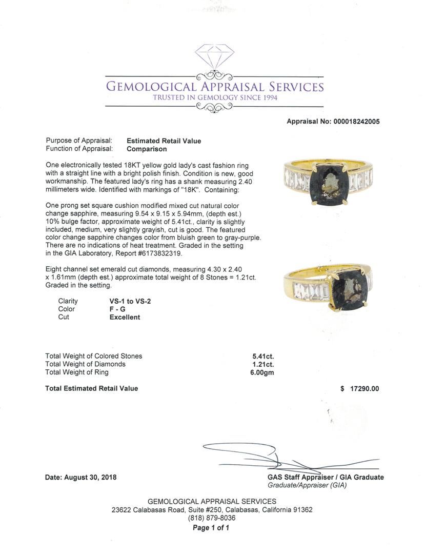 One electronically tested 18KT yellow gold lady's cast fashion ring with a straight line with a bright polish finish. The featured lady's ring has a shank measuring 2.40 millimeters wide. Identified with markings of '18K'. Condition is new, good workmanship. Containing: One prong set square cushion modified mixed cut natural color change sapphire, measuring 9.54 x 9.15 x 5.94mm, (depth est.) 10%. bulge factor, approximate weight of 5.41ct., clarity is slightly included, medium, very slightly grayish, cut is good. The featured color change sapphire changes color from bluish green to gray-purple. There are no indications of heat treatment. Graded in the setting in the GIA Laboratory, Report #6173832319. Eight channel set emerald cut diamonds, measuring 4.30 x 2.40 x 1.61mm (depth est.) approximate total weight of 8 Stones = 1.21ct. Graded in the setting. Color F - G Clarity VS-1 to VS-2 Cut Excellent. Total Weight of Colored Stones 5.41ct.. Total Weight of Diamonds 1.21ct.. Total Weight of Ring 6.00gm GAS Appraised at $17290.00. GAS Appraised.