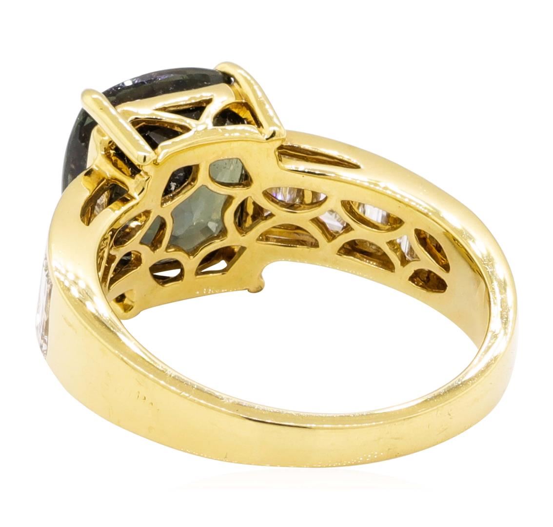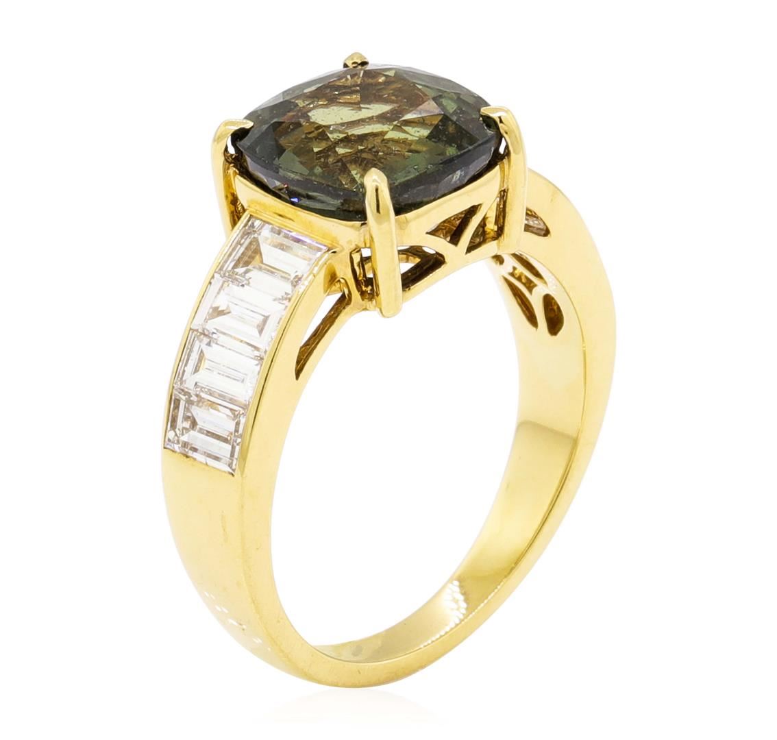 One electronically tested 18KT yellow gold lady's cast fashion ring with a straight line with a bright polish finish. The featured lady's ring has a shank measuring 2.40 millimeters wide. Identified with markings of '18K'. Condition is new, good workmanship. Containing: One prong set square cushion modified mixed cut natural color change sapphire, measuring 9.54 x 9.15 x 5.94mm, (depth est.) 10%. bulge factor, approximate weight of 5.41ct., clarity is slightly included, medium, very slightly grayish, cut is good. The featured color change sapphire changes color from bluish green to gray-purple. There are no indications of heat treatment. Graded in the setting in the GIA Laboratory, Report #6173832319. Eight channel set emerald cut diamonds, measuring 4.30 x 2.40 x 1.61mm (depth est.) approximate total weight of 8 Stones = 1.21ct. Graded in the setting. Color F - G Clarity VS-1 to VS-2 Cut Excellent. Total Weight of Colored Stones 5.41ct.. Total Weight of Diamonds 1.21ct.. Total Weight of Ring 6.00gm GAS Appraised at $17290.00. GAS Appraised.