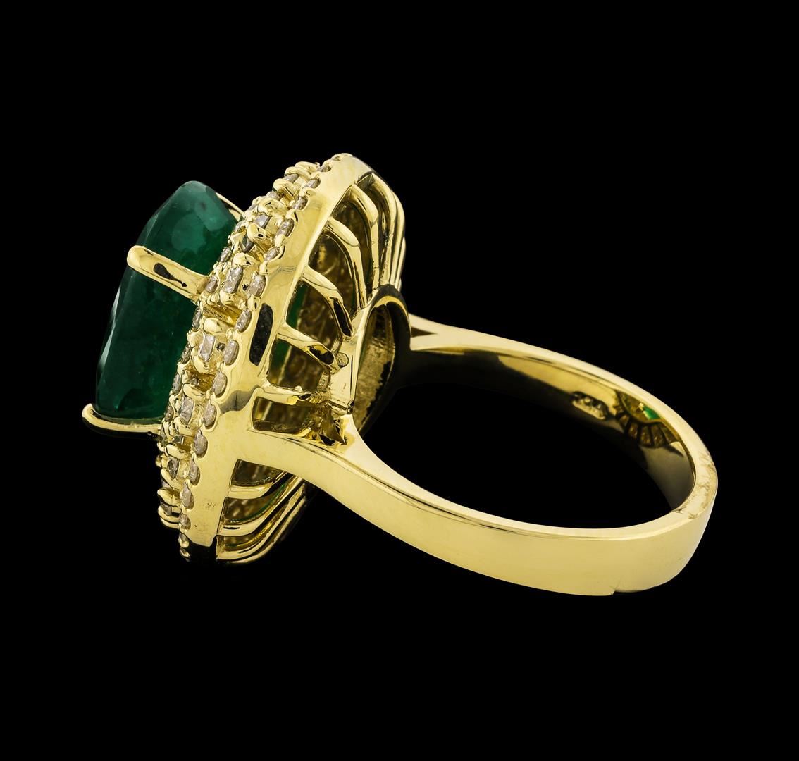 One electronically tested 14KT yellow gold lady's cast fashion ring with a triple basket halo with a bright polish finish. The featured lady's ring has a shank measuring 3.75 millimeters wide. Identified with markings of 'K14'. Condition is new, good workmanship. Containing: One prong set oval modified mixed cut natural emerald, measuring 13.84 x 11.04 x 6.50mm, (depth est.) 15%. bulge factor, approximate weight of 6.63ct., clarity is heavily included, medium dark, moderately strong, green color, (GIA G 6/4), cut is good. Transmitting light somewhat diffusely, semi-transparent to translucent. Naturally occurring internal & external characteristics are present. Indications of oil residue. Colored gemstones are presumed to have been subjected to commonly used enhancement processes. Graded in the setting. Sixteen prong set round brilliant cut diamonds, measuring 2.50 - 2.40 x 1.49mm (depth est.) approximate total weight of 16 Stones = 0.88ct. Graded in the setting. Clarity SI-1 to SI-2. Color: H - I Cut Good Sixty-Two prong set round brilliant cut diamonds, measuring 1.60 - 1.55 x 0.96mm (depth est.) approximate total weight of 62 Stones = 0.90ct. Graded in the setting. Clarity SI-1 to SI-2. Color: G - H Cut Good. Total Weight of Colored Stones 6.63ct.. Total Weight of Diamonds 1.78ct.. Total Weight of Ring 10.90gm GAS Appraised at $12,220.00.